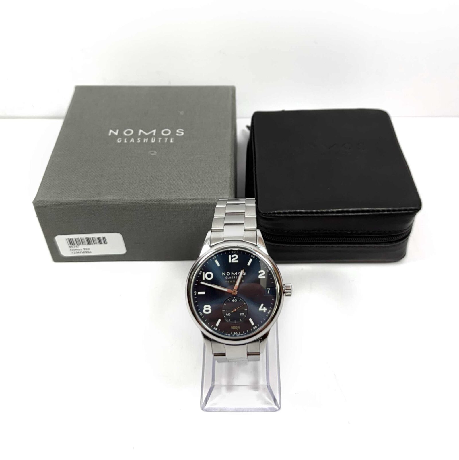 this nomos watch is in excellent condition showing some light signs of surface wear consistent with preowned watches. This comes with its box only as shown in the pictures attached. This watch is in stock and available to ship immediately!