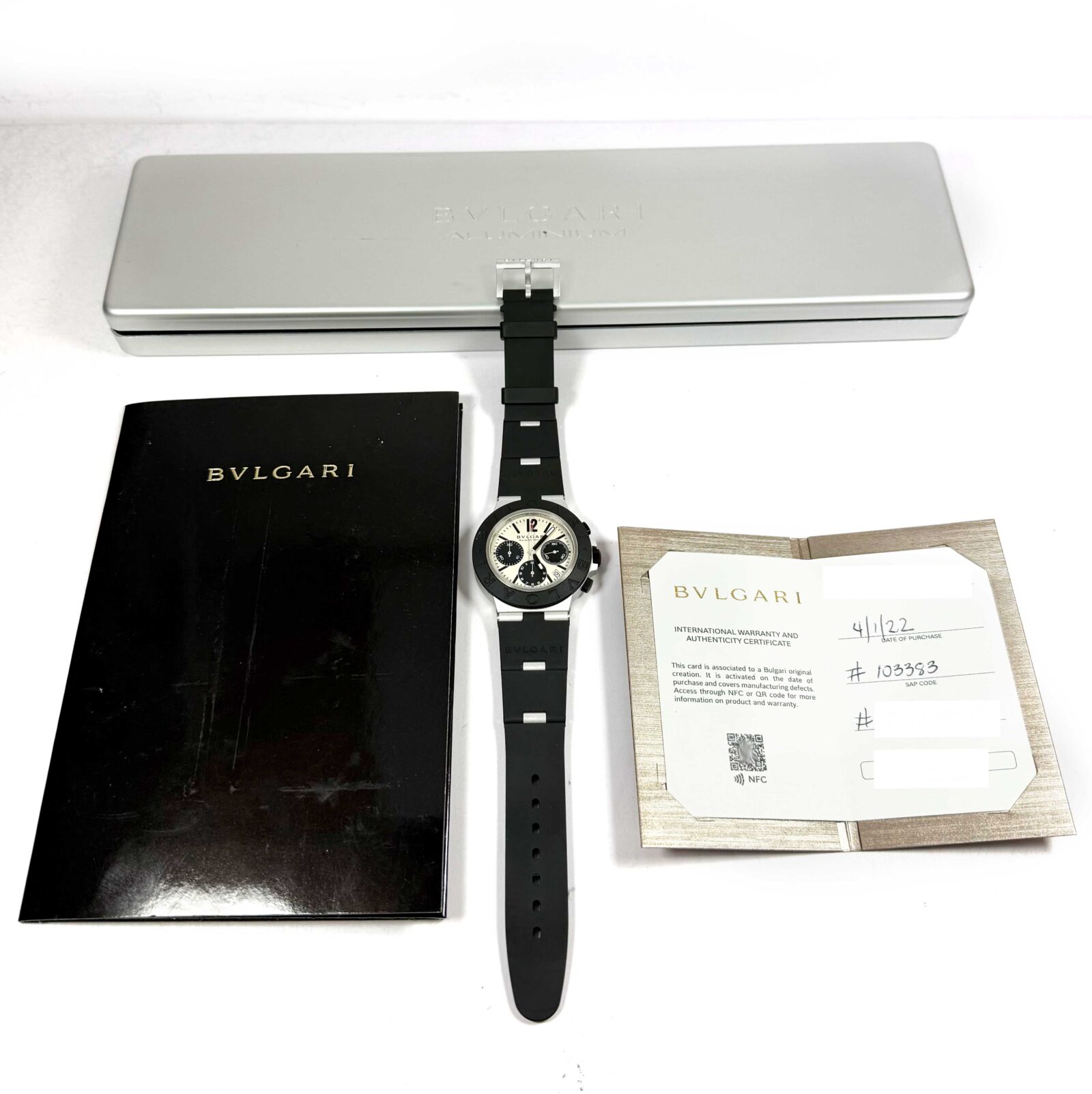 this bulgari watch is new old stock and comes with its box and warranty card dated april 1st, 2022 as shown in the pictures attached. This watch is in stock and available to ship immediately!