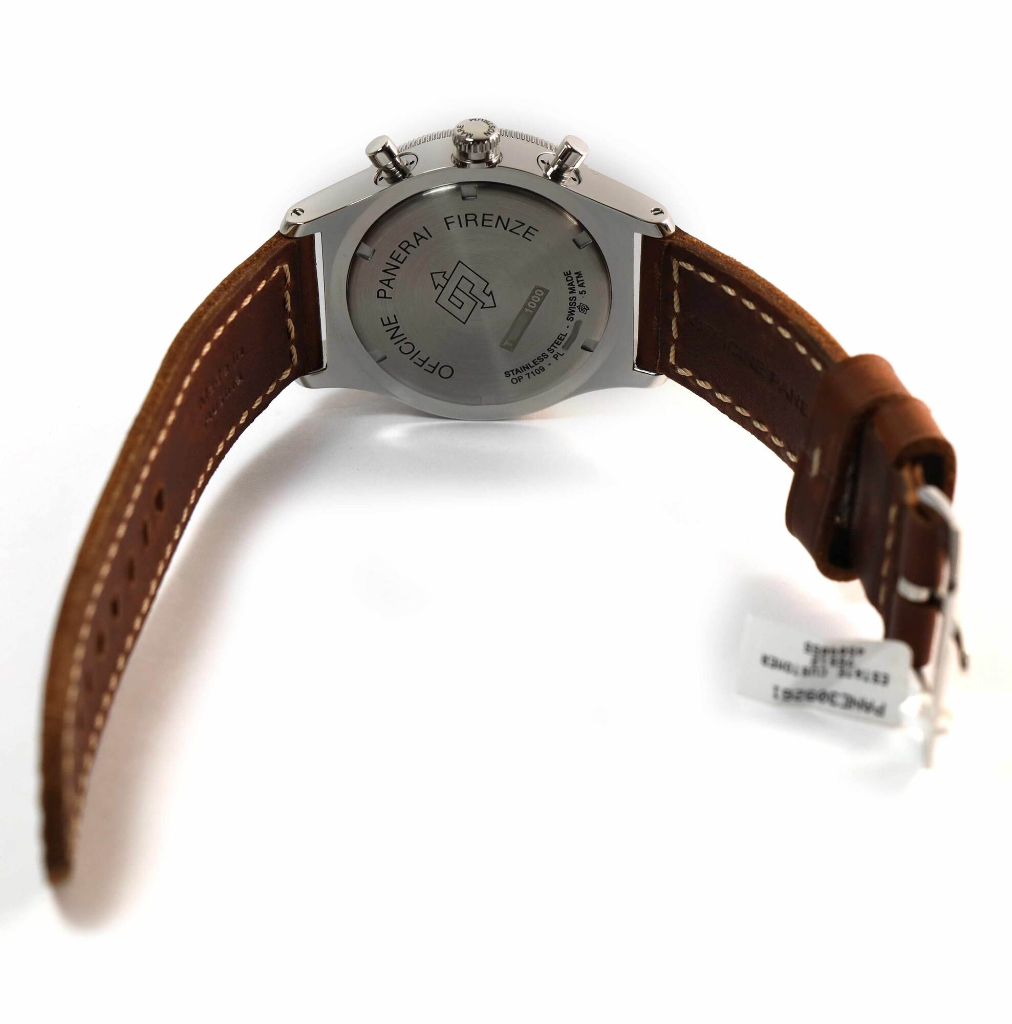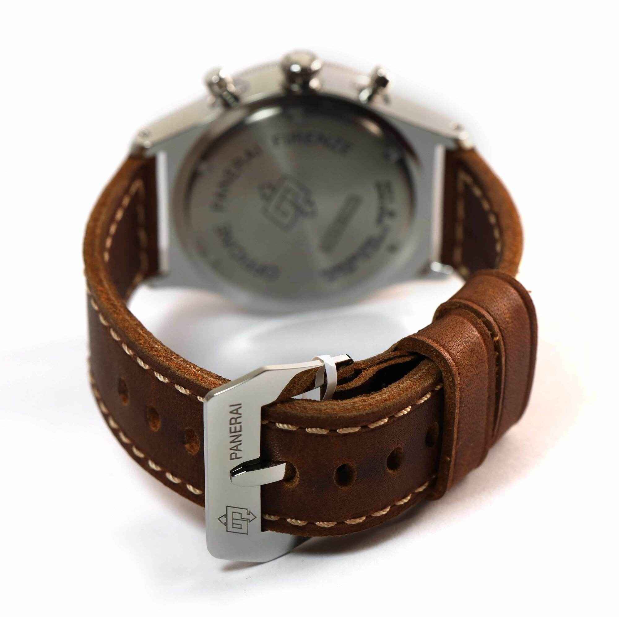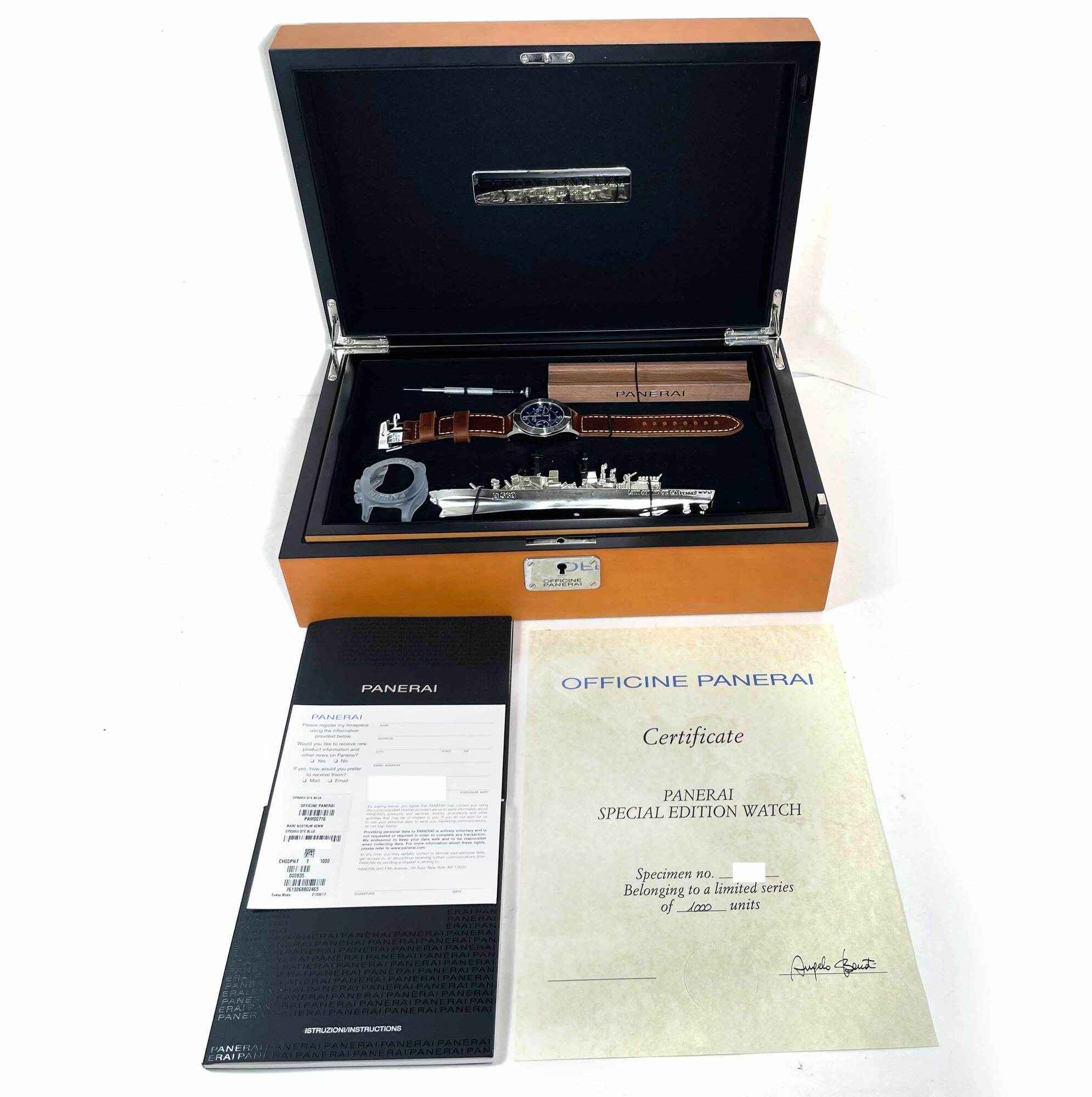 THIS PANERAI IS NOS AND COMES WITH ITS BOX, BOOKLETS, PANERAI MODEL SHIP, PANERAI TOOL, BEZEL PROTECTOR, AND WARRANTY PAPER AS SHOWN IN THE PICTURES ATTACHED. THIS WATCH FEATURES A 42MM STAINLESS STEEL CASE THAT SURROUNDS A BLUE DIAL AND COMES ON A BROWN LE...