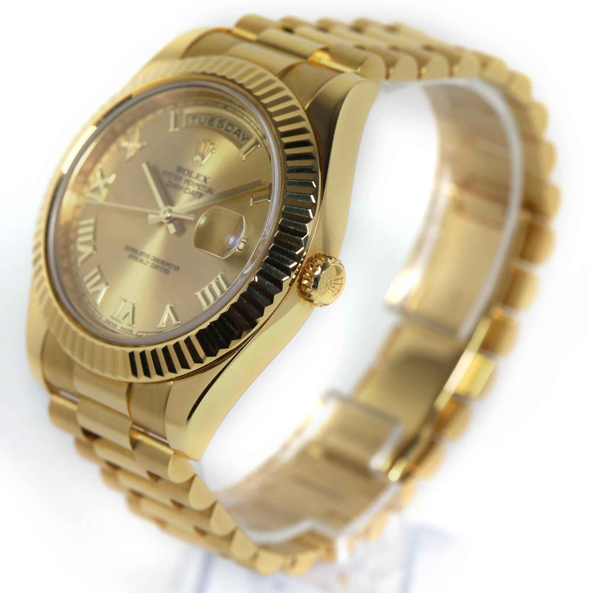 Read Morethis rolex is new and comes with its box, booklets, and warranty card as shown in the pictures attached. This watch features a 41mm gold case that surrounds a champagne dial and comes on an 18k yellow gold president band. This watch is in stock and available to ship immediately!