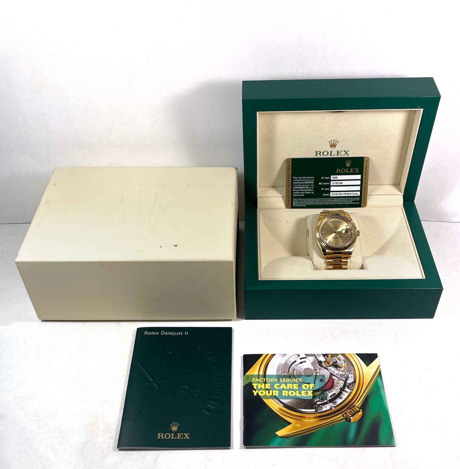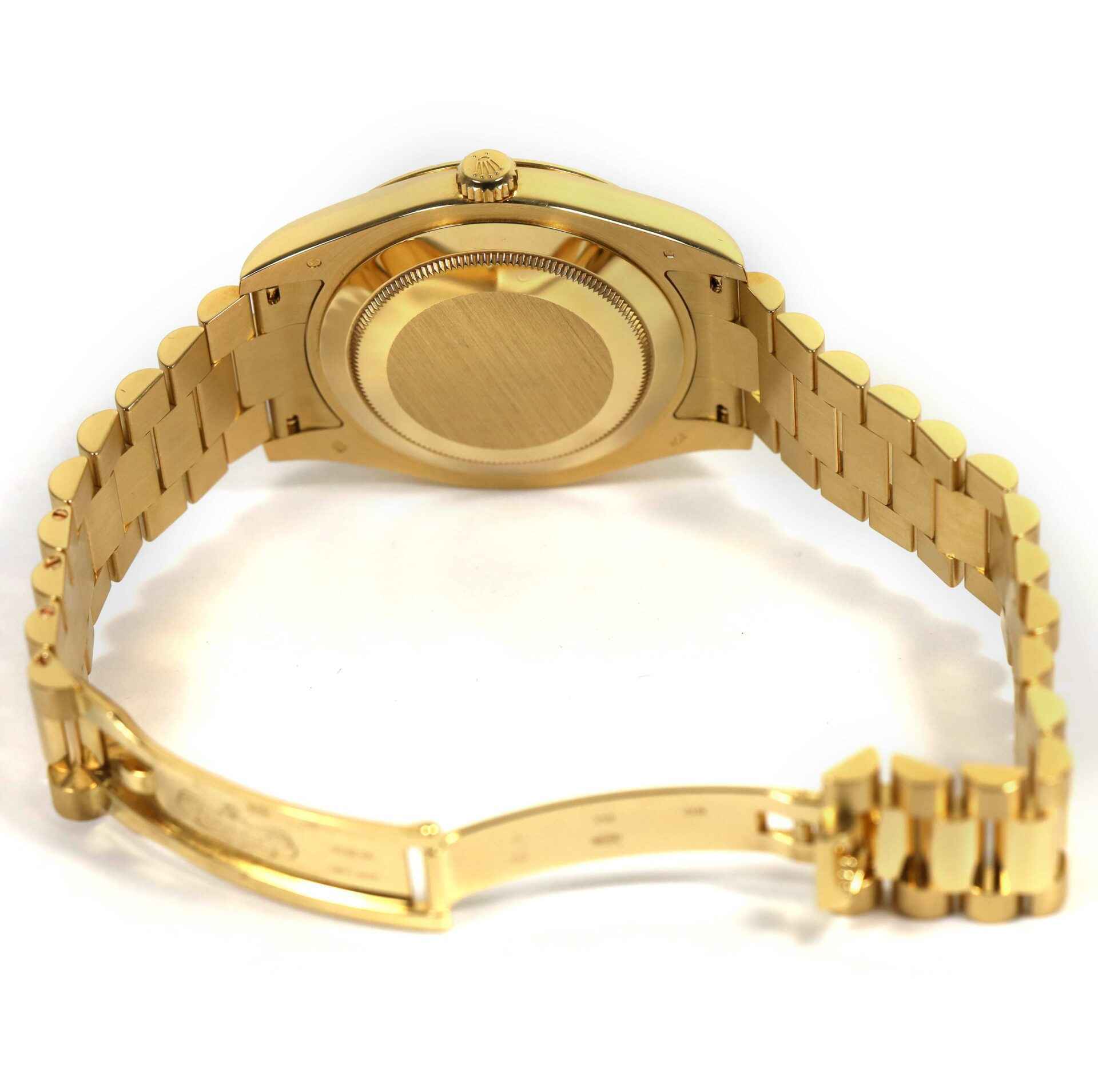 This Rolex is new and comes with its box, booklets, and warranty card as shown in the pictures attached. This watch features a 41mm gold case that surrounds a champagne dial and comes on an 18k yellow gold president band...