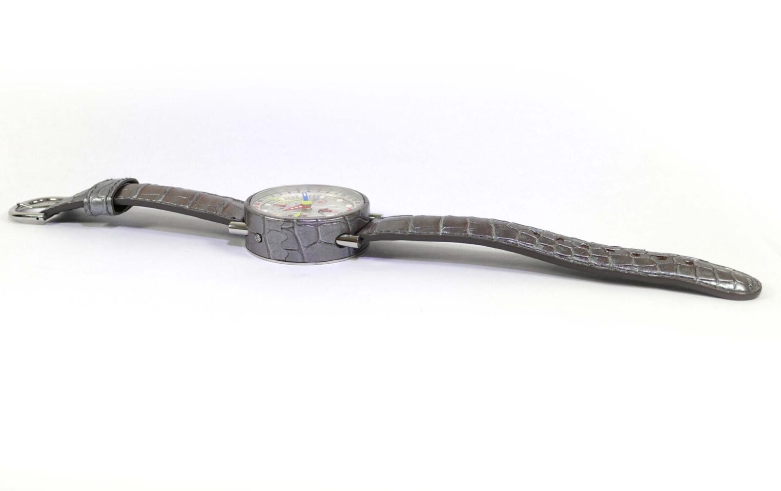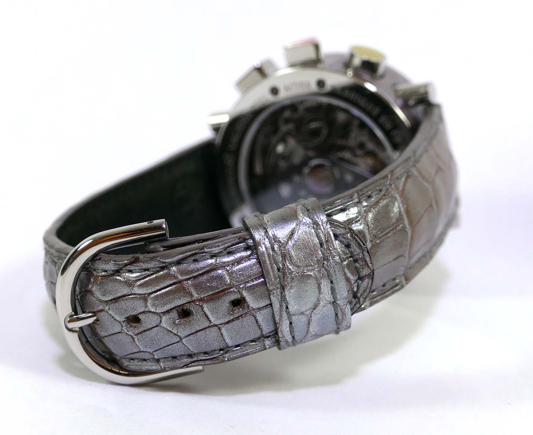 the case is covered in silver crocodile leather, giving the watch a very unique look, and the original strap is an exact matching silver leather crocodile.