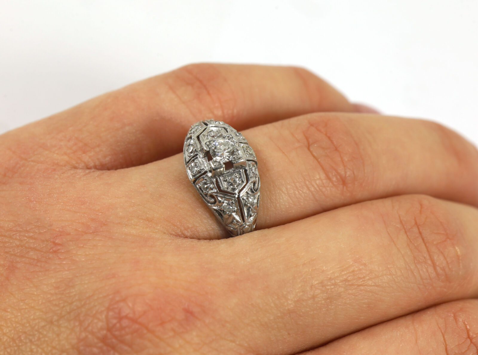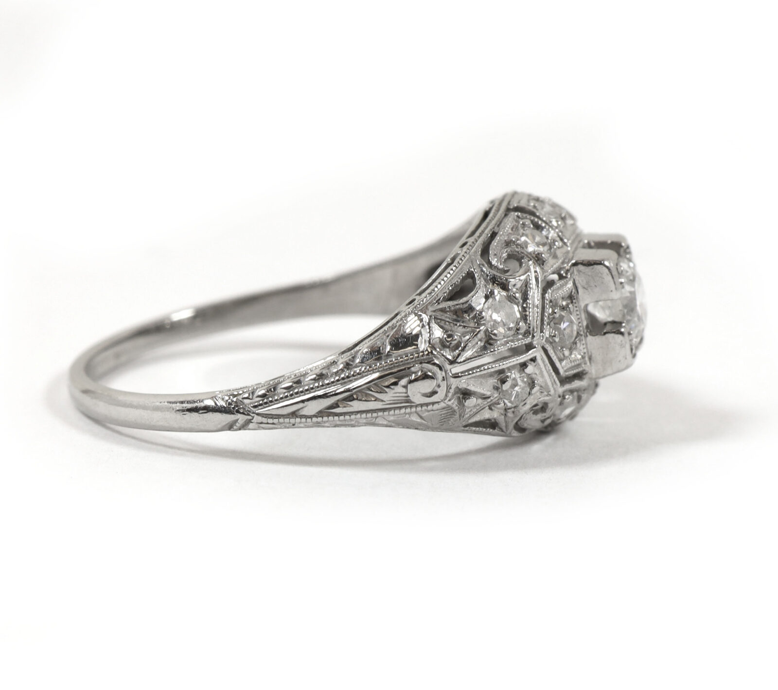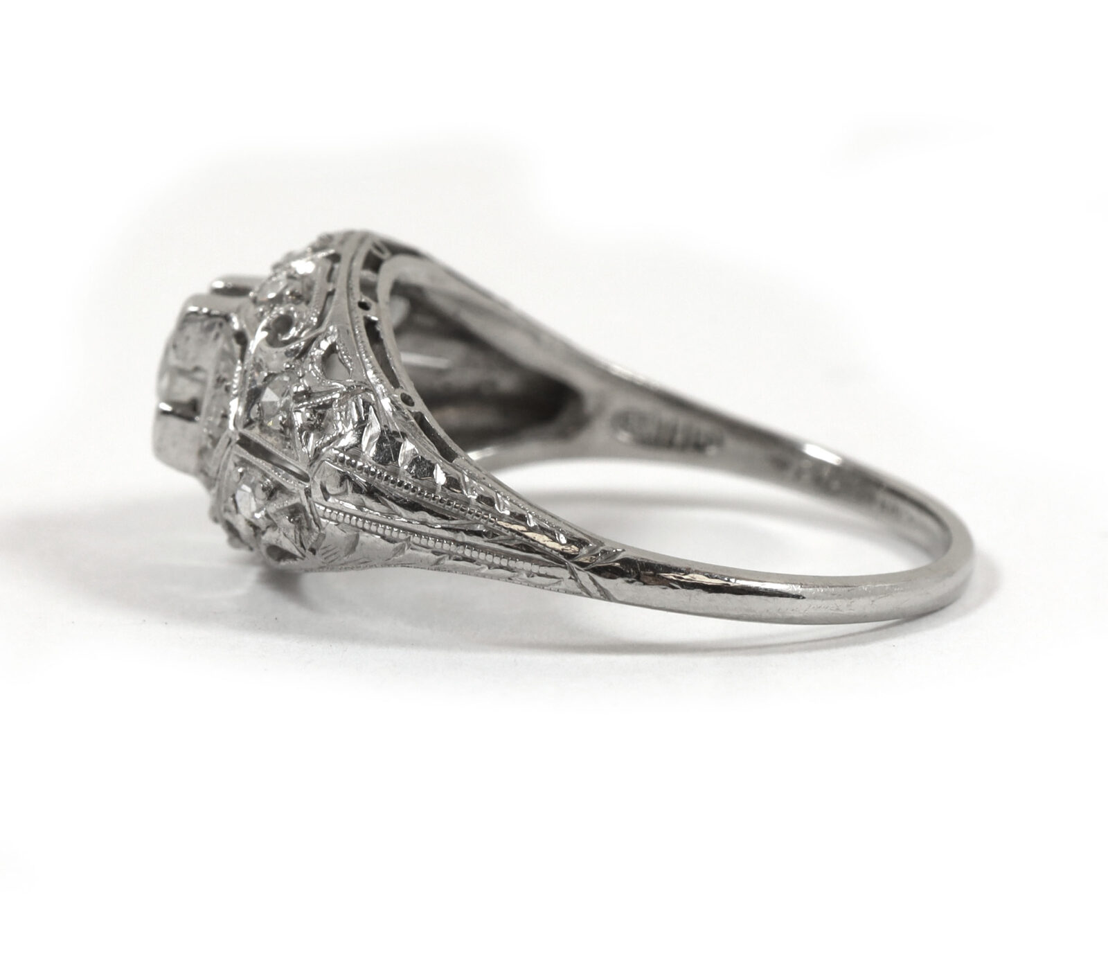 metal: platinum gemstone: old european diamond ring size: 7.5 band width: 1mm center stone gemstone: diamond cut: old european carat weight: 0.20 carat clarity: vvs2 color: i center stone measurements: 3.7mm side stones gemstone: diamond cut: old european side stone carat weight: approximately 0.36 carats total clarity: vss2/si1 color: i buy with confidence from tns diamonds, a trusted and established jeweler with a brick-and-mortar storefront and over 40 years of combined experience in the ethical watch and jewelry trade. At tns diamonds, we are proud to have trusted gia graduate gemologists on staff, ensuring that every piece of jewelry meets the highest standards of quality and craftsmanship. With our expertise and commitment to ethical practices, you can shop with peace of mind knowing you’re receiving a genuine product. If you have any questions or need further assistance, please don’t hesitate to reach out!