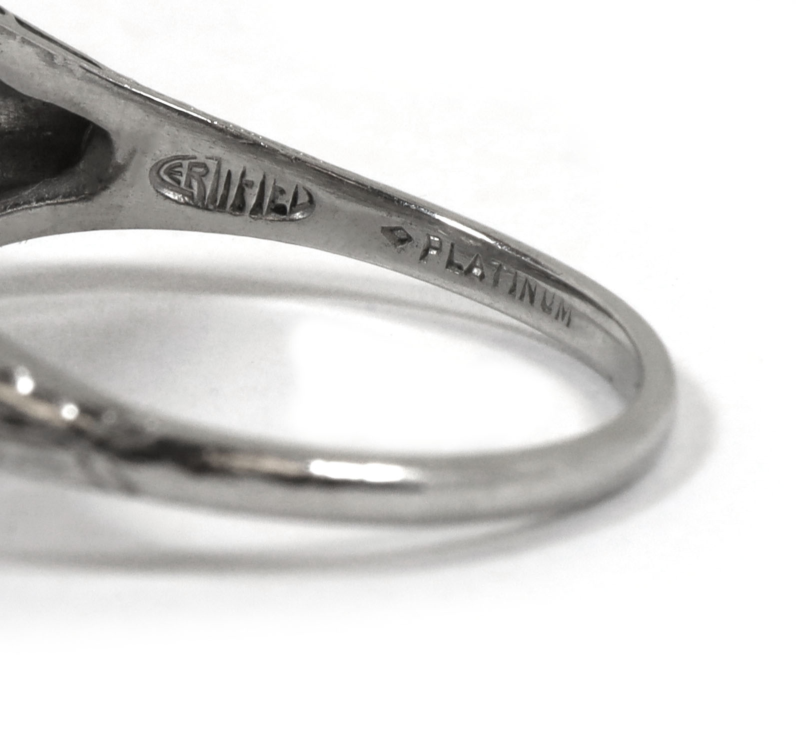 Metal: Platinum Gemstone: Old European Diamond Ring Size: 7.5 Band Width: 1mm Center Stone Gemstone: Diamond Cut: Old European Carat Weight: 0.20 Carat Clarity: VVS2 Color: I Center Stone Measurements: 3.7mm Side Stones Gemstone: Diamond Cut: Old European Sid...