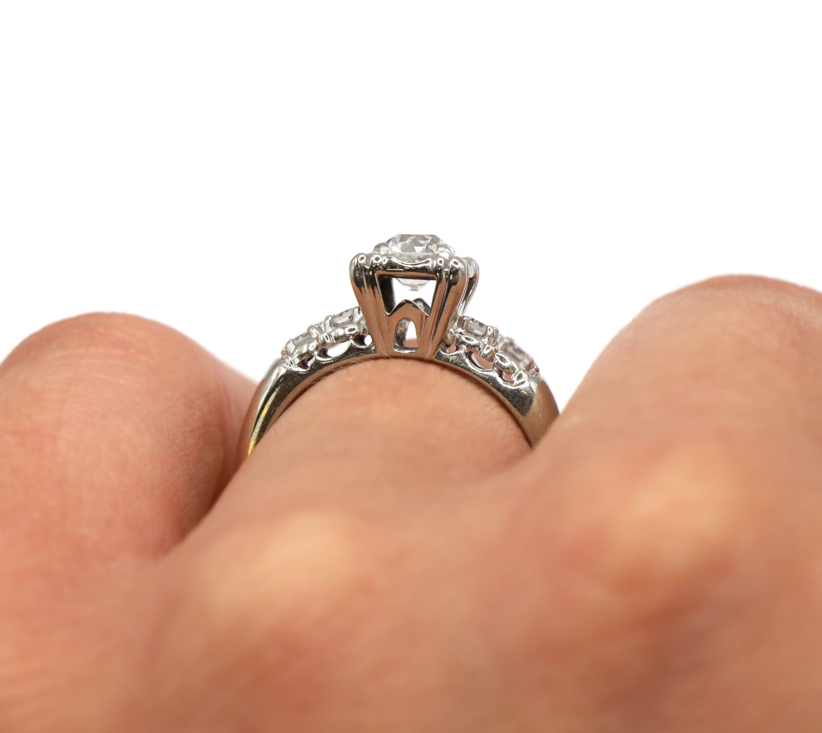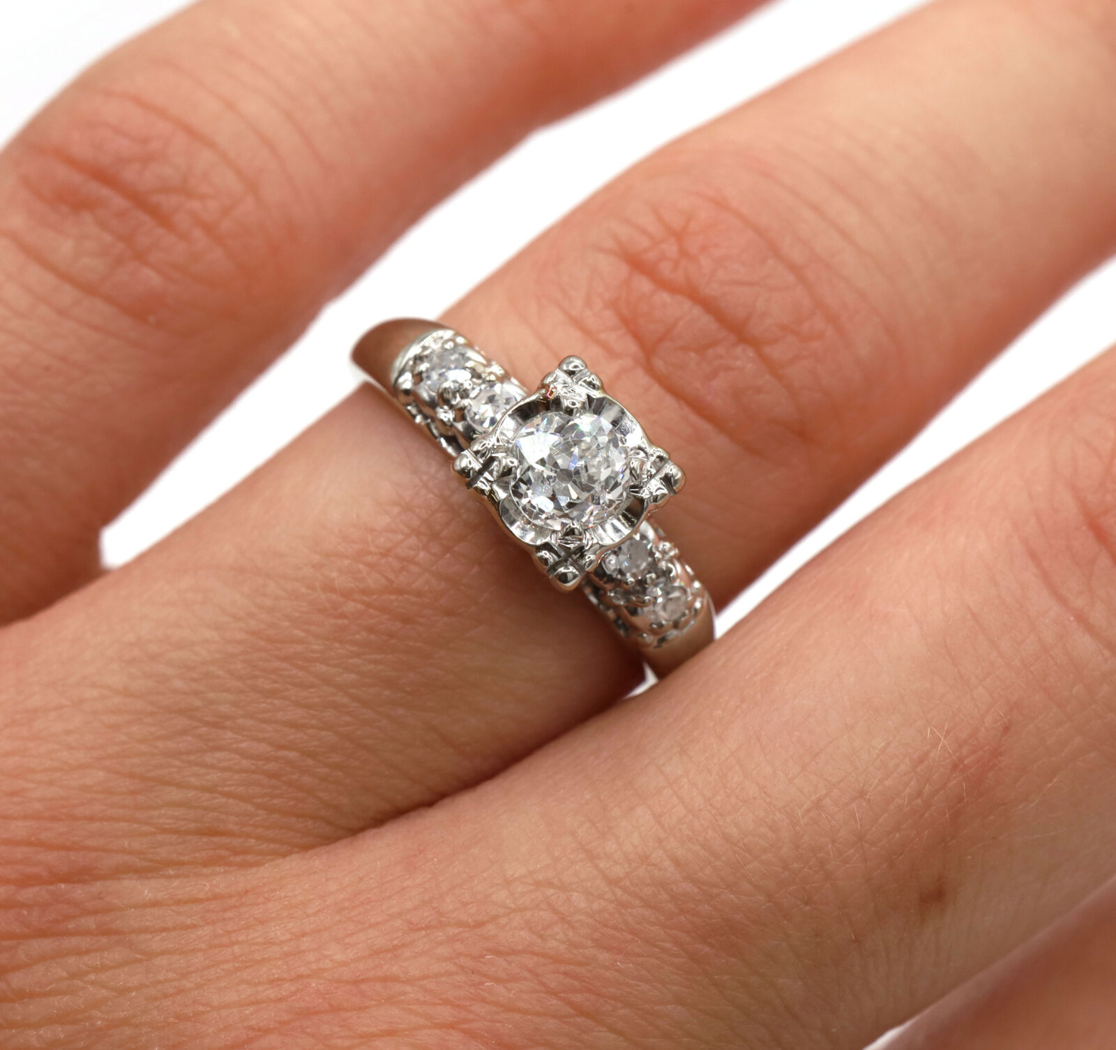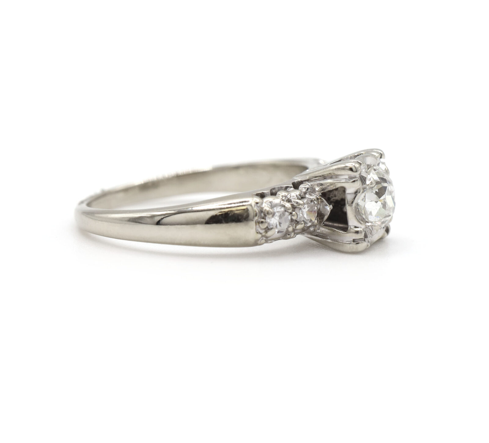 Material: 14k White Gold Size: 7 Gemstone: Diamond Center Stone Carat Weight: 0.46 Carat Side Stone Carat Weight: 0.12 Carat Center Stone Cut: Old European Cut Side Stone Cut: Single Cut Clarity: SI2 Color: G Front Width: 6.3mm Band Width: .86mm We...