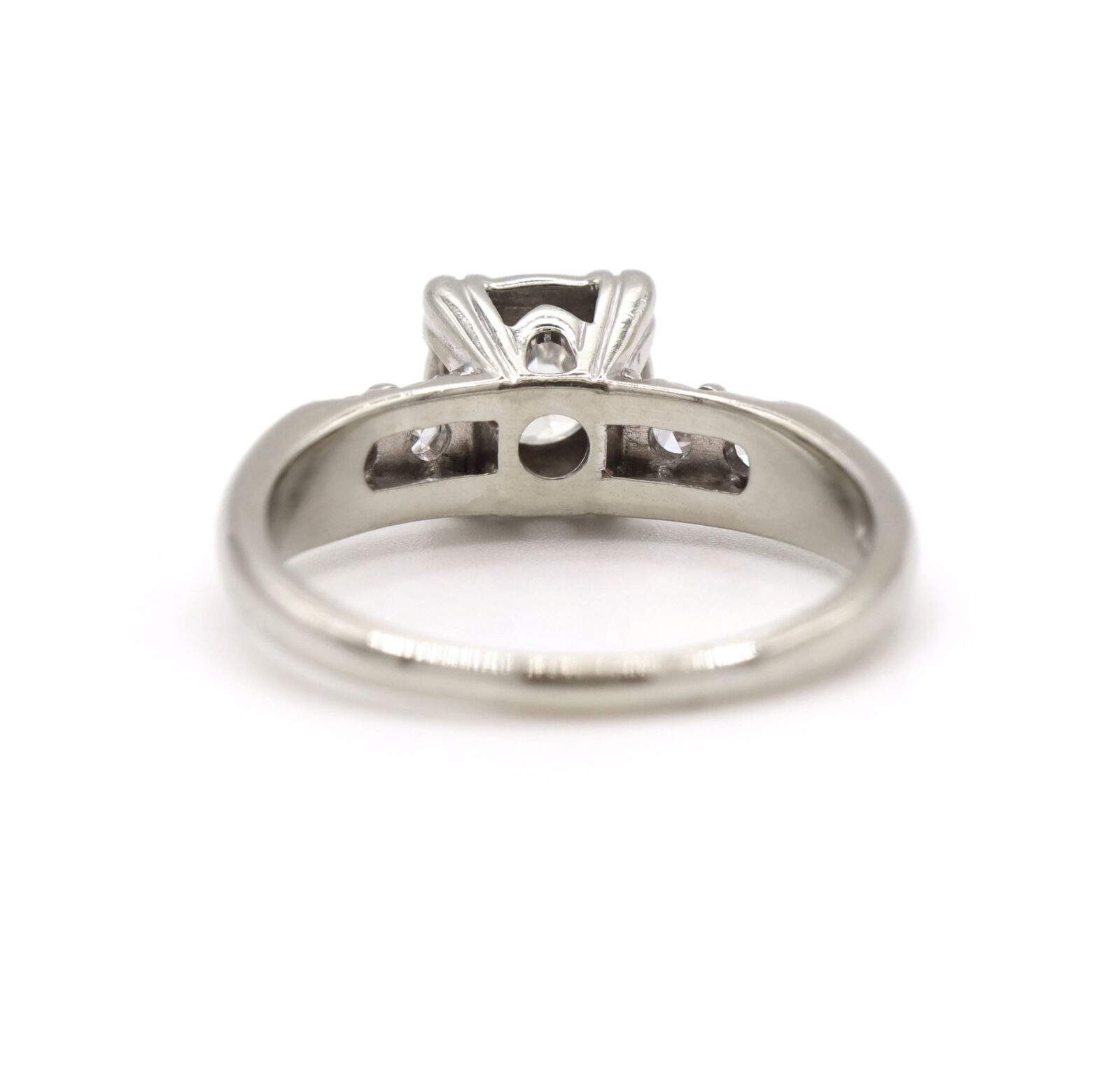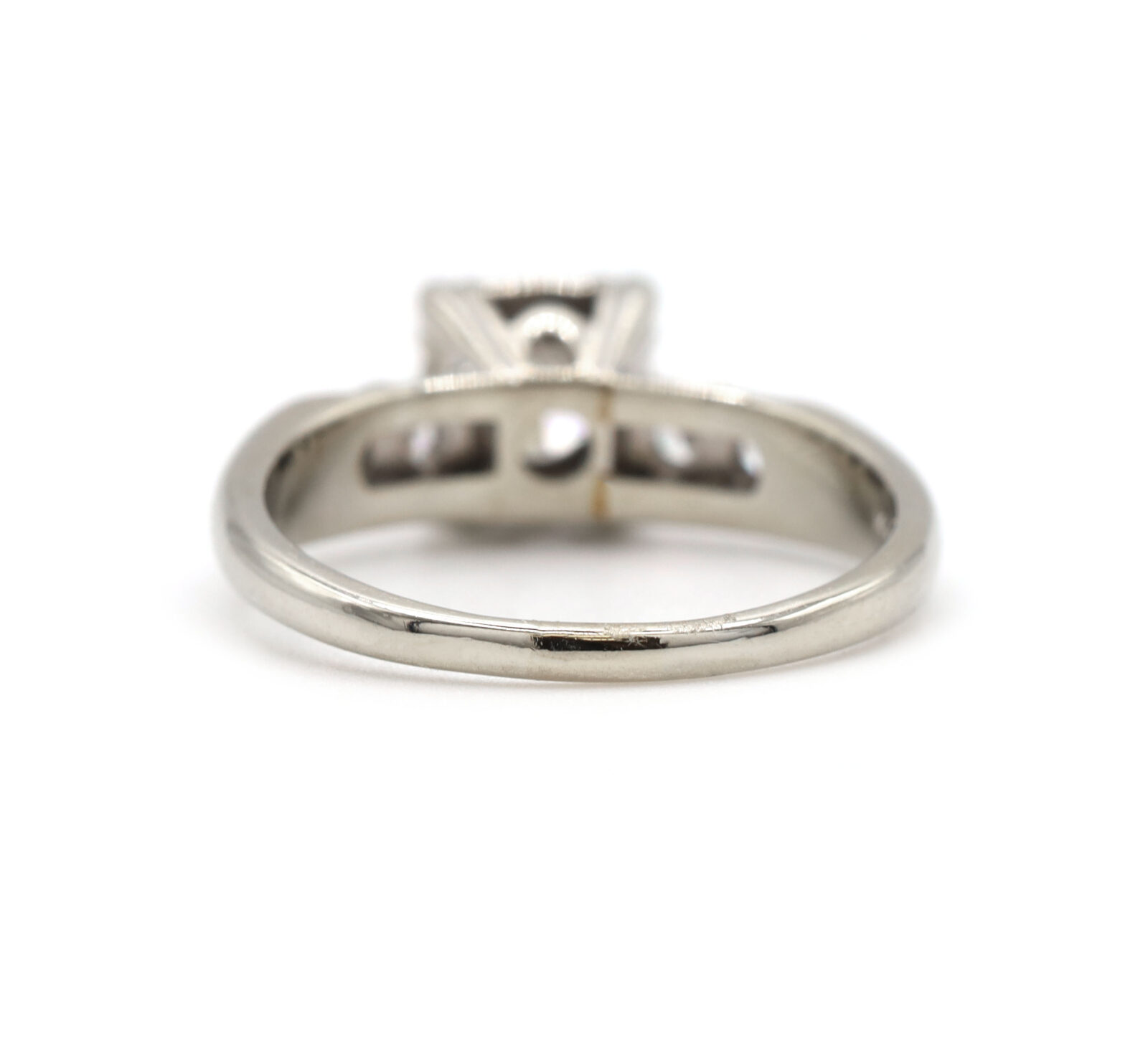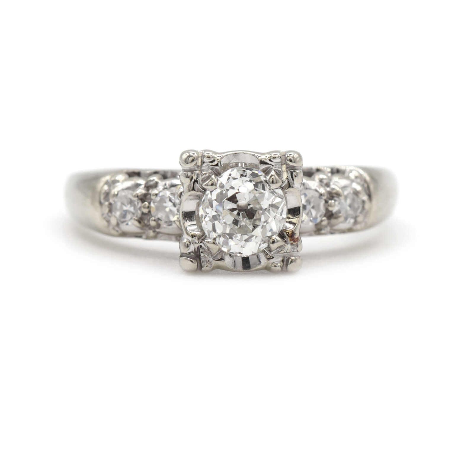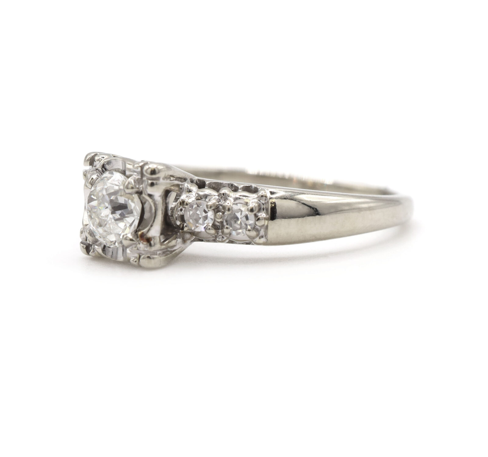 Material: 14k White Gold Size: 7 Gemstone: Diamond Center Stone Carat Weight: 0.46 Carat Side Stone Carat Weight: 0.12 Carat Center Stone Cut: Old European Cut Side Stone Cut: Single Cut Clarity: SI2 Color: G Front Width: 6.3mm Band Width: .86mm We...