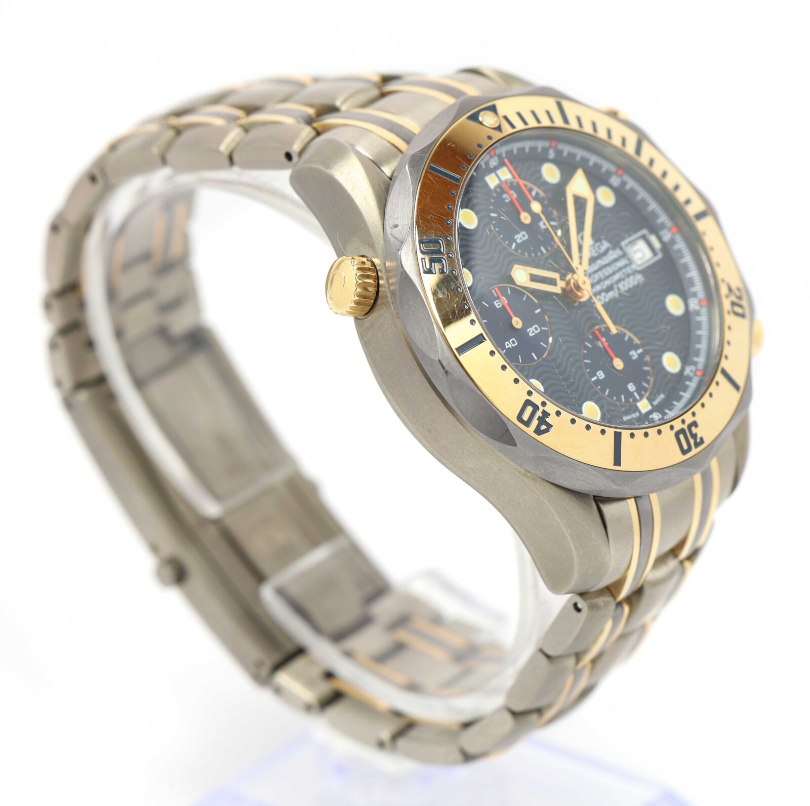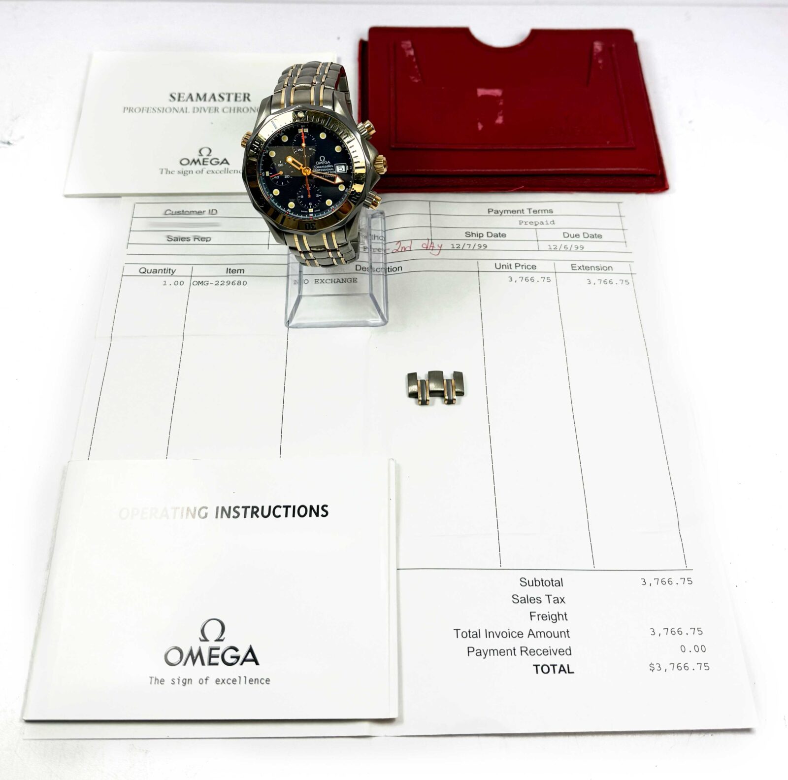 this omega watch is in good overall condition showing signs of surface wear consistent with preowned watches. Please note the crystal on this omega does have some scratches on it as shown. This comes with its booklets and original purchase receipt only and is in stock and available to ship immediately!