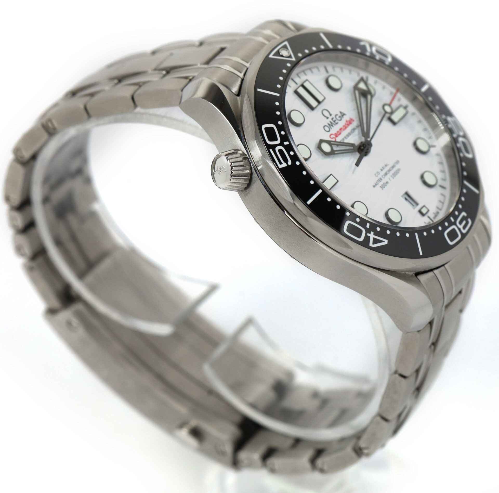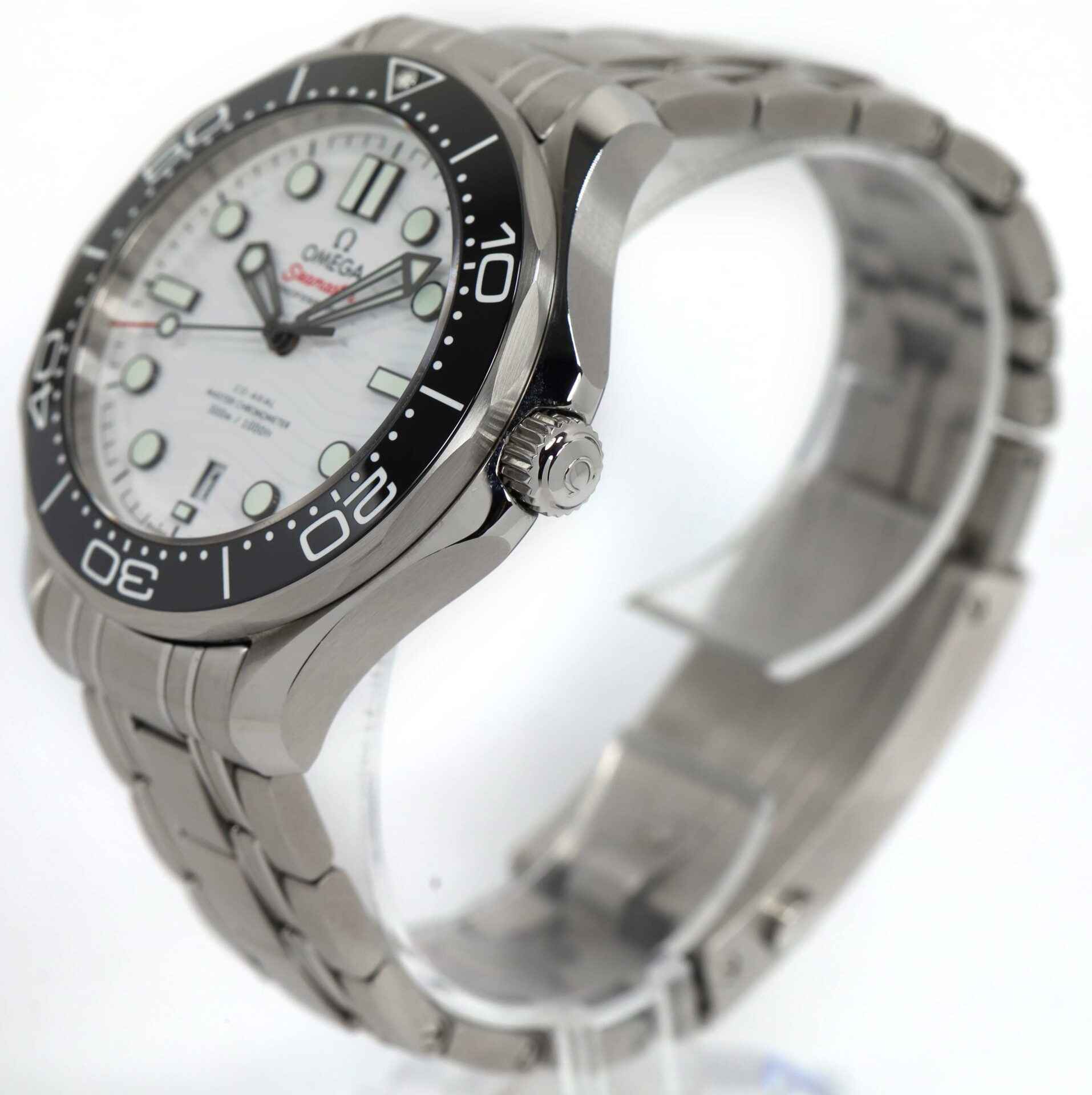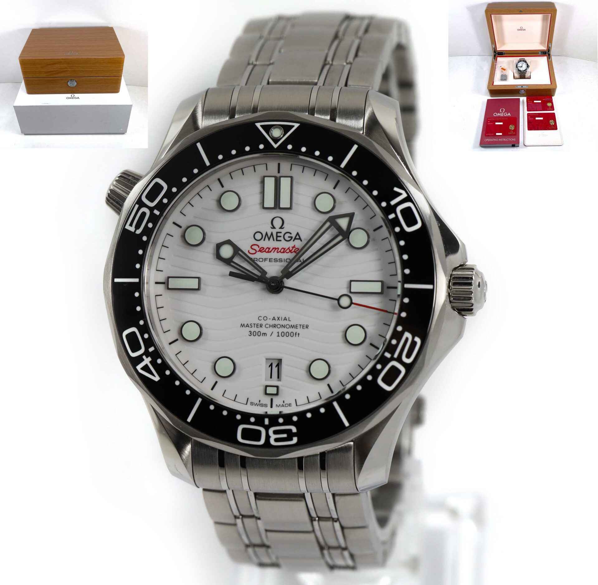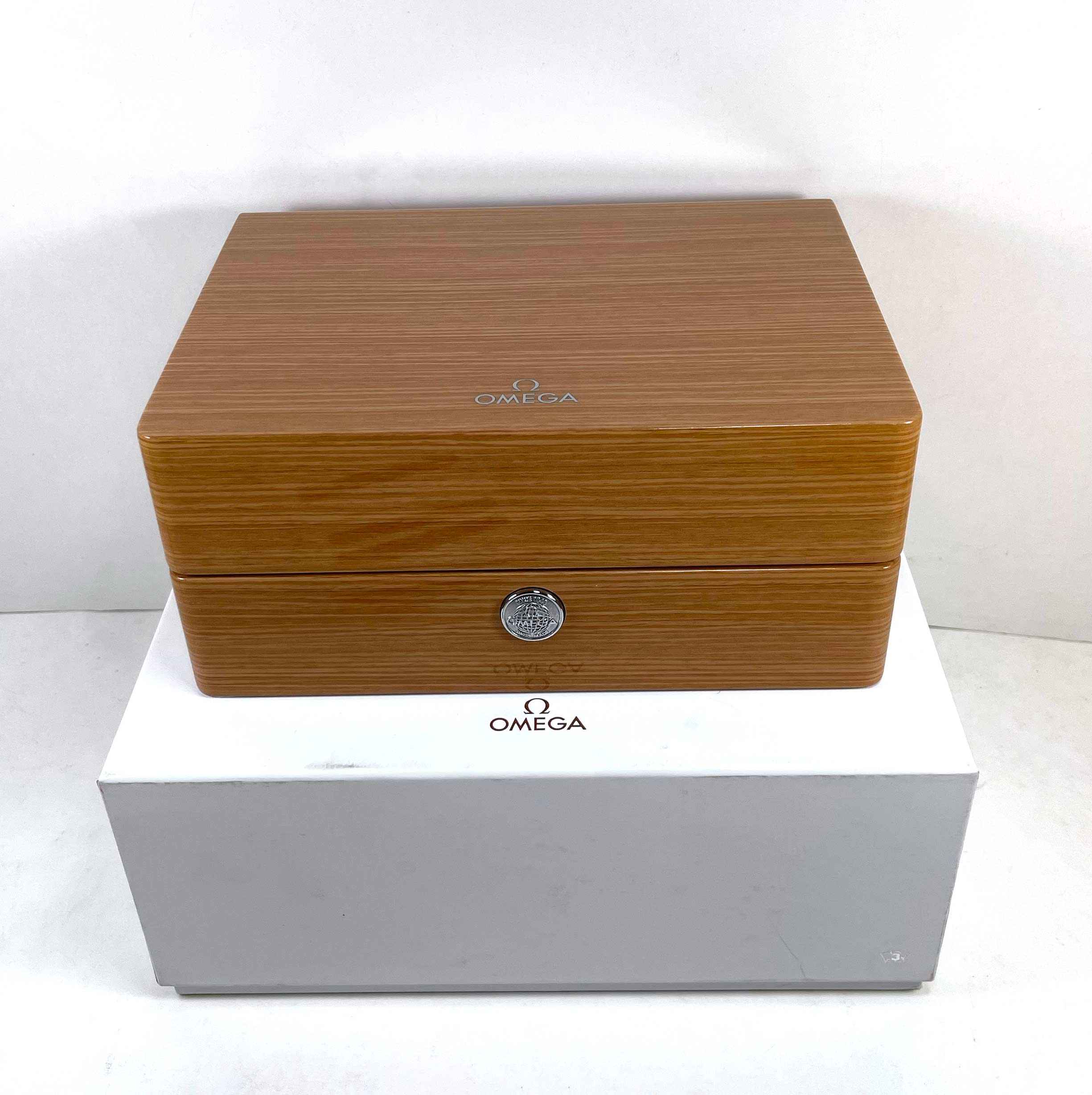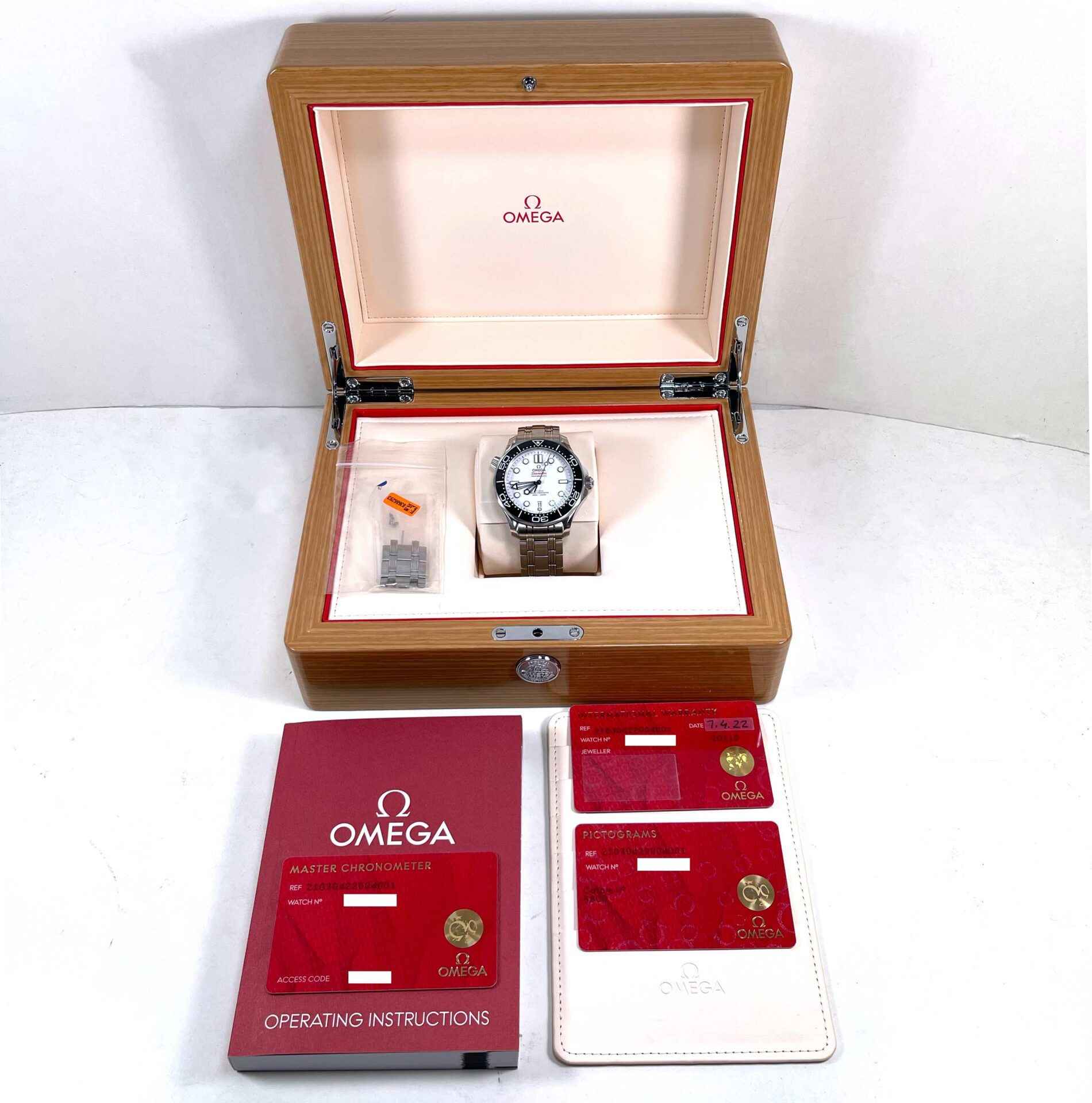 this omega is in excellent condition and comes with its box, papers, spare links, and warranty cards dated april 7th, 2022 as shown in the pictures attached. This watch is in stock and available to ship immediately!