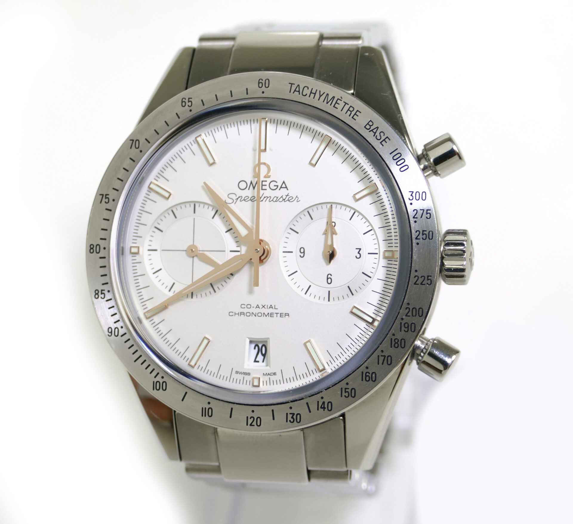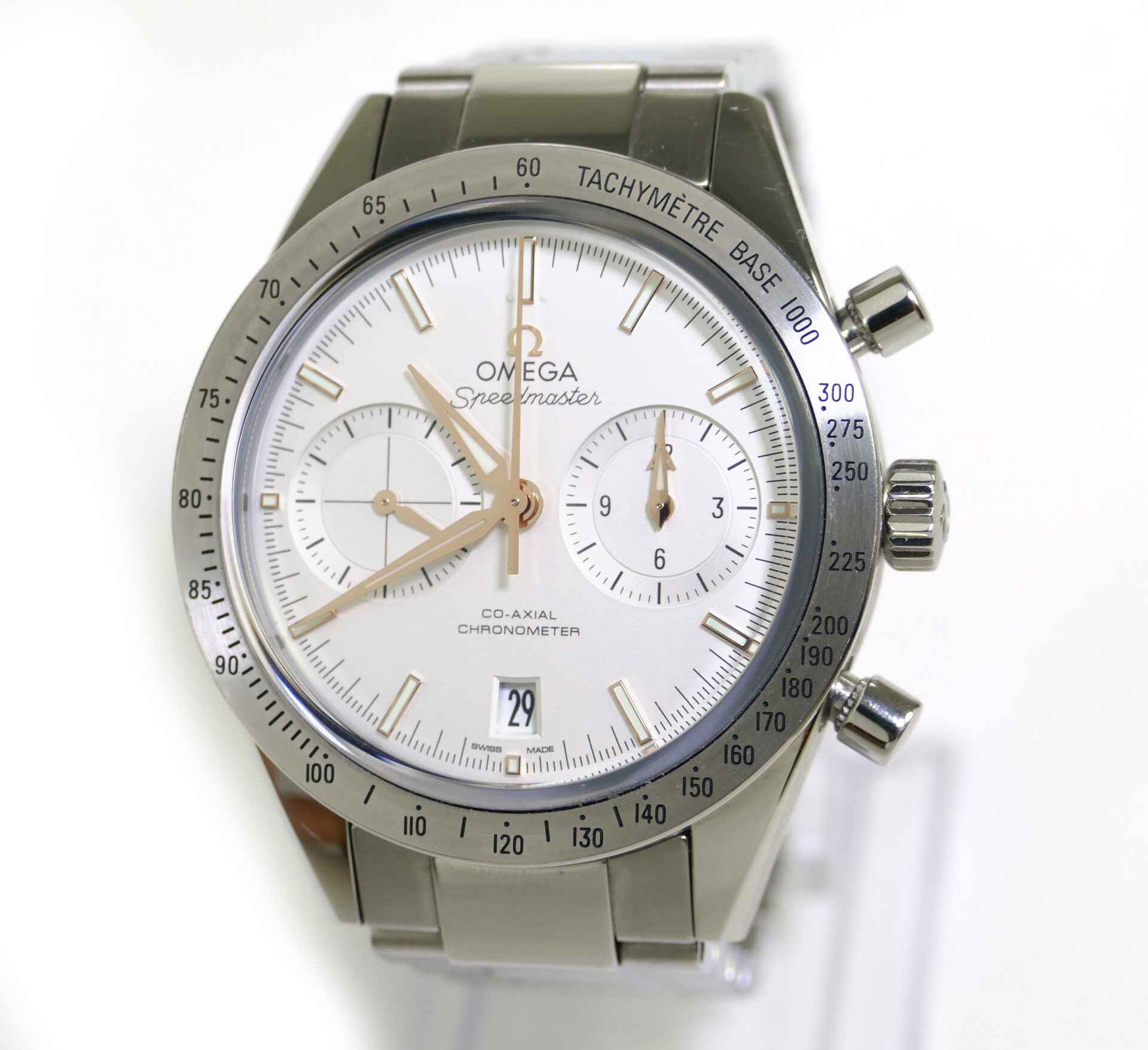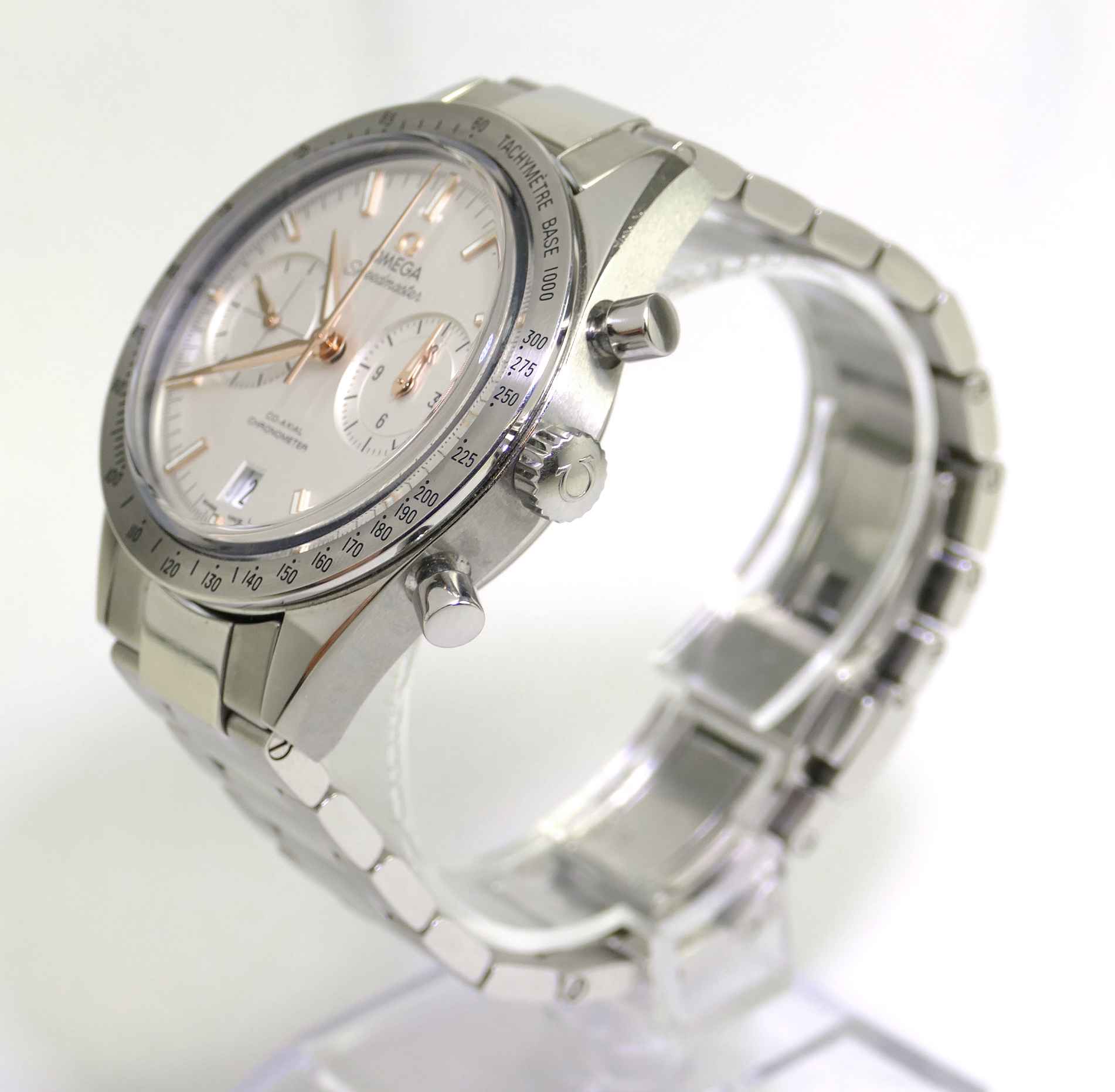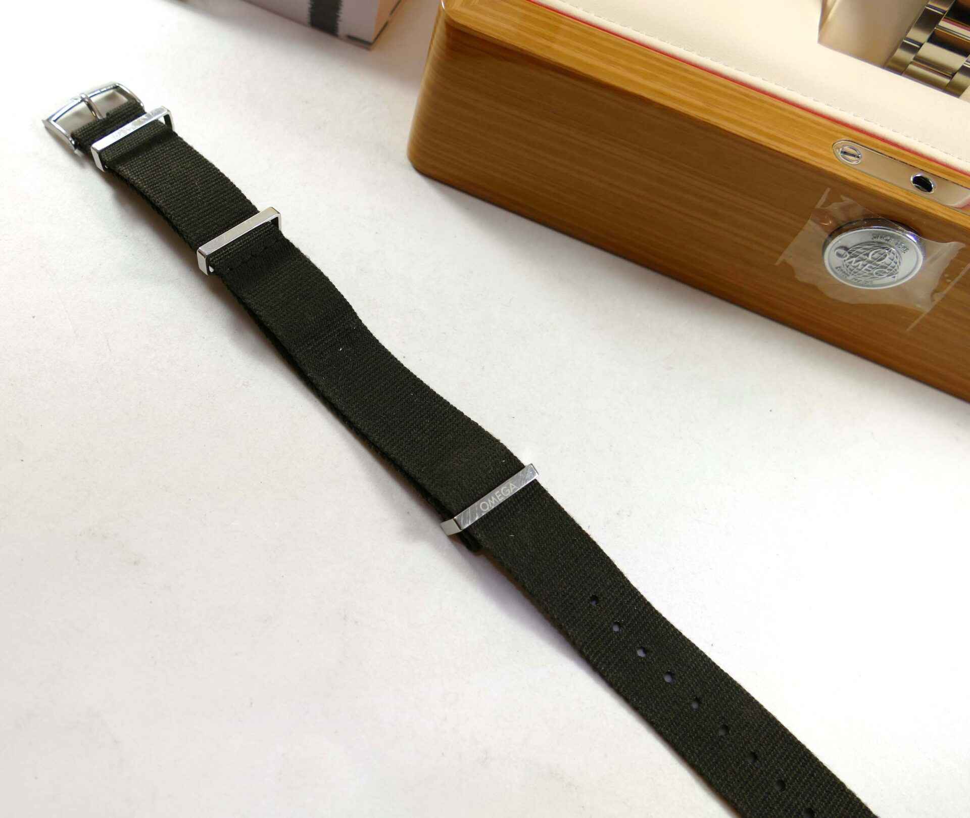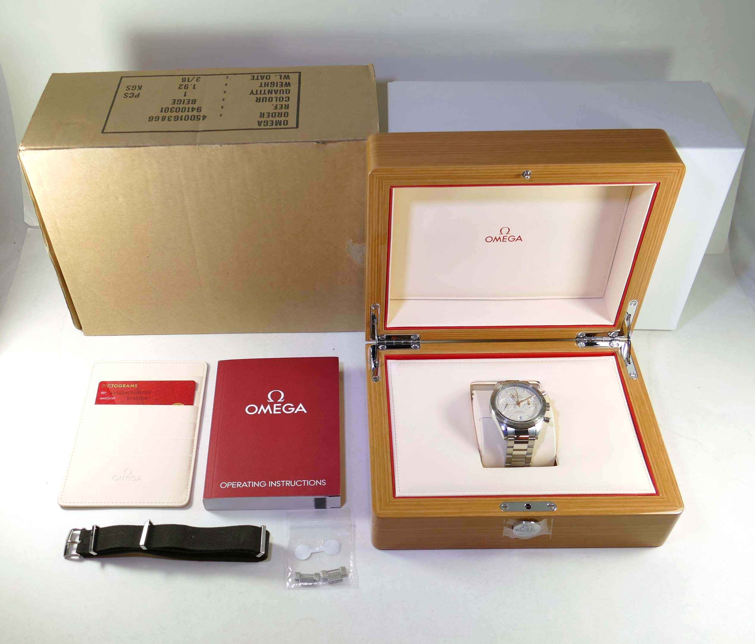 this omega watch is in near-mint condition and comes with its original box and paperwork. All of its original links are included. It also comes with an oem omega nato strap, which is used but nice condition.