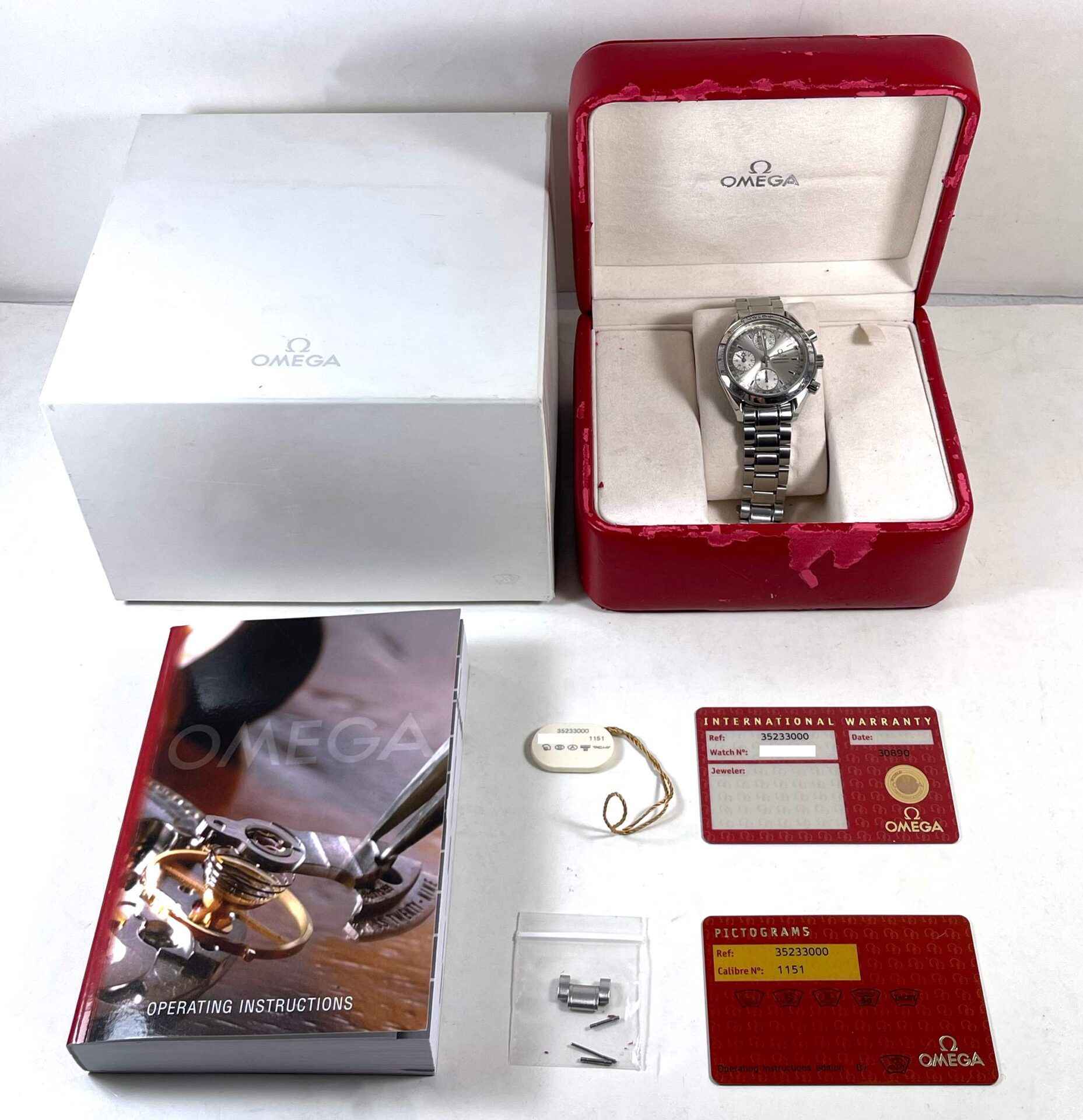 this omega speedmaster is in excellent condition showing some normal surface wear consistent with pre-owned watches. This set comes with its box, papers, hang tag, spare link, and warranty card as shown in the pictures attached. This watch is in stock and available to ship immediately!