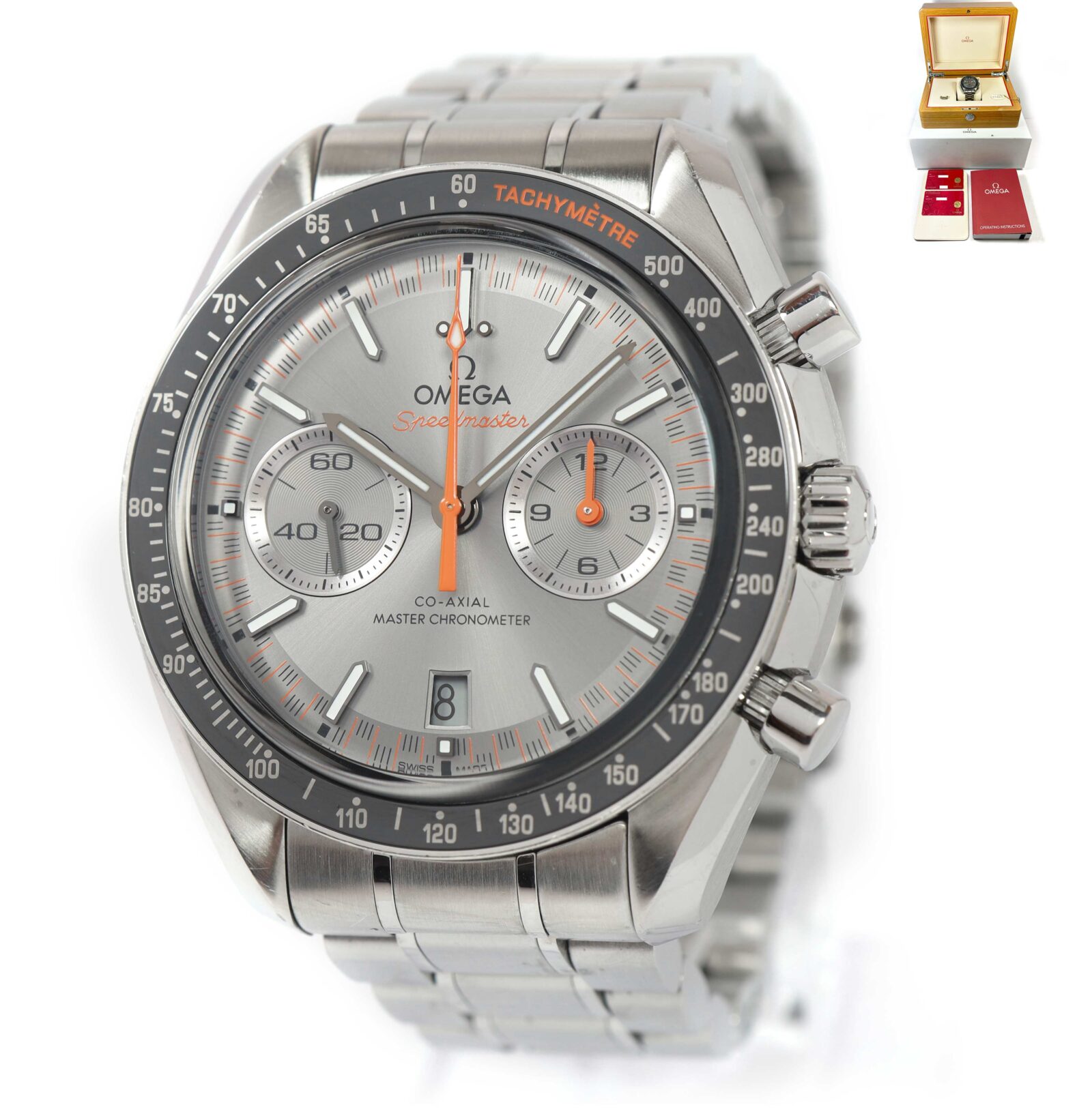 this omega watch is good overall condition showing some signs of surface wear consistent with preowned watches. This comes with its box, booklets, hang tag, spare link, pictogram/master chronometer cards only as shown in the pictures attached. This watch is in stock and available to ship immediately!