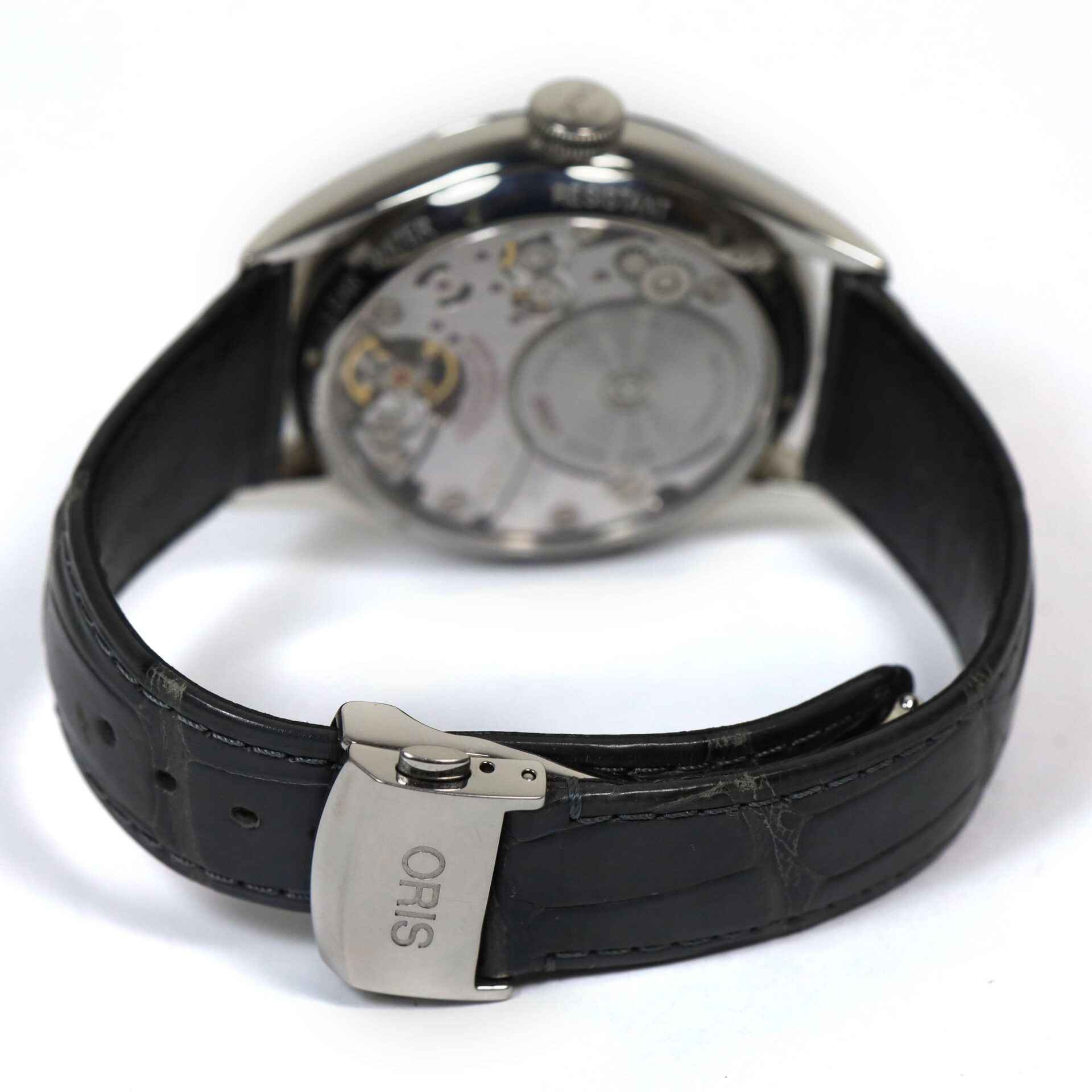 This Oris watch is in excellent condition and comes with its box, hang tag, and booklets as shown in the photos attached. This watch features a 43mm stainless steel case that surrounds a silver dial and comes on a leathe...
