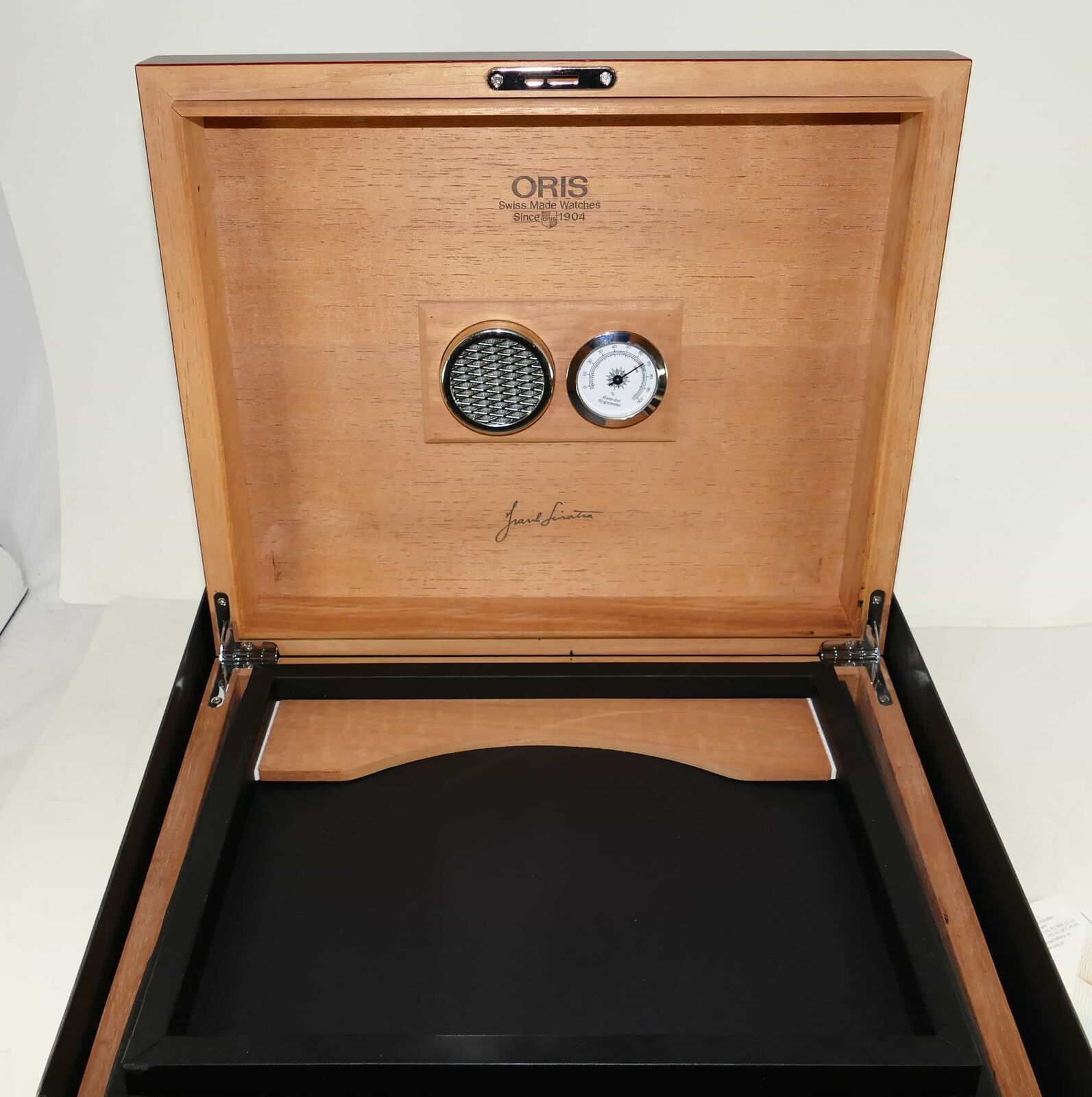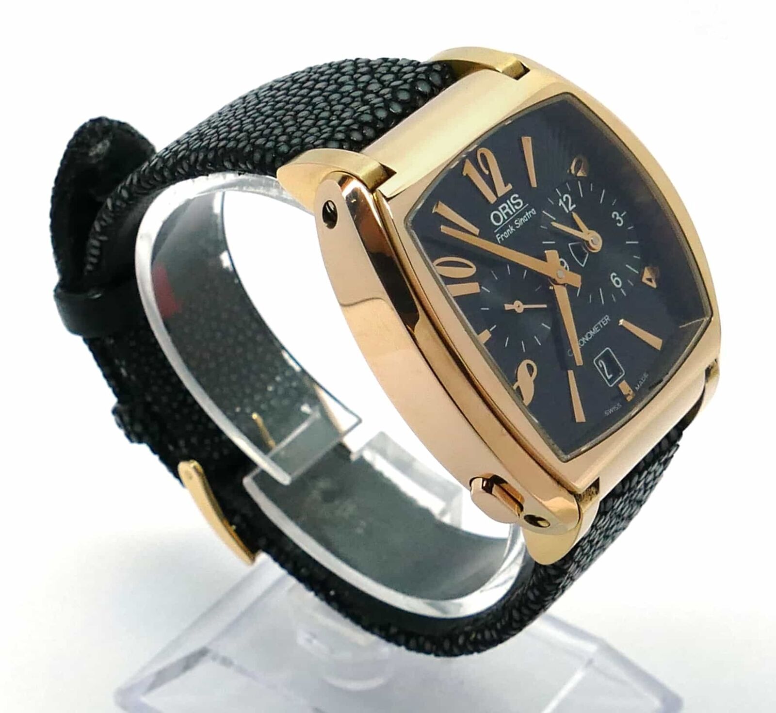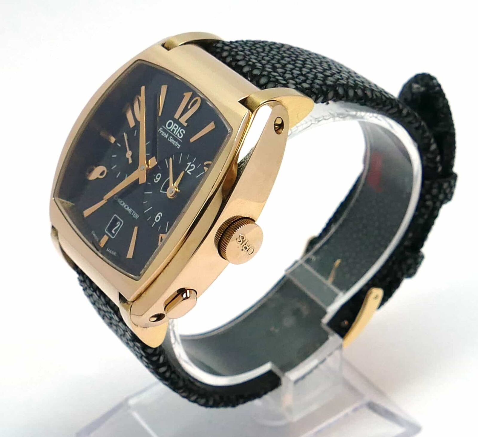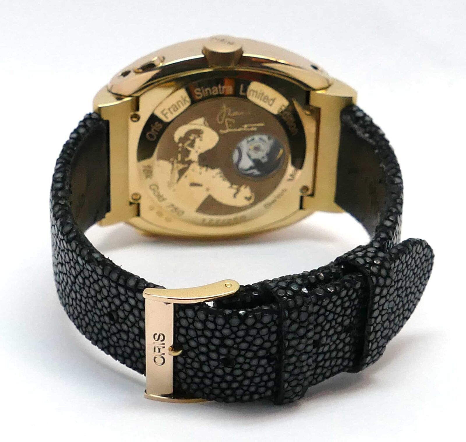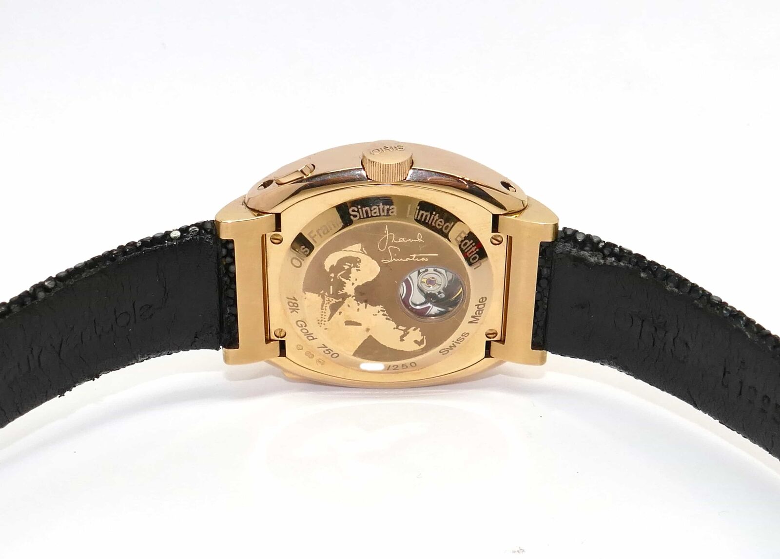 Read Moreyou are viewing a super rare oris frank sinatra watch made in solid 18k rose gold. Only 250 of these were produced, and this is the only one available on the internet currently! it comes with its complete box, papers, cigar case, sinatra book, and anything else you see in the photos. The box is a huge humidor. The strap looks good from the front side and has a lot of life left, however it has started peeling a bit on the back side. If you have any questions, feel free to reach out to us.