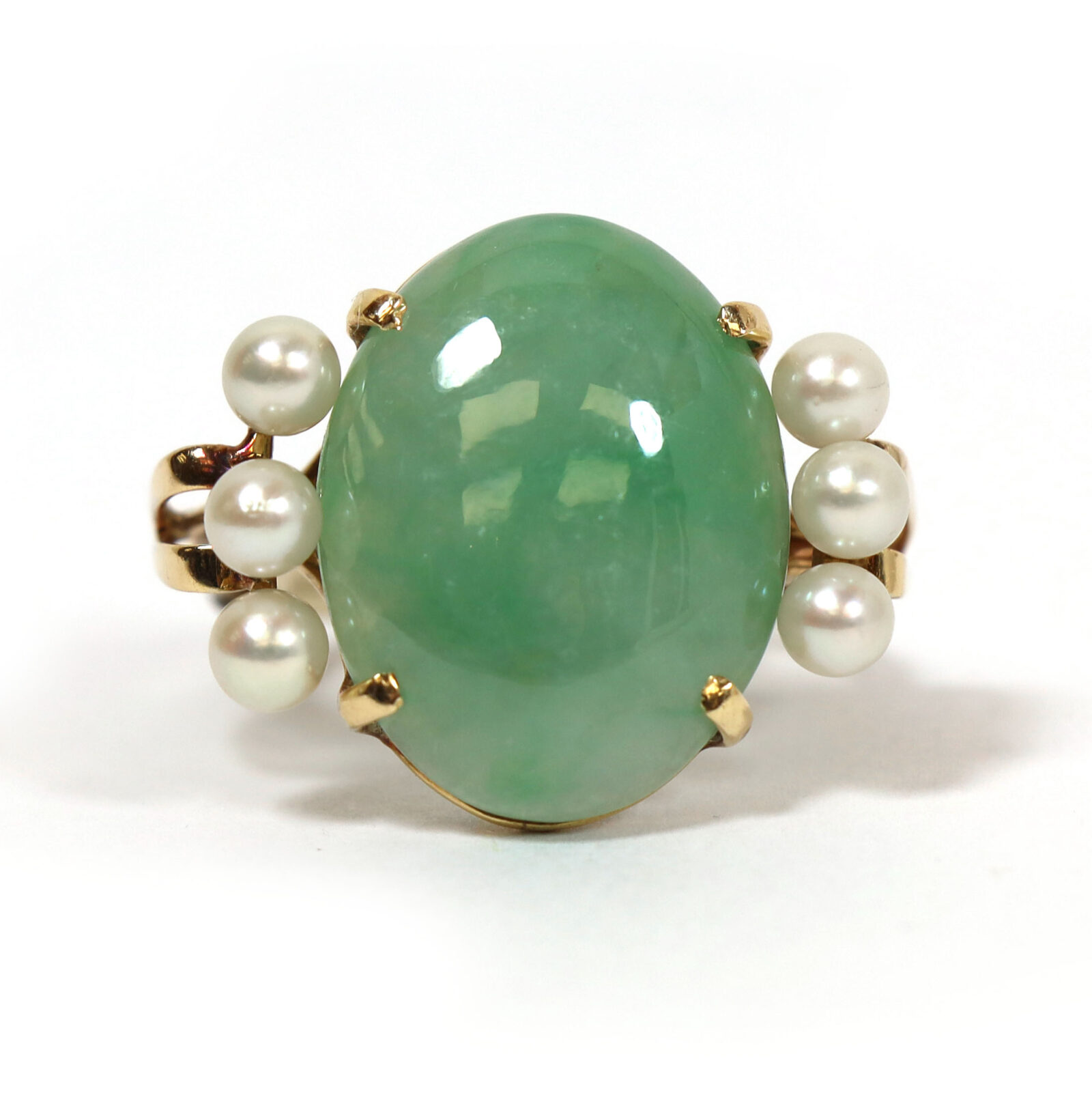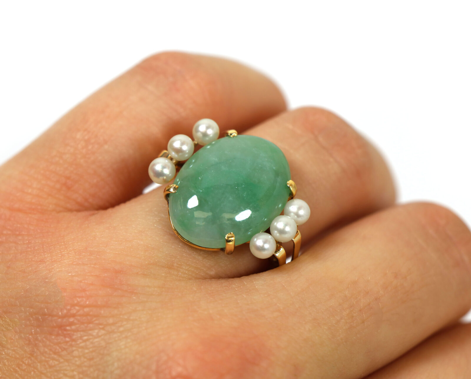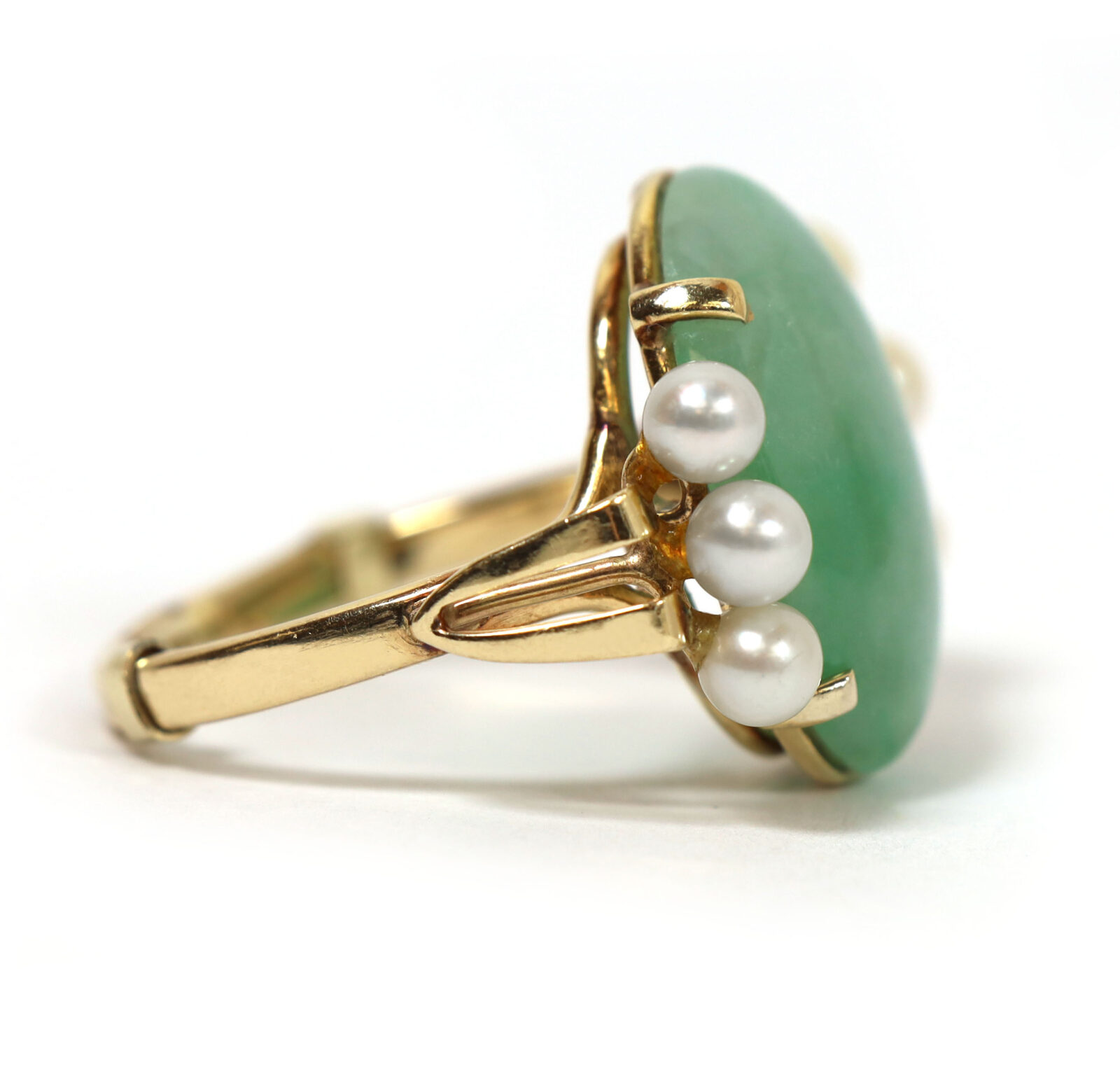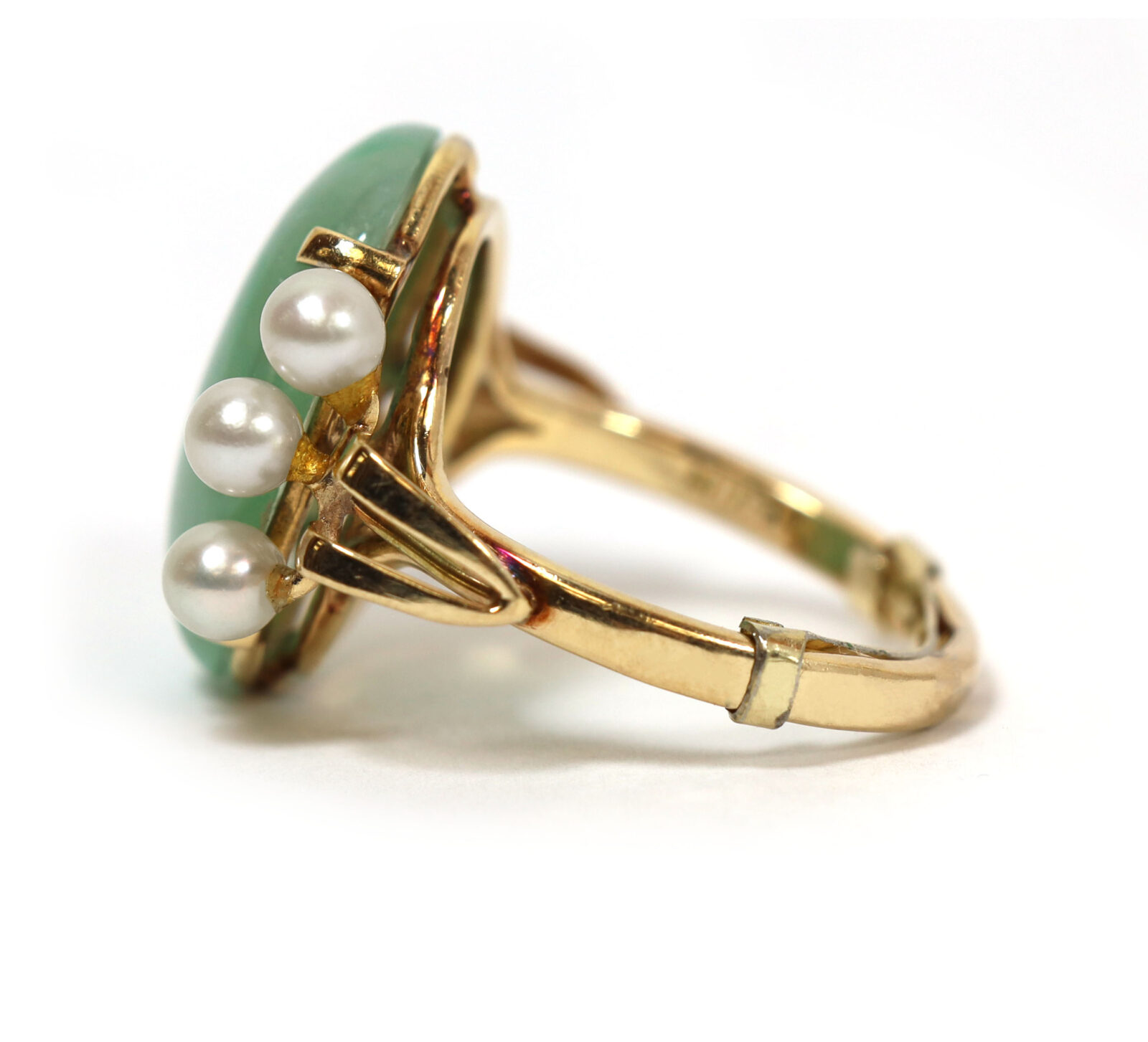 Read Moremetal: 14k yellow gold ring size: 7 band width: 2mm weight: 5.6 grams gemstone: jade & pearl – buy with confidence from tns diamonds, a trusted and established jeweler with a brick-and-mortar storefront and over 40 years of combined experience in the ethical watch and jewelry trade. At tns diamonds, we are proud to have trusted gia graduate gemologists on staff, ensuring that every piece of jewelry meets the highest standards of quality and craftsmanship. With our expertise and commitment to ethical practices, you can shop with peace of mind knowing you’re receiving a genuine product. If you have any questions or need further assistance, feel free to reach out—we’re here to help! – this ring can be resized up or down to suit your needs. We recommend taking it to your local jeweler for professional resizing.