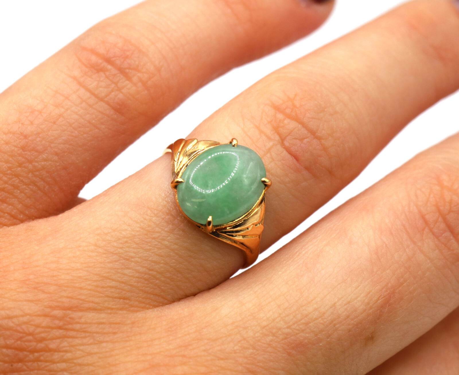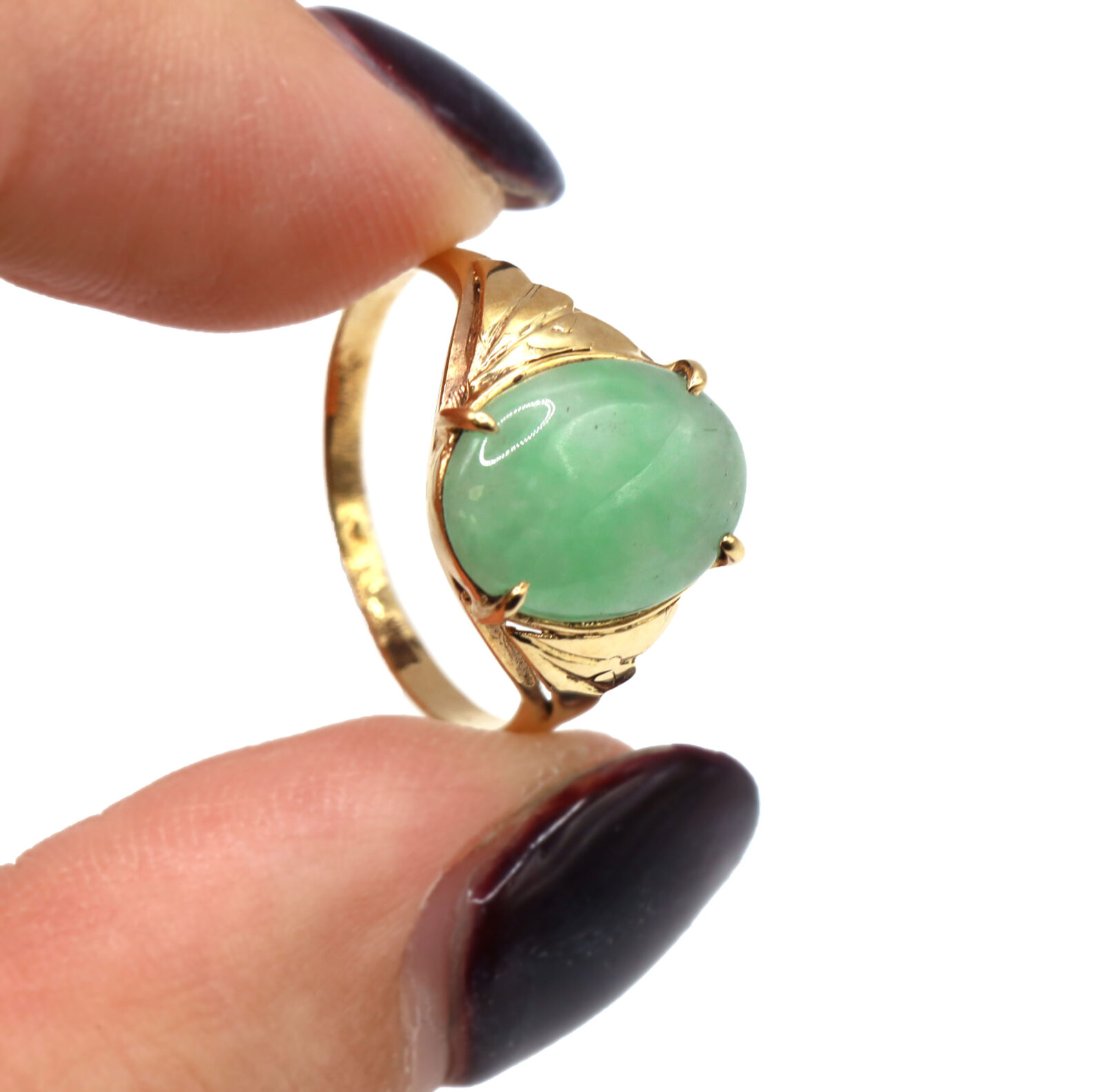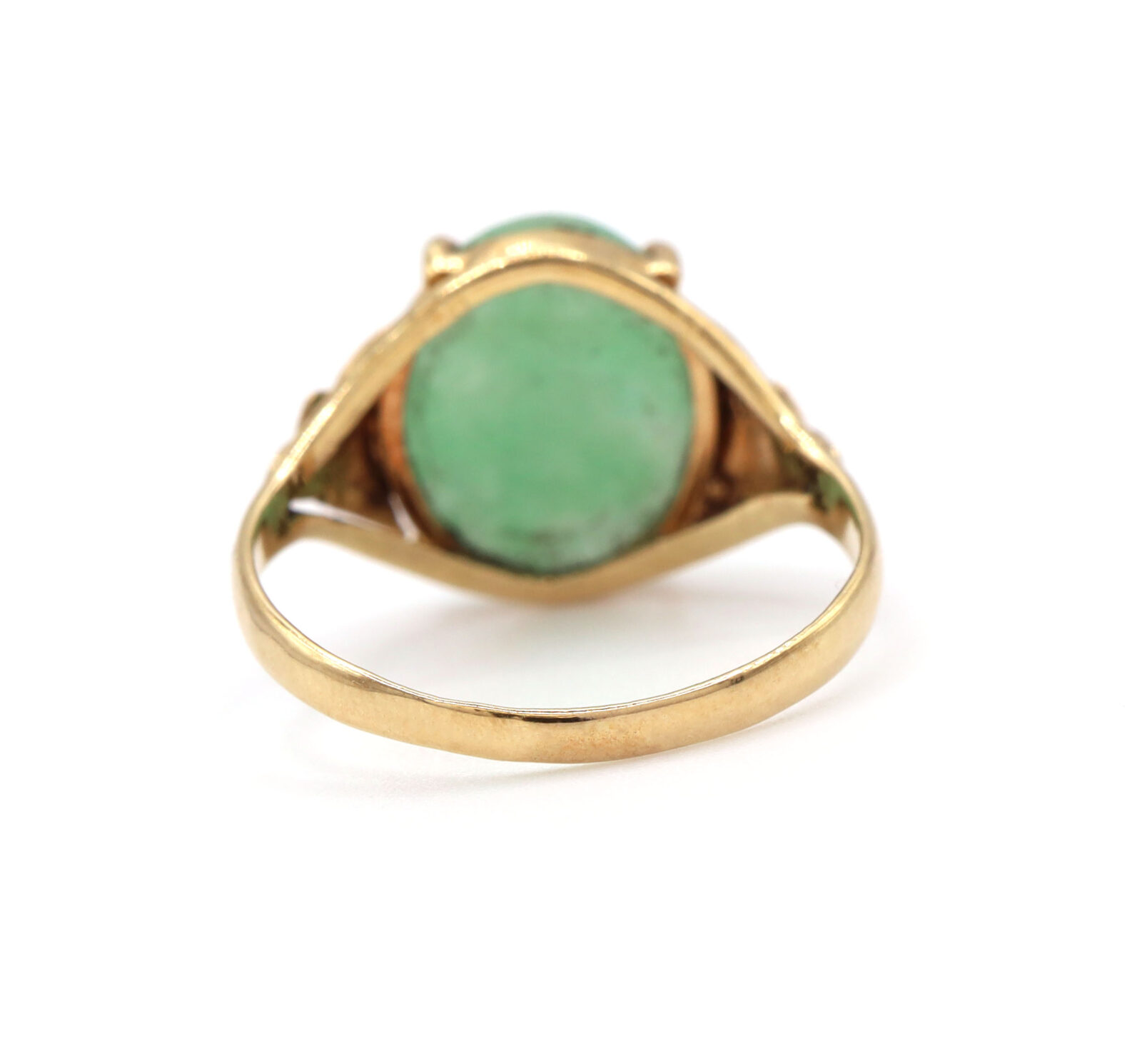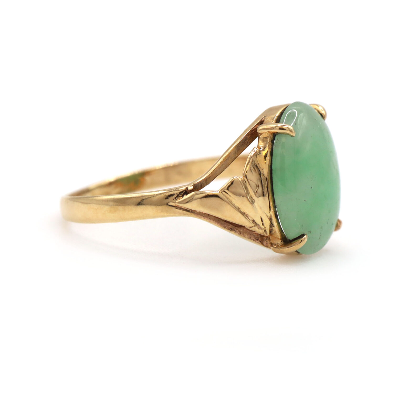 Material: 14k Yellow Gold Size: 5.75 Gemstone: Jade Cut: Oval Cabochon Front Width: 11.30mm Band Width: 1.65 mm Weight: 2 Grams