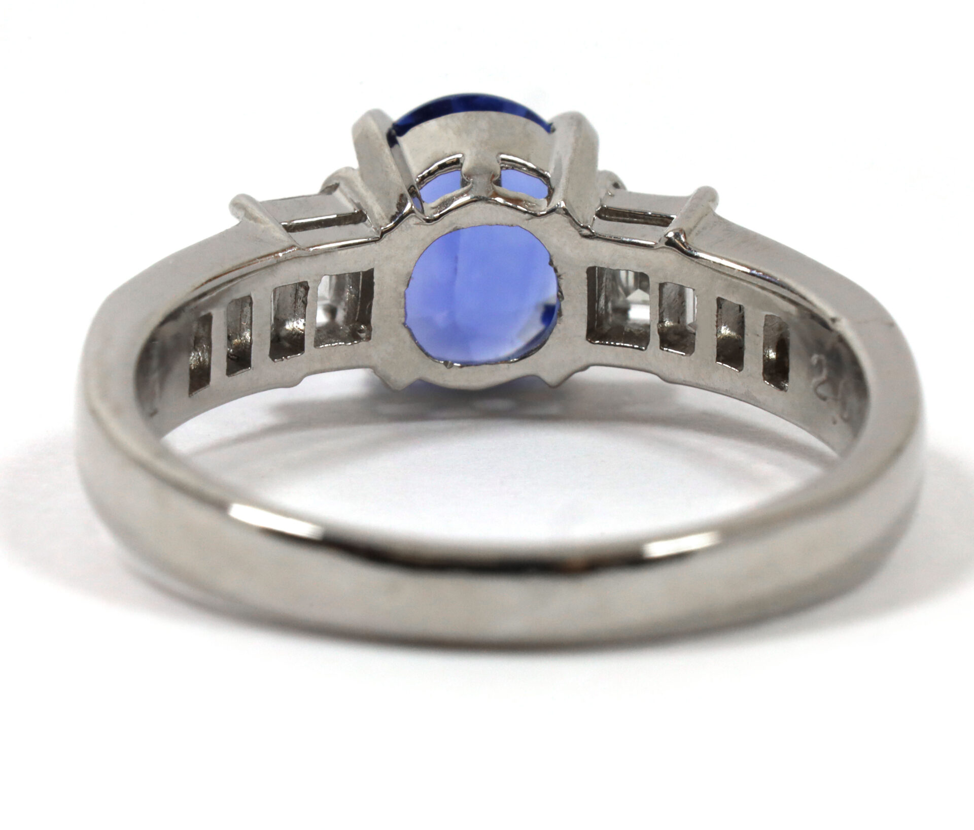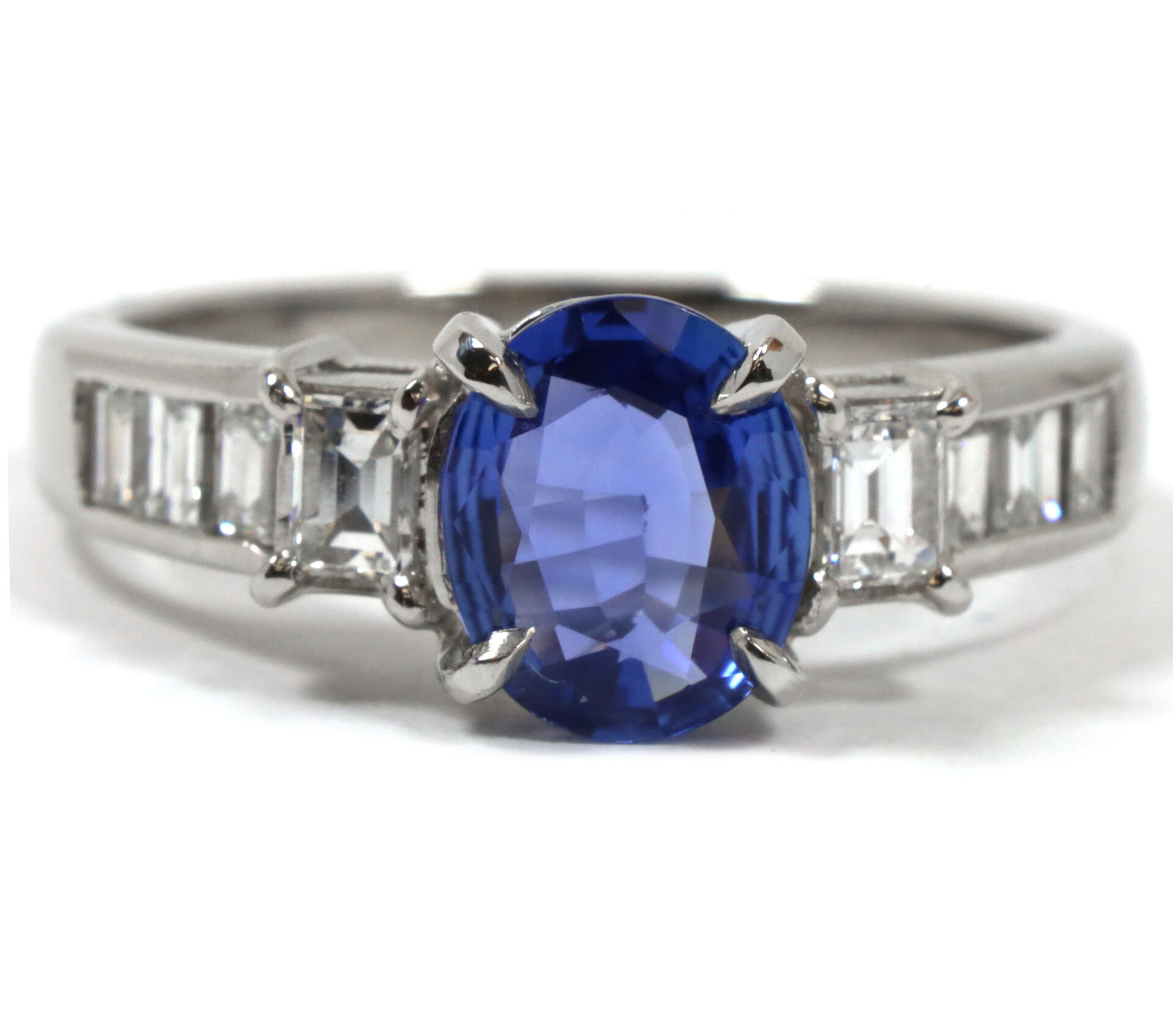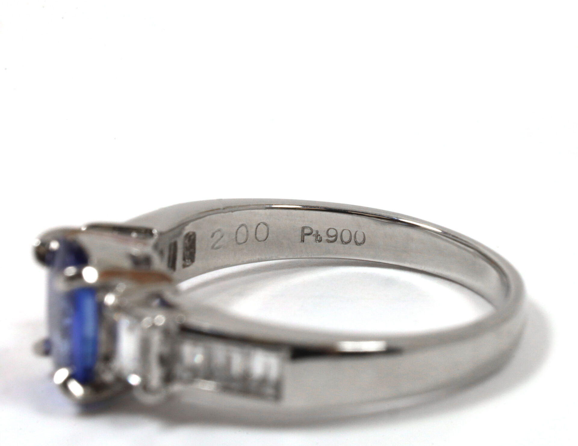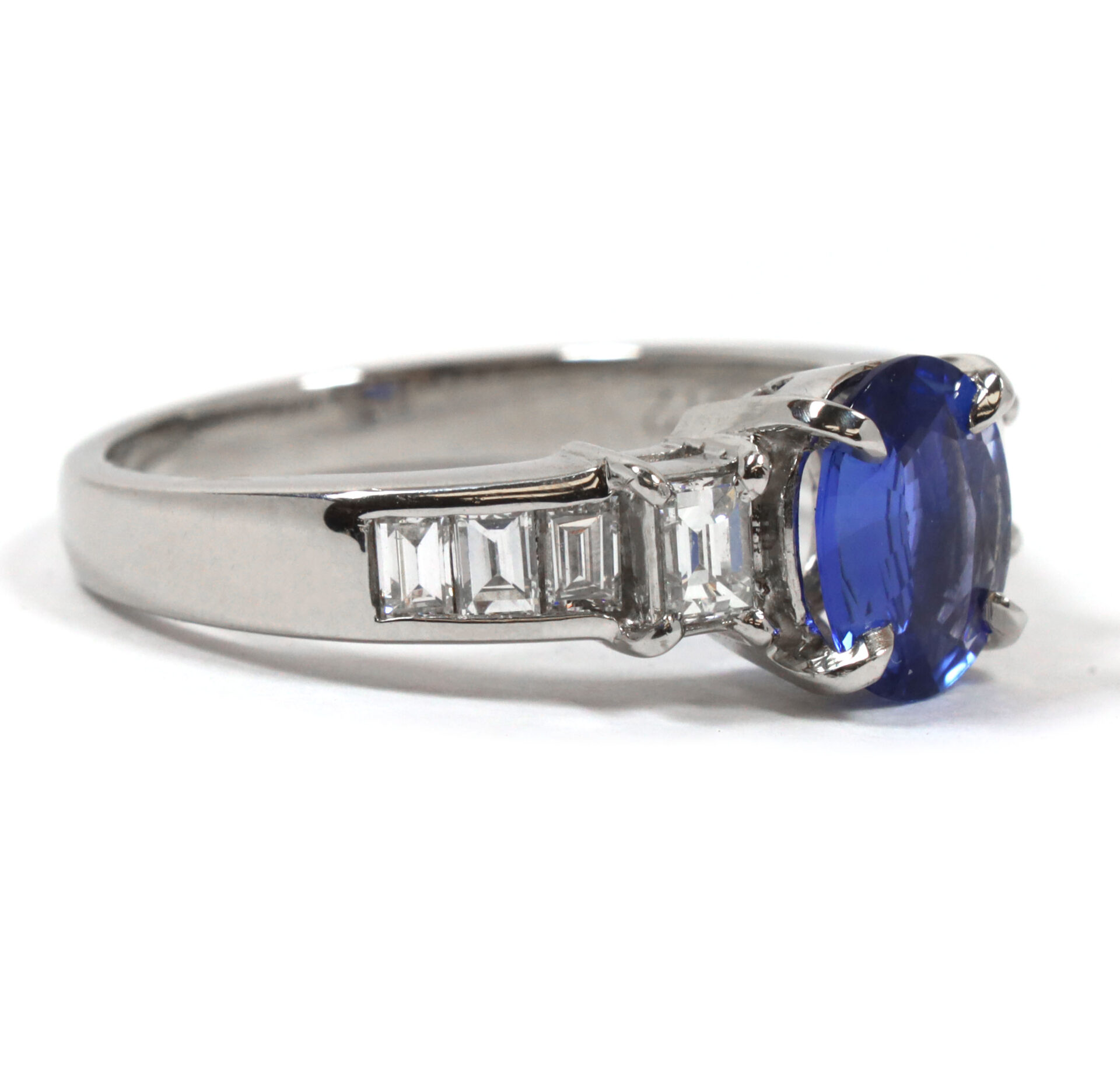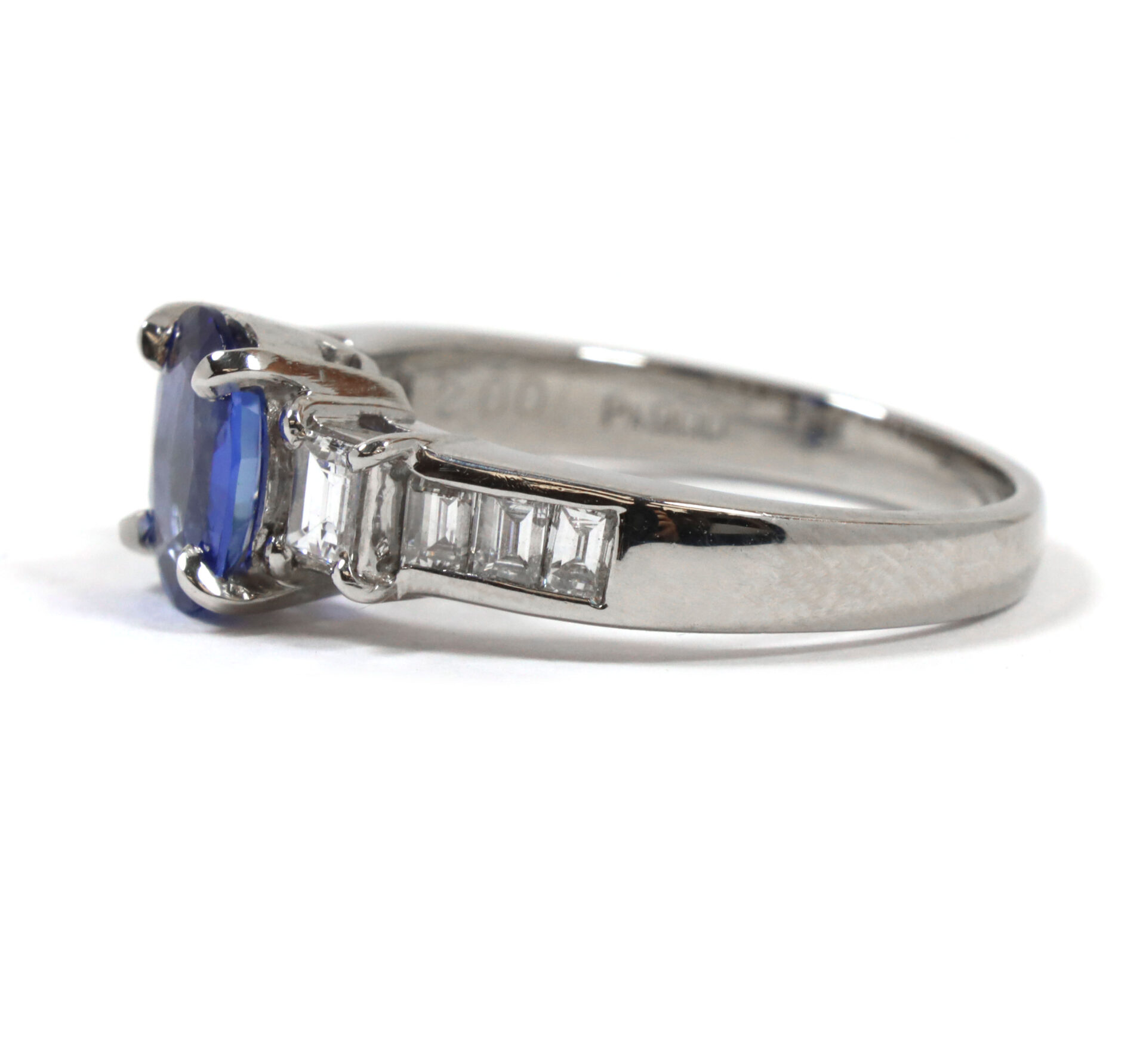 Read Moremetal: platinum gemstone: sapphire & diamond ring size: 7.5 band width: 2.5mm center stone: gemstone: sapphire origin: sri lanka color: blue – medium cut: oval carat weight: 1.11 carat measurements: 7.95 x 5.47 x 2.58mm side stones: gemstone: diamond carat weight: 0.61 carats total clarity: vvs1 color: g/h cut: baguette – buy with confidence from tns diamonds, a trusted and established jeweler with a brick-and-mortar storefront and over 40 years of combined experience in the ethical watch and jewelry trade. At tns diamonds, we are proud to have trusted gia graduate gemologists on staff, ensuring that every piece of jewelry meets the highest standards of quality and craftsmanship. With our expertise and commitment to ethical practices, you can shop with peace of mind knowing you’re receiving a genuine product. If you have any questions or need further assistance, feel free to reach out—we’re here to help!