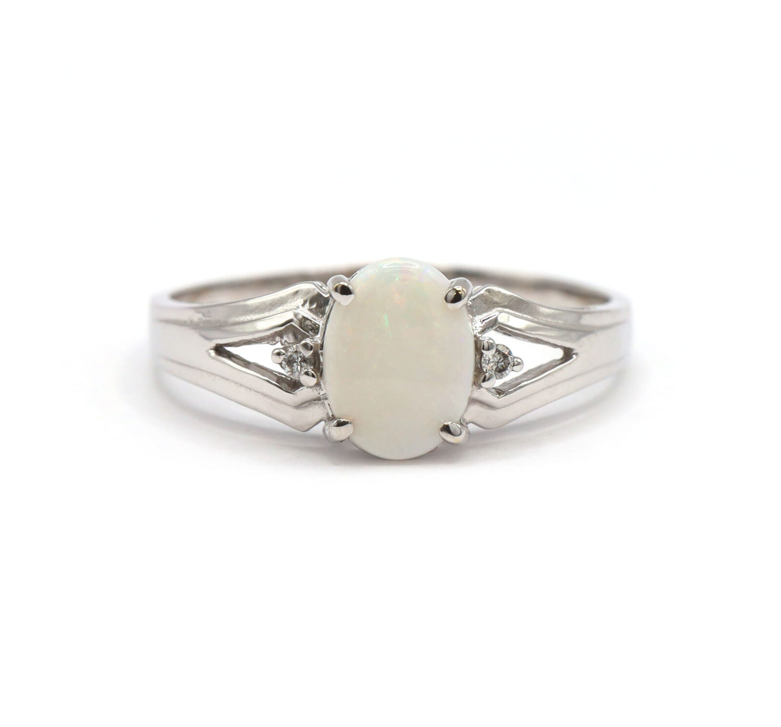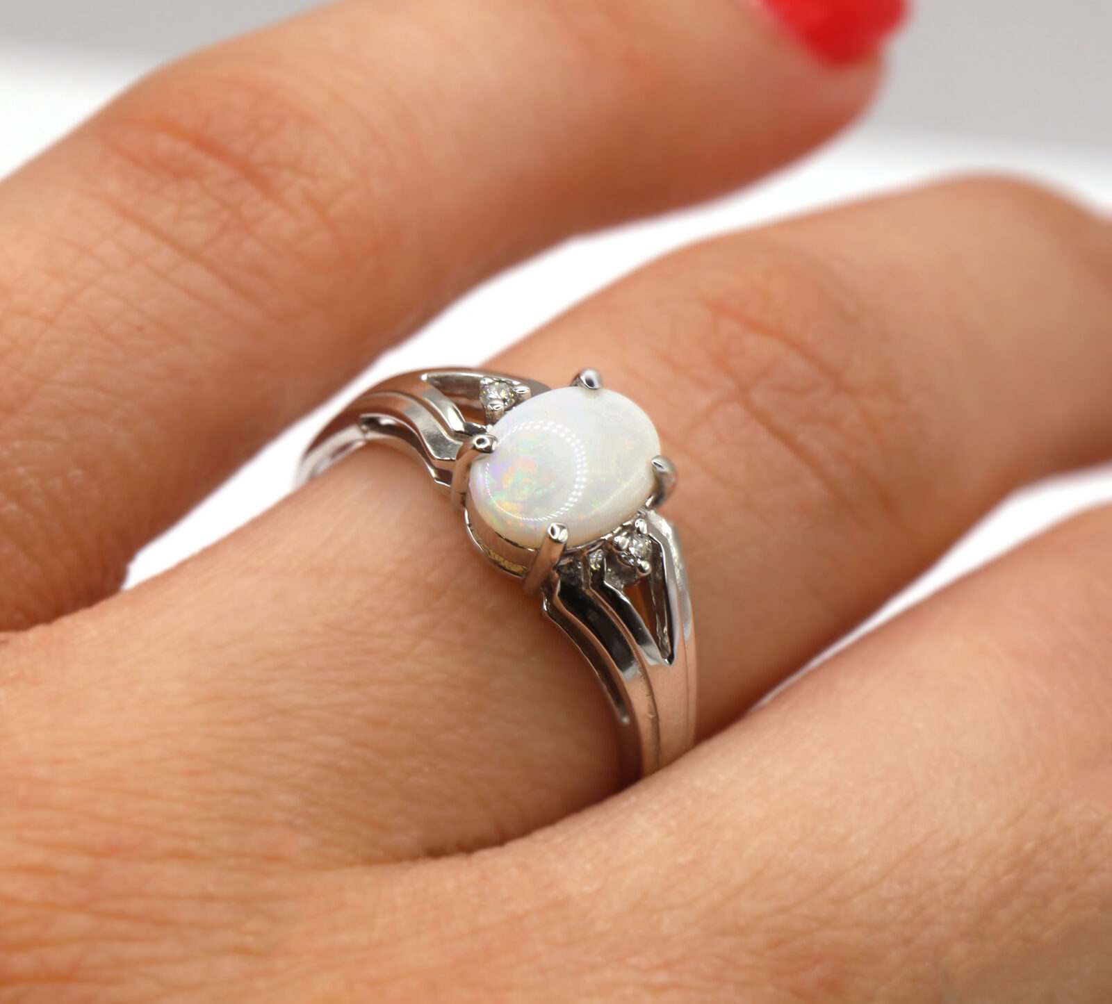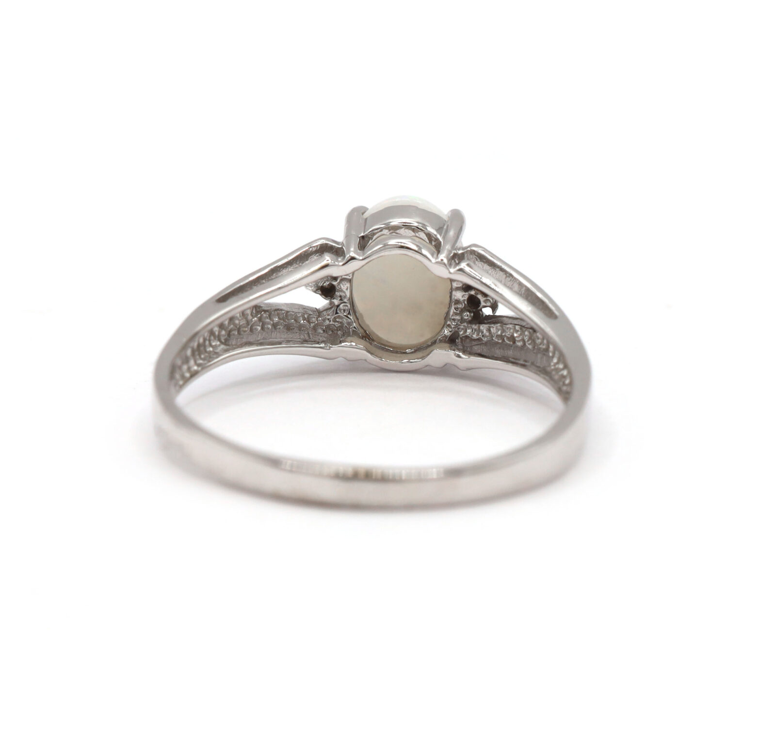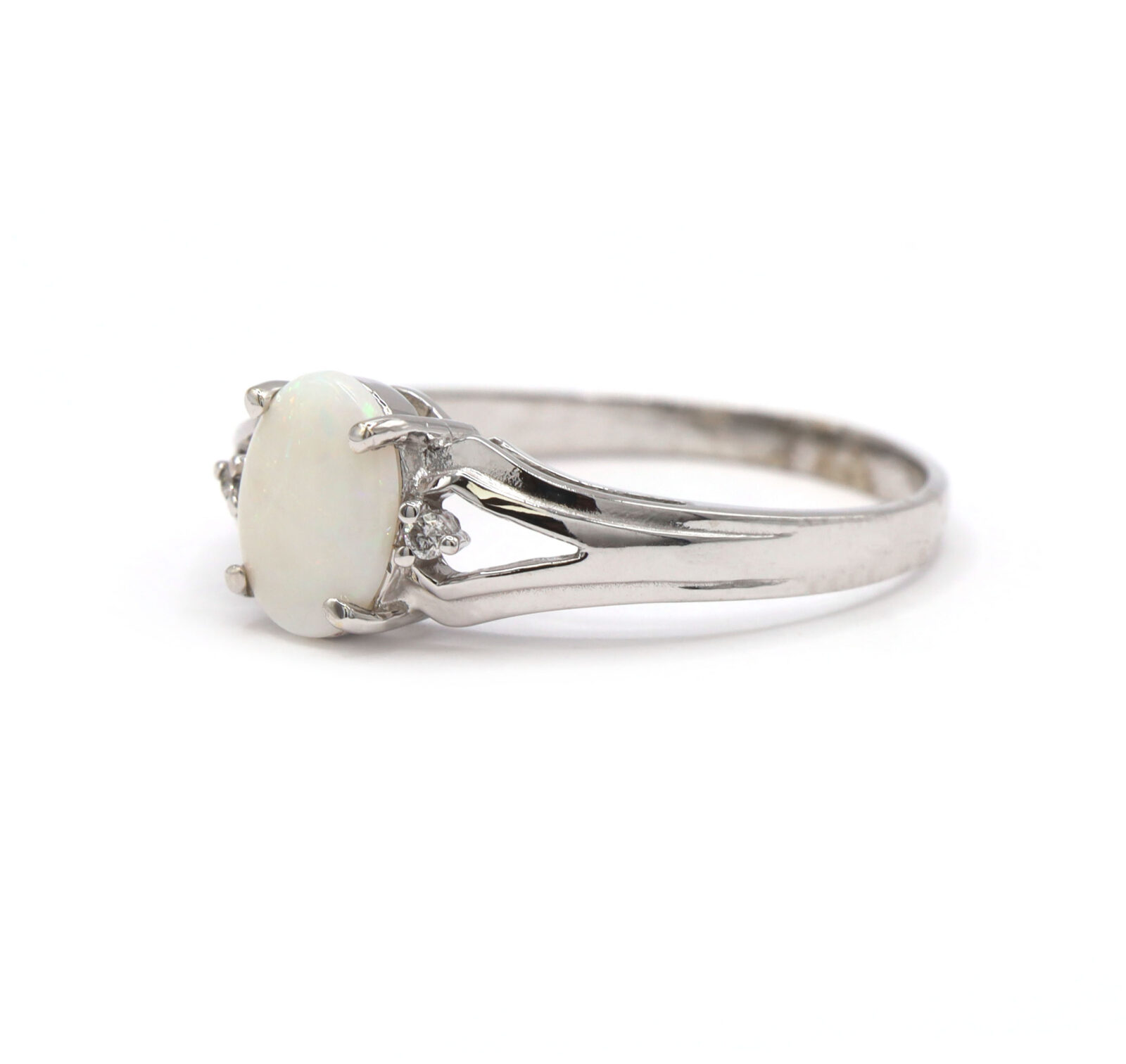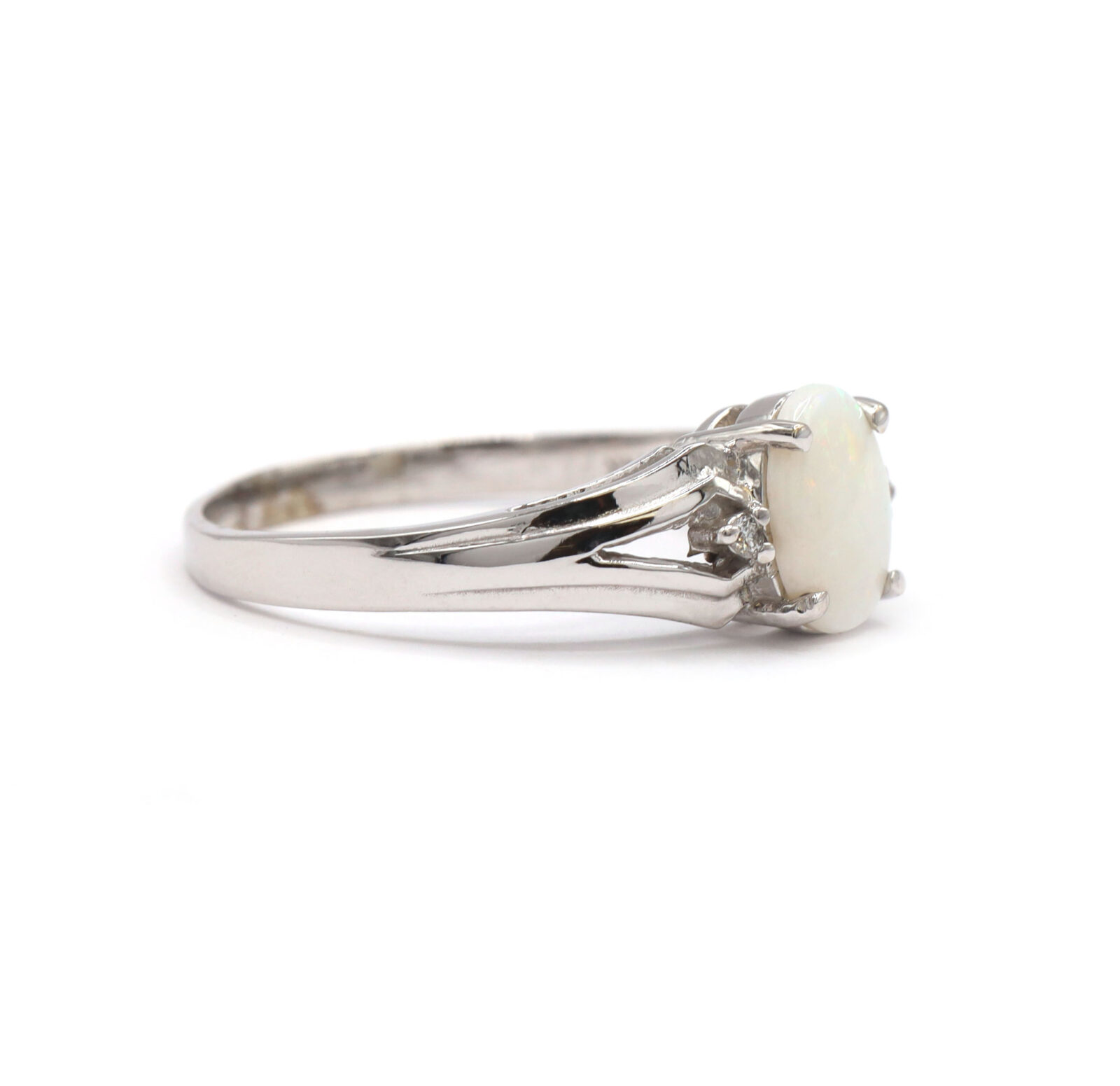 Material: 14k White Gold Gemstone: Opal Stone Cut: Oval Cabochon Size: 8 Front Width: 8mm Back Width: 2mm Weight: 3.5 Grams