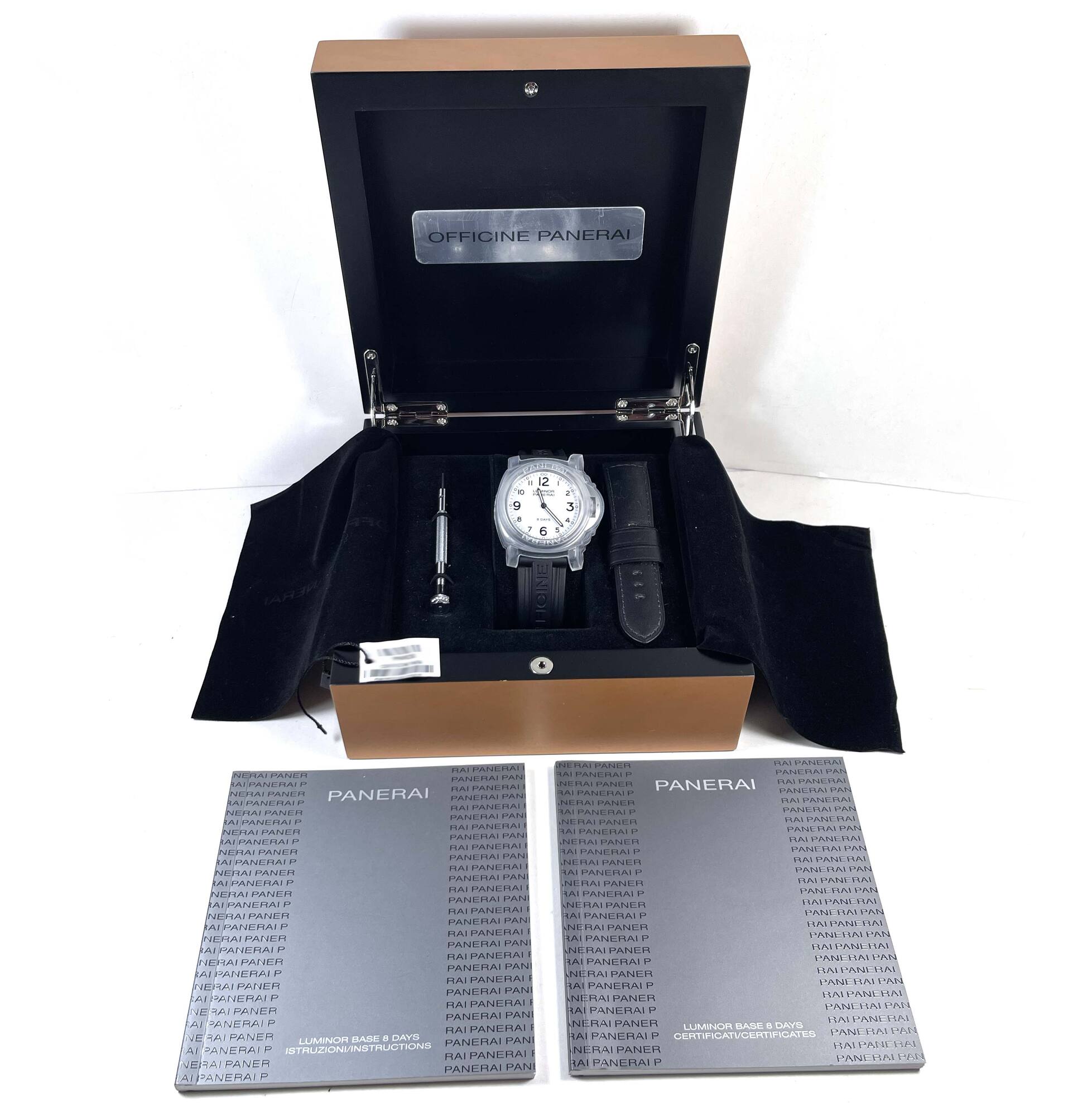this panerai is in excellent overall condition showing some normal signs of wear on the case consistent with preowned watches. This comes with its box, booklets, hang tag, panerai tool, one additional black leather strap, and warranty booklet as shown in the pictures attached. This watch is in stock and available to ship immediately!