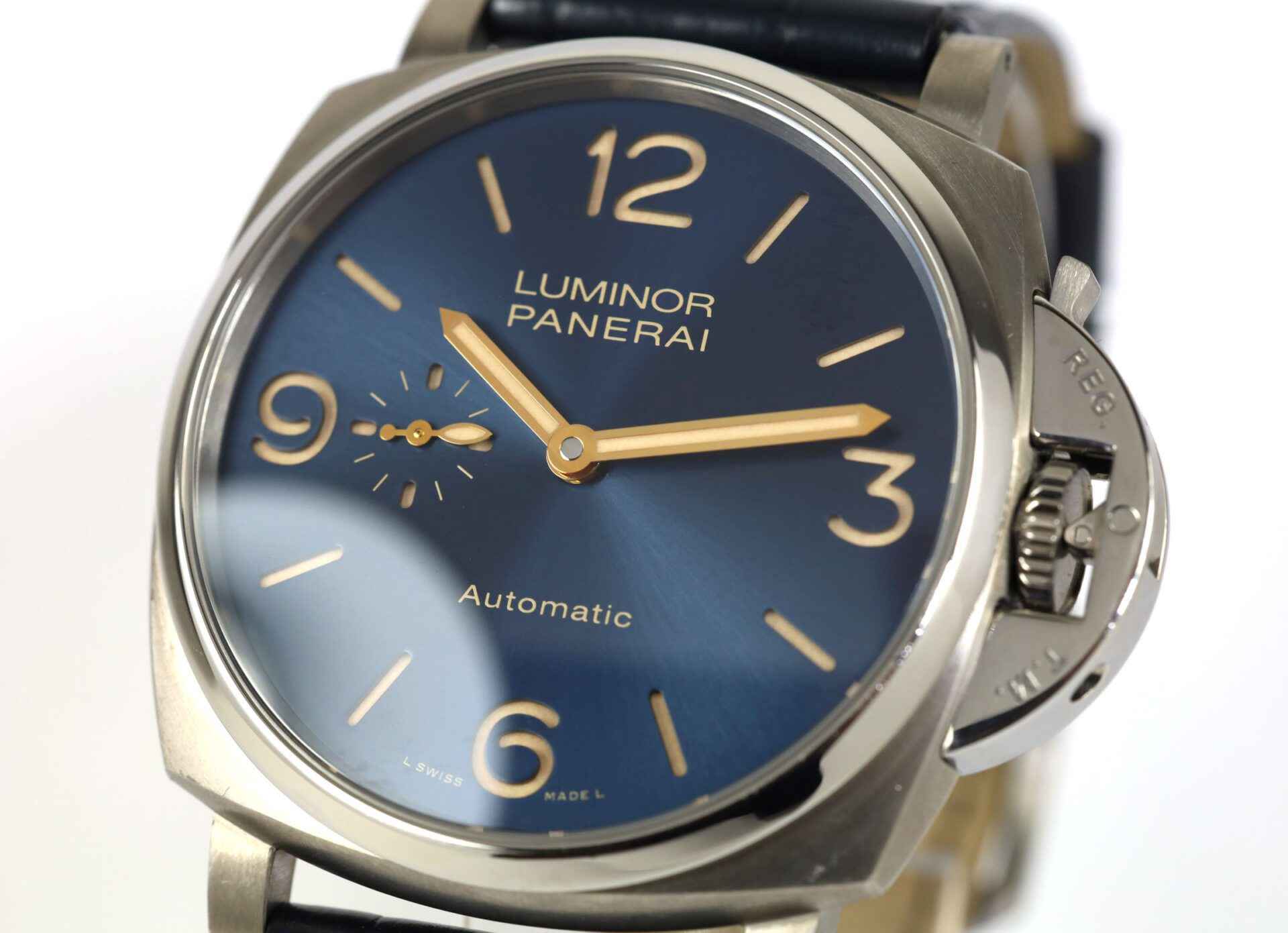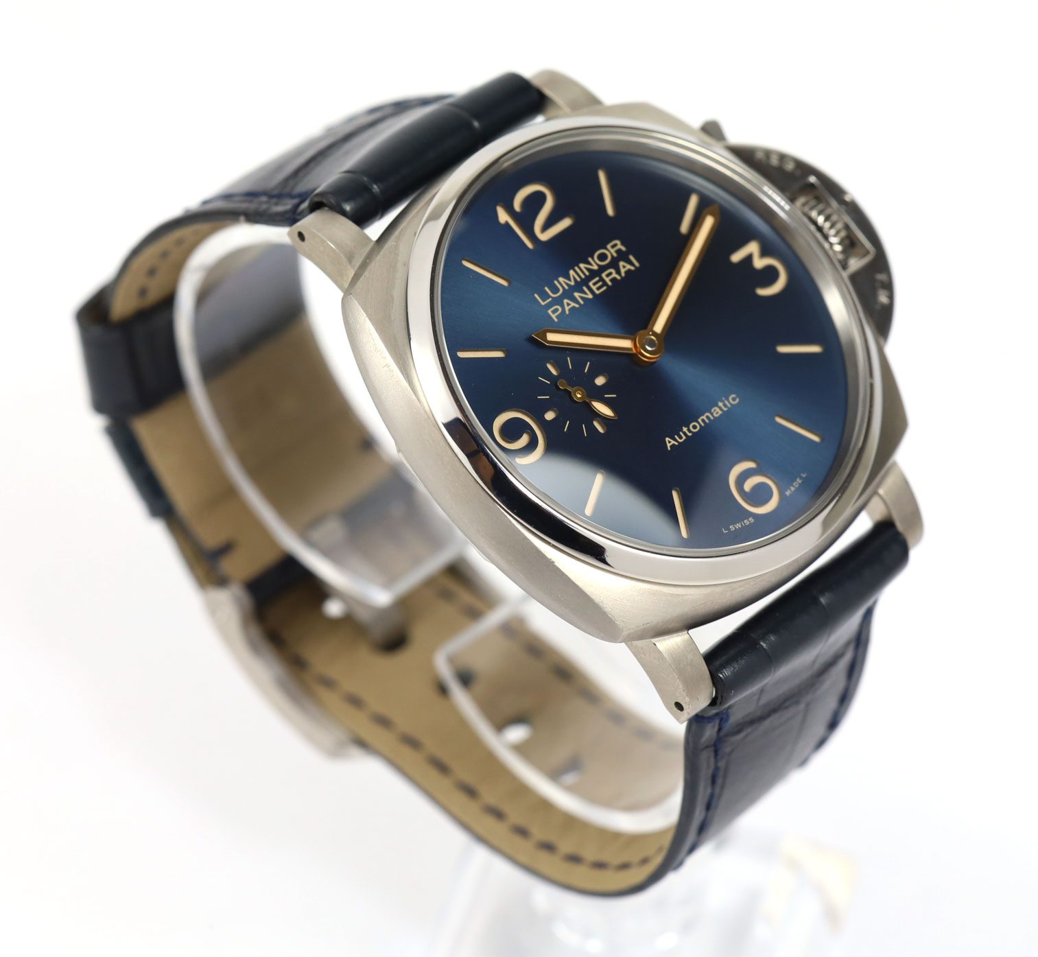 this panerai is in excellent condition and comes with its original box, instruction manual, and warranty certificate booklet dated june 2018. This model features an amazing blue dial with rose gold hands, and a beautiful see-through caseback featuring a micro rotor automatic movement. The case is titanium, and the watch is very thin, this watch is very light and comfortable on the wrist. The original msrp is $11,30o, here is a chance to own it at a great discount.