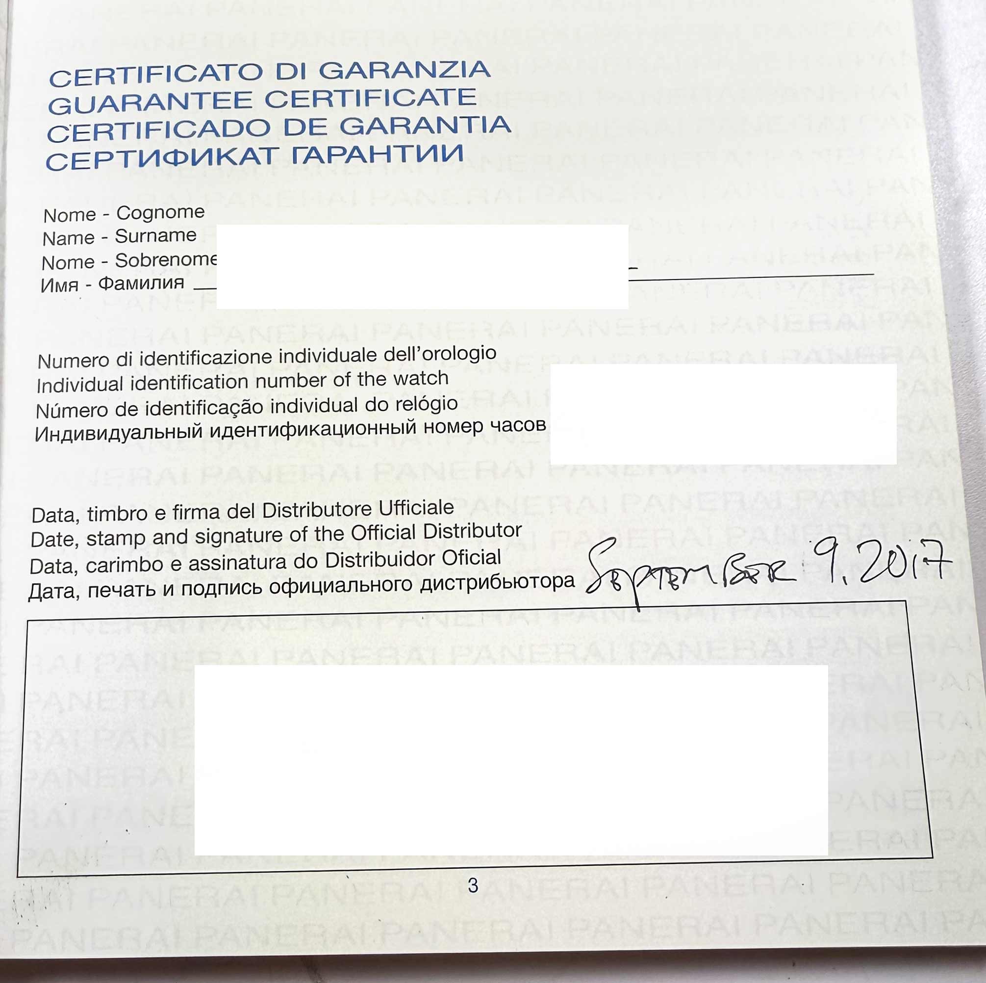 THIS PANERAI IS IN GOOD OVERALL CONDITION SHOWING SIGNS OF WEAR ON THE CASE CONSISTENT WITH PREOWNED WATCHES. THIS COMES WITH ITS BOX, BOOKLETS, BEZEL PROTECTOR, TWO ADDITIONAL STRAPS, PANERAI TOOLS, AND WARRANTY BOOKLET DATED SEPTEMBER 9TH, 2017 AS SHOWN I...