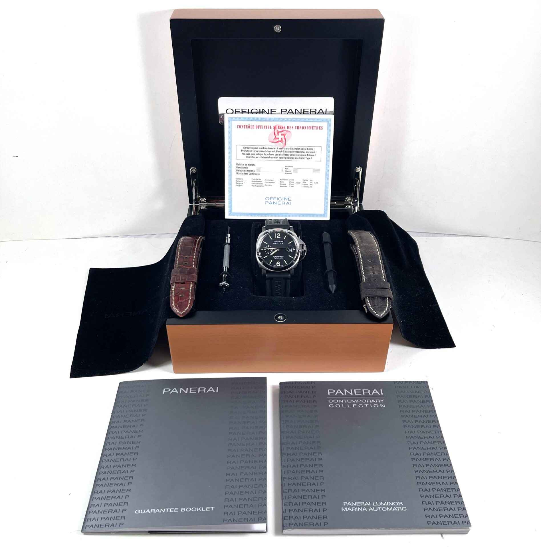 this panerai is in excellent condition and comes with its box, papers, panerai tools, two additional leather straps, and warranty paper dated june 27th, 2007. This watch is in stock and available to ship immediately!