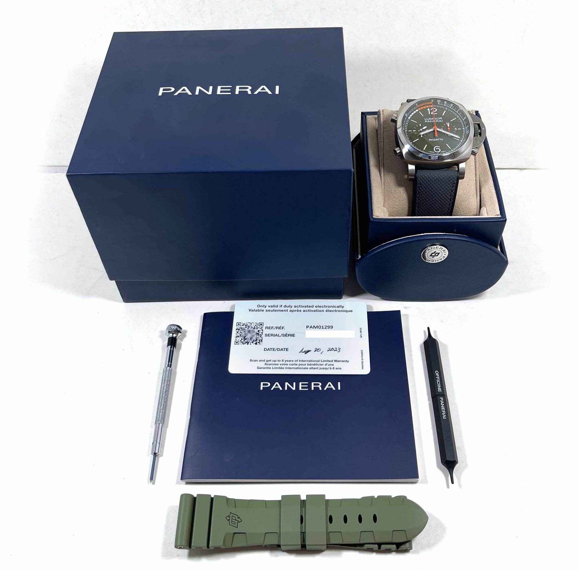 Read Morethis panerai is in excellent overall condition and comes with its box, booklet, panerai tools, one additional green panerai rubber strap, and warranty card dated august 30th, 2023 as shown in the pictures attached. This watch is in stock and available to ship immediately!