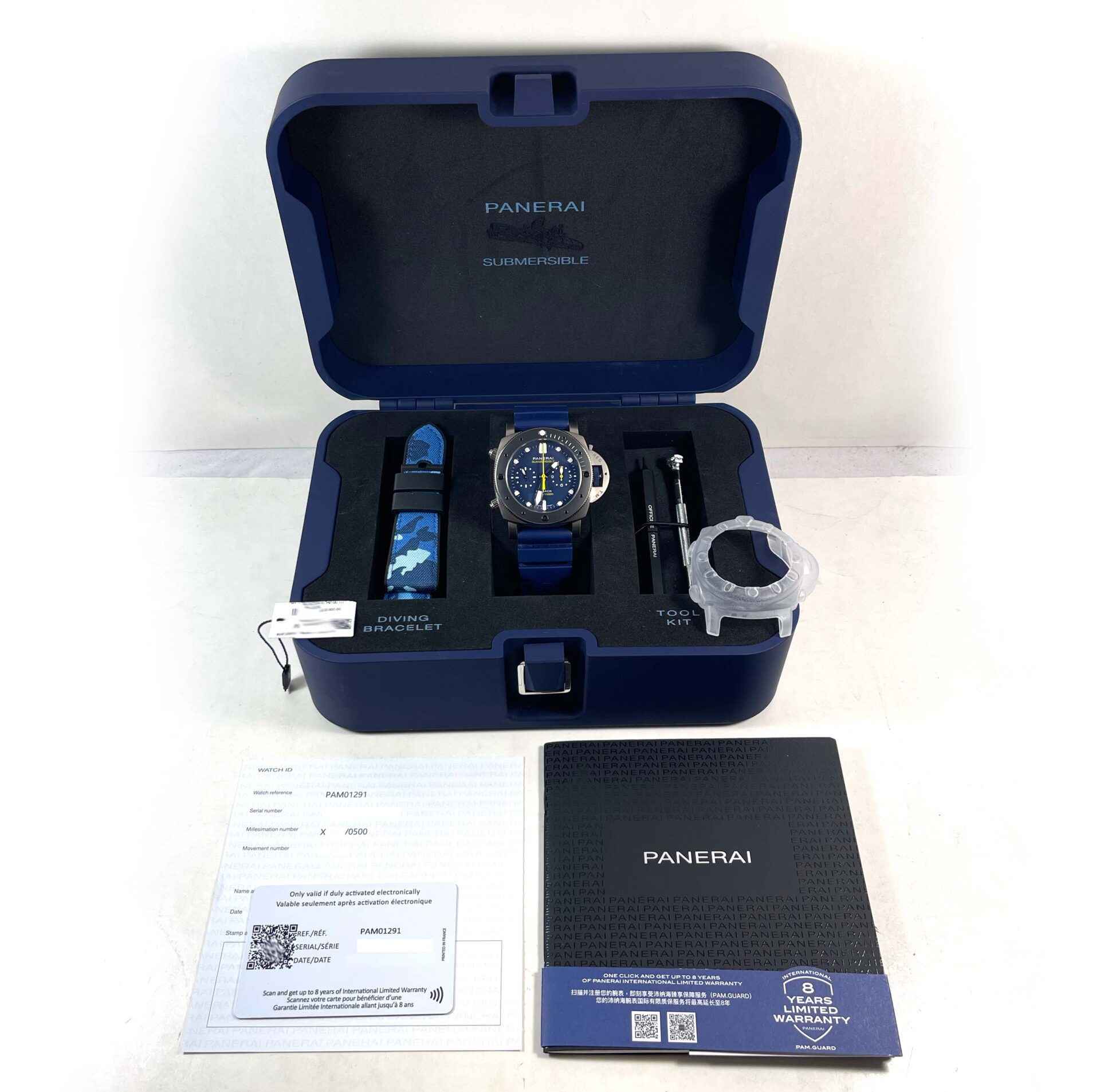 Read Morethis panerai is in mint condition and comes with its box, booklet, bezel protector, panerai tools, one additional blue camouflage strap, and warranty card as shown in the pictures attached. This watch features a 47mm titanium case that surrounds a blue dial and comes on a blue panerai strap. This watch is in stock and available to ship immediately!