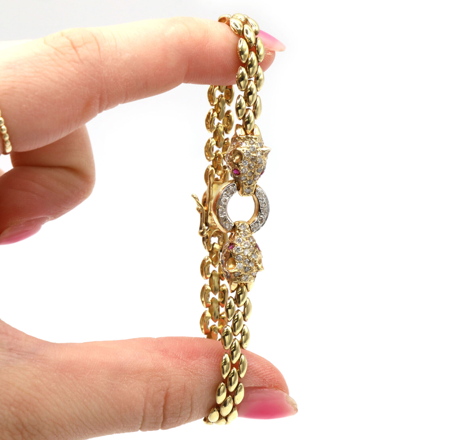 metal: 14k yellow gold gemstone: diamond and ruby diamond carat weight: approximately 0.50 carat ruby carat weight: 0.08 carat cut: round width: 12mm length: 7.5 inches weight: 14.4 grams
