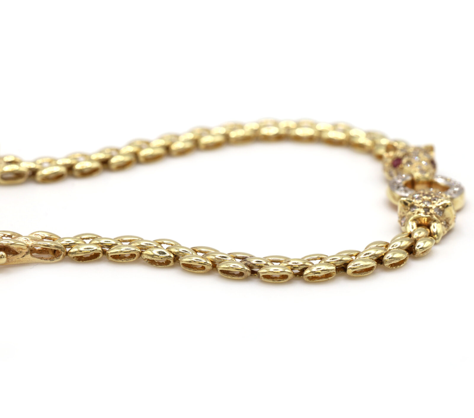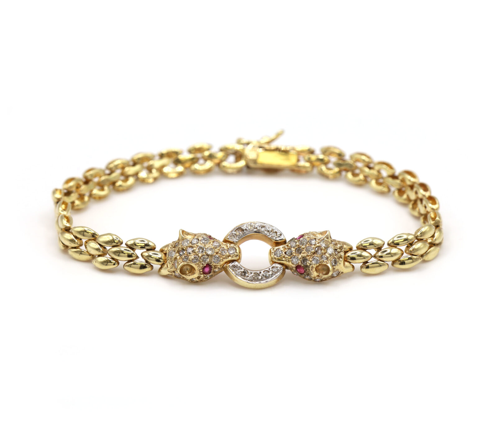 Metal: 14k Yellow Gold Gemstone: Diamond and Ruby Diamond Carat Weight: Approximately 0.50 Carat Ruby Carat Weight: 0.08 Carat Cut: Round Width: 12mm Length: 7.5 Inches Weight: 14.4 Grams