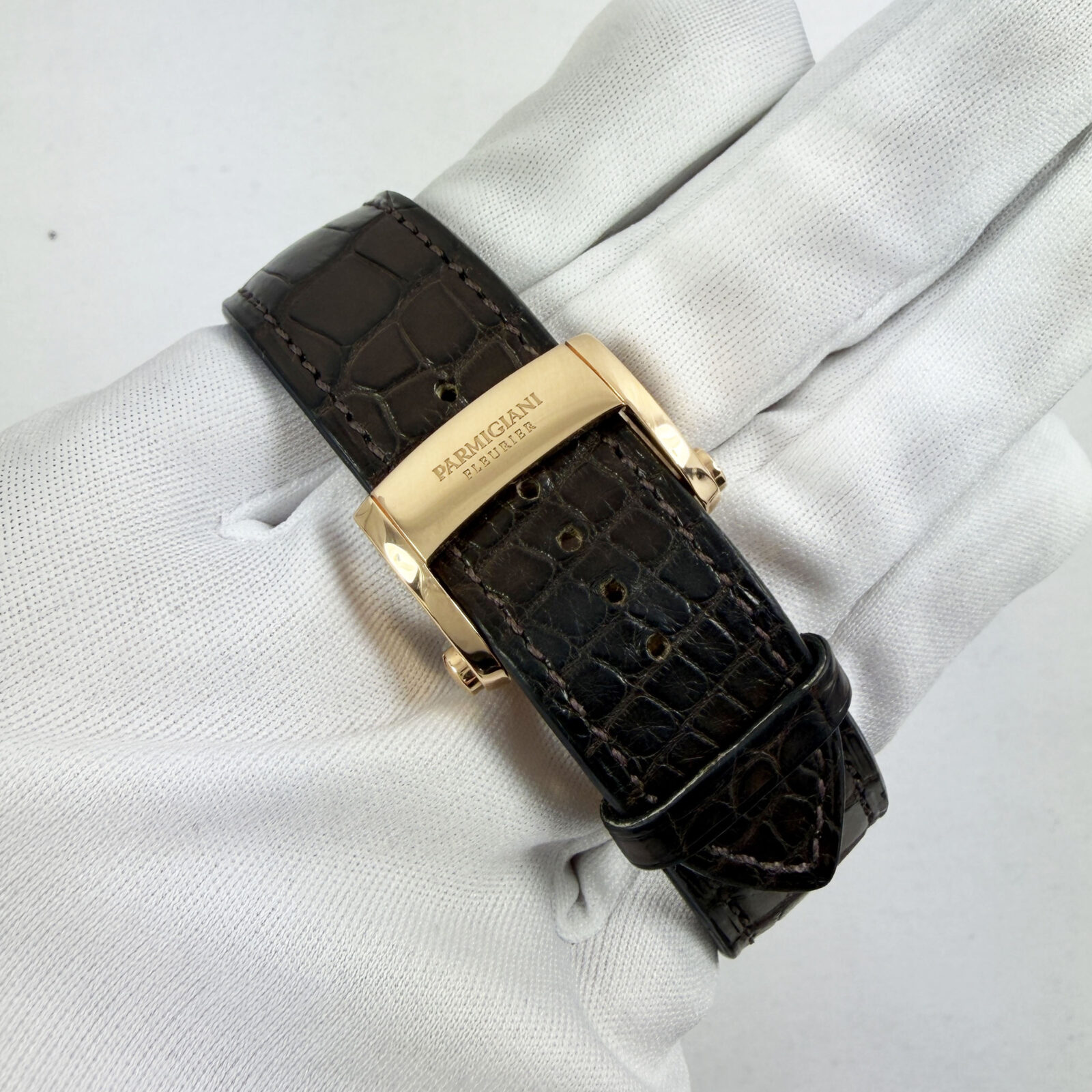 This Parmigiani watch comes with its box and warranty paper. The photos shown are of the exact watch being sold and accurately represent its condition. This watch is in stock and ready to ship immediately!
