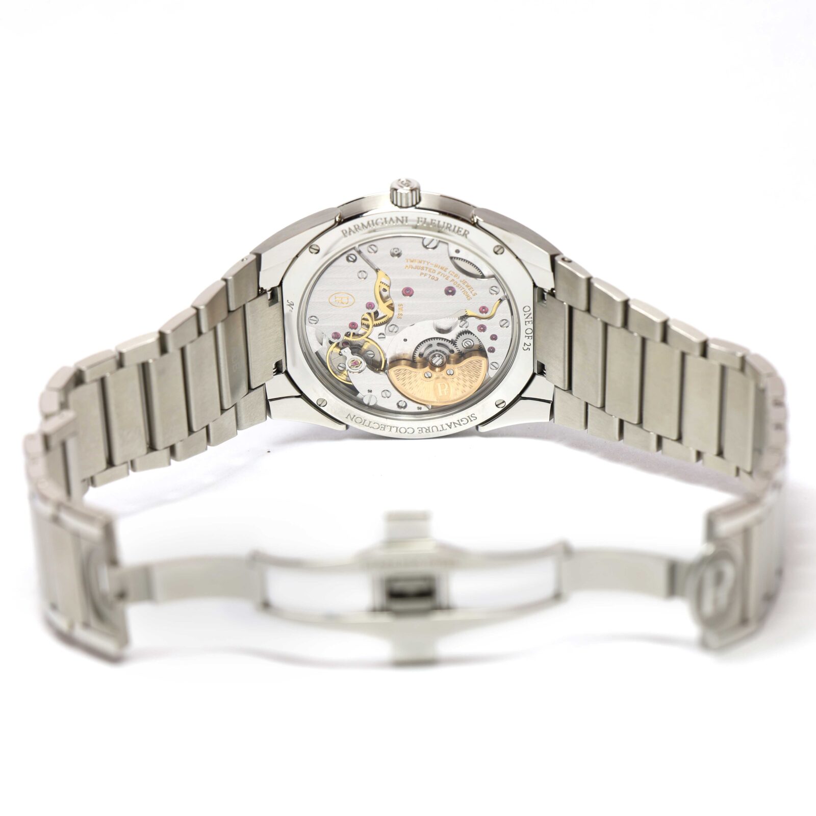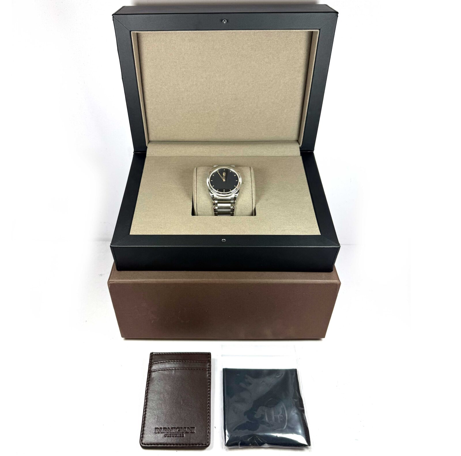 Read Morethis parmigiani watch is new and comes with its box and branded wallet only, as shown in the pictures attached. It is part of a very limited edition of only 25 pieces produced in this model. The micro-rotor, hour markers, hands, and pf logo are crafted in rose gold, rather than steel as seen on the standard version. This watch is in stock and available to ship immediately!