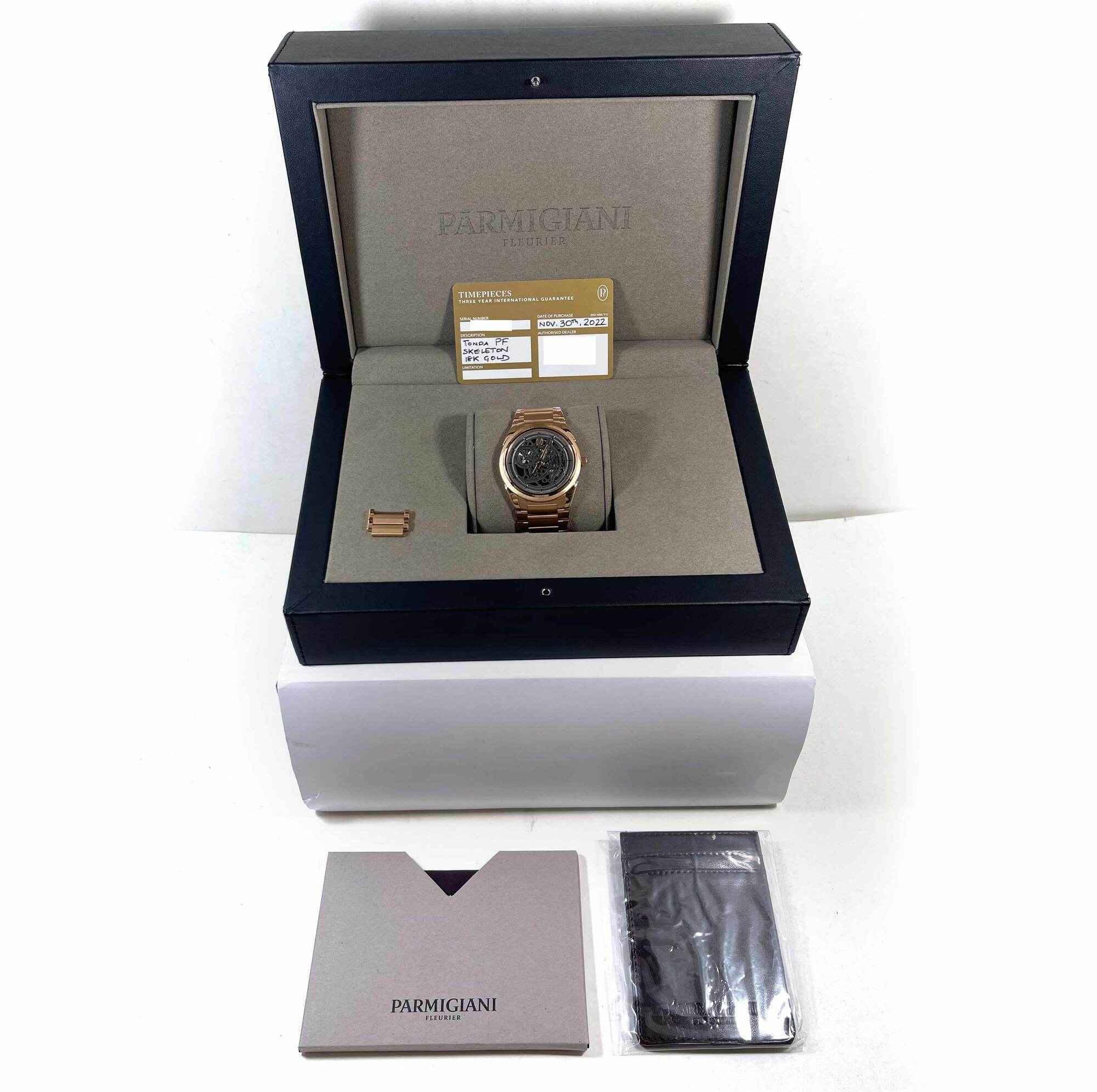 THIS PARMIGIANI IS IN 9.9/10, UNPOLISHED CONDITION AND COMES WITH ITS BOX, SPARE LINKS, PARMIGIANI BRANDED WALLET/MICROFIBER CLOTH, AND WARRANTY CARD DATED NOVEMBER 30TH, 2022 AS SHOWN IN THE PICTURES ATTACHED. THIS WATCH FEATURES A 40MM 18K ROSE GOLD CASE ...