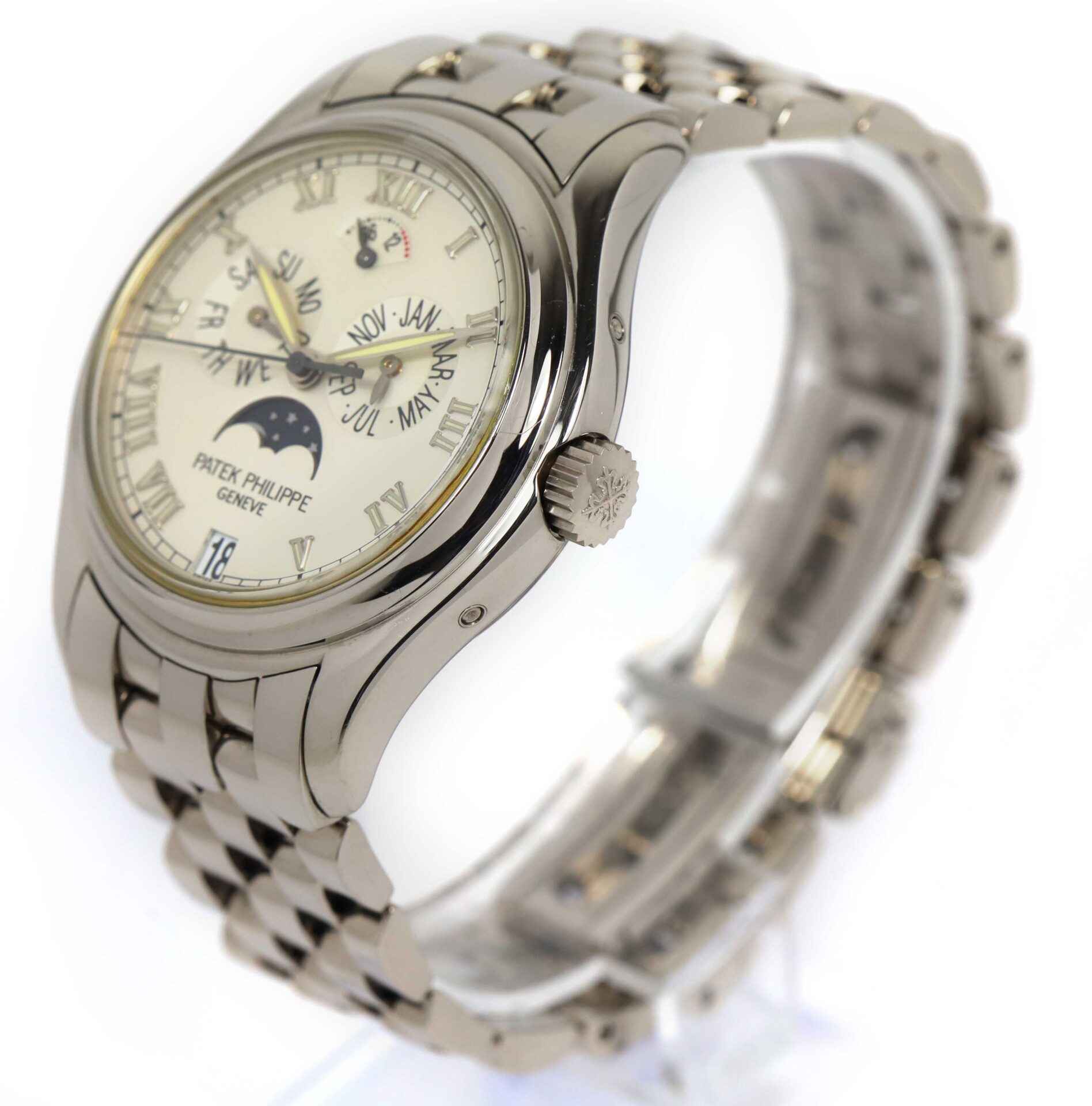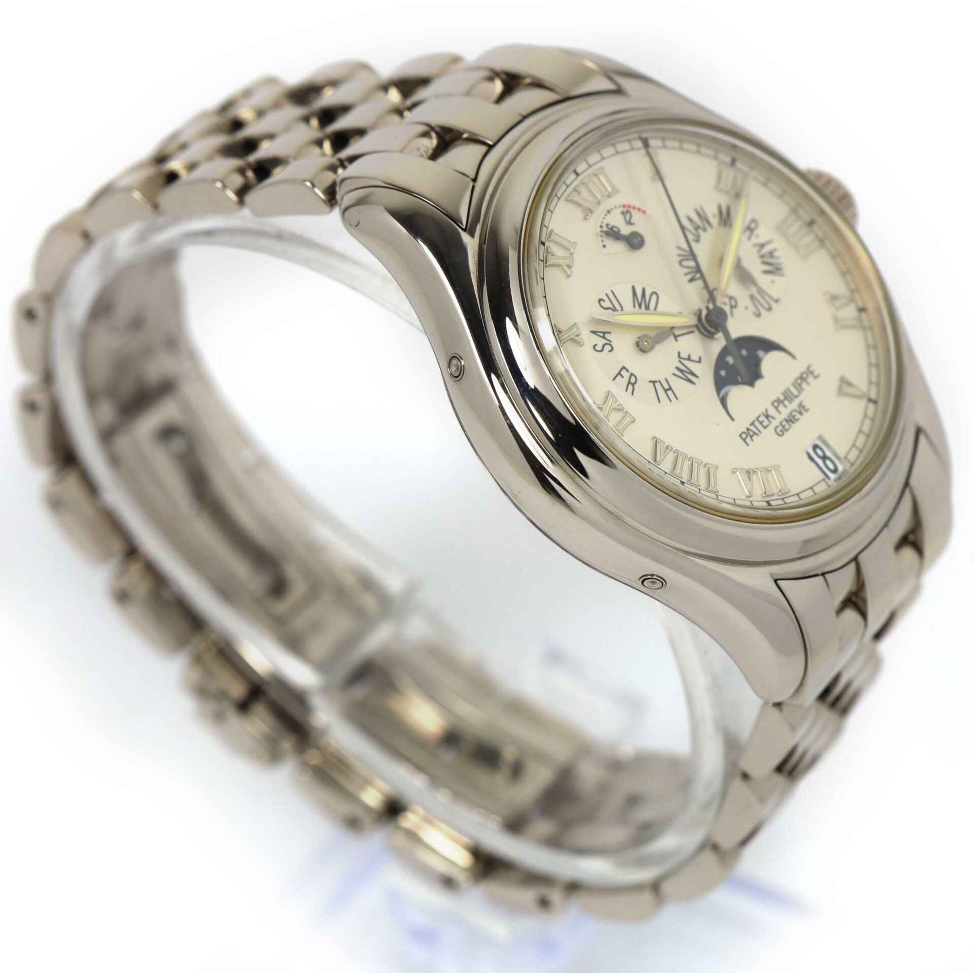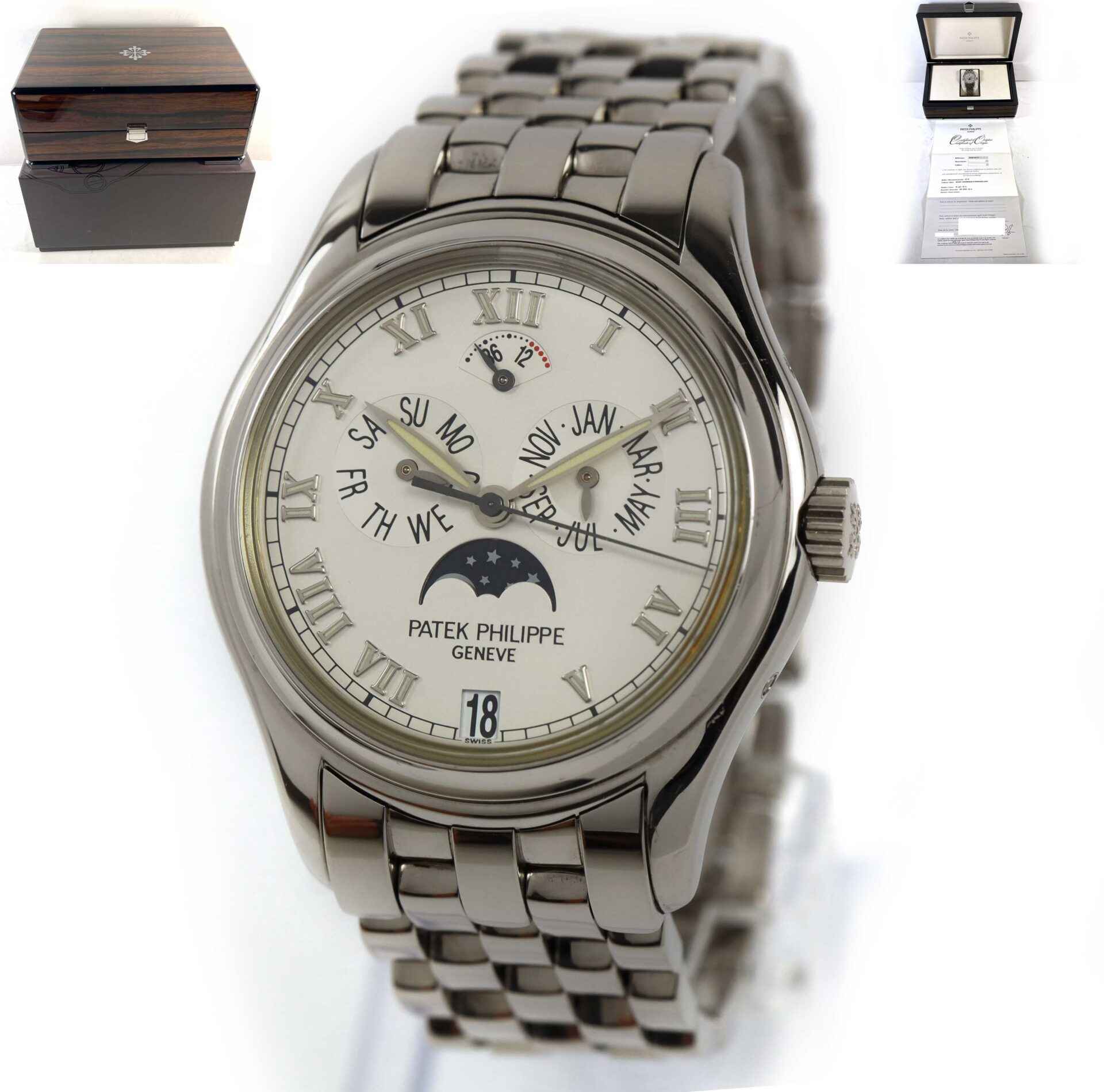 Read Morethis patek is in excellent condition and comes with its box and warranty paper as shown in the pictures attached. this watch features a 37mm white gold case that surrounds a silver dial and comes on an 18k white gold bracelet. The functions of this watch include hours, minutes, seconds, day, date, month, annual calendar, power reserve indicator and moon phase.