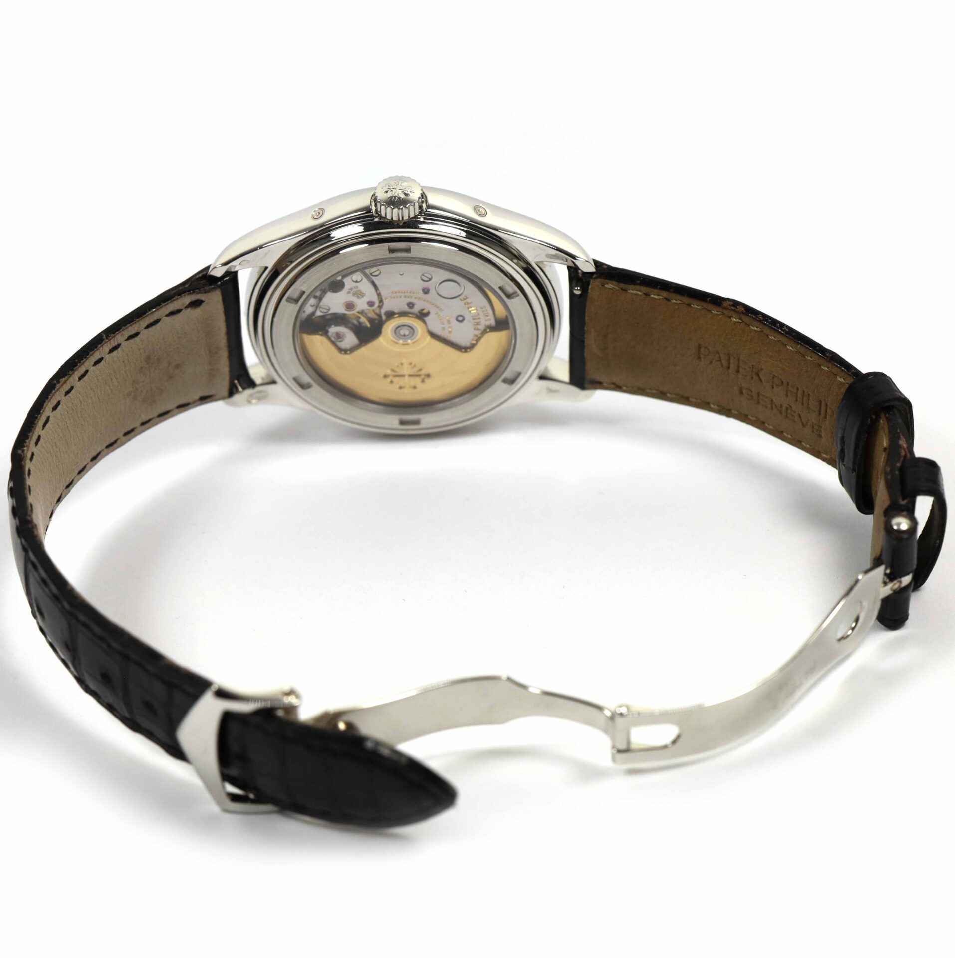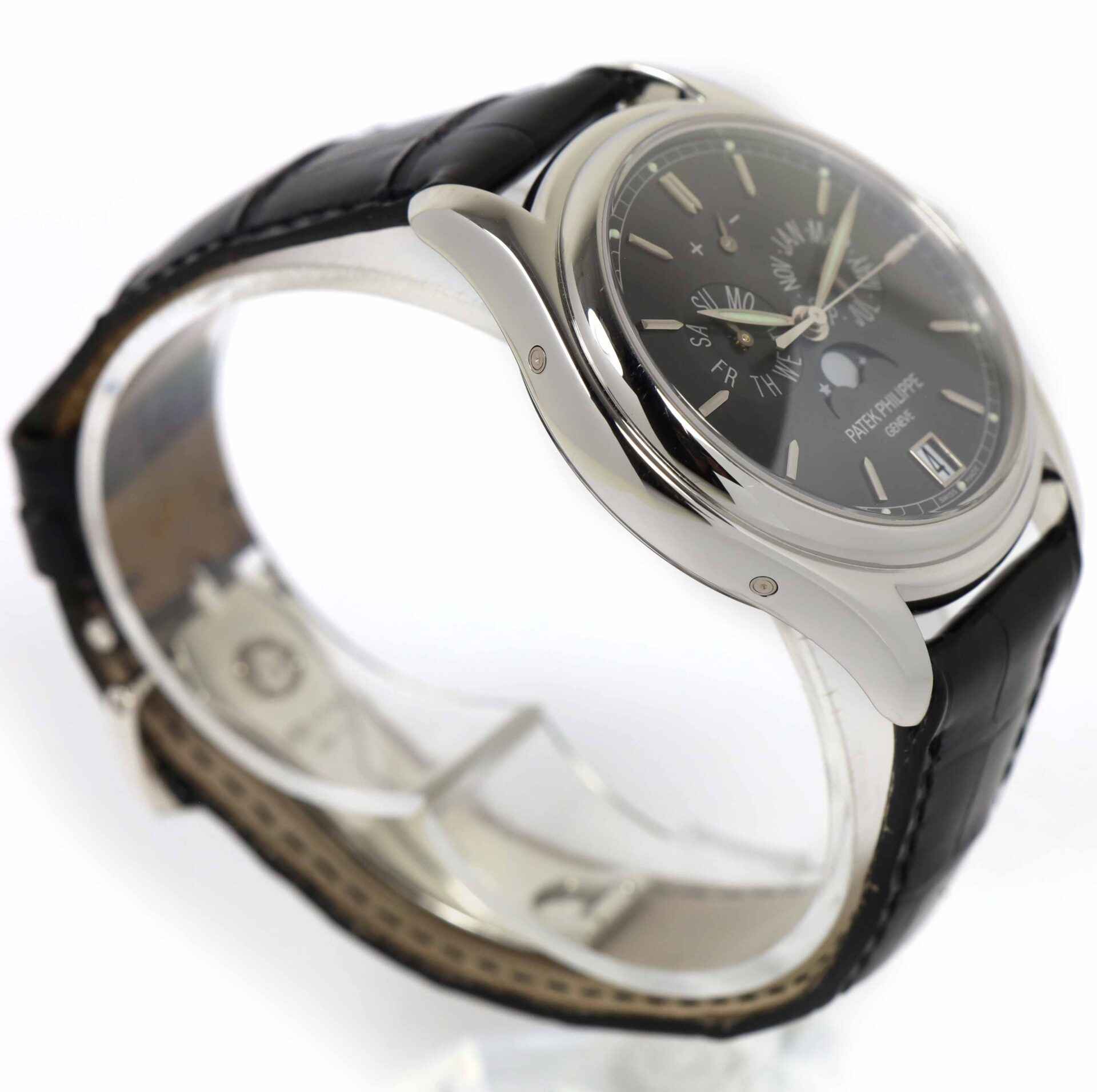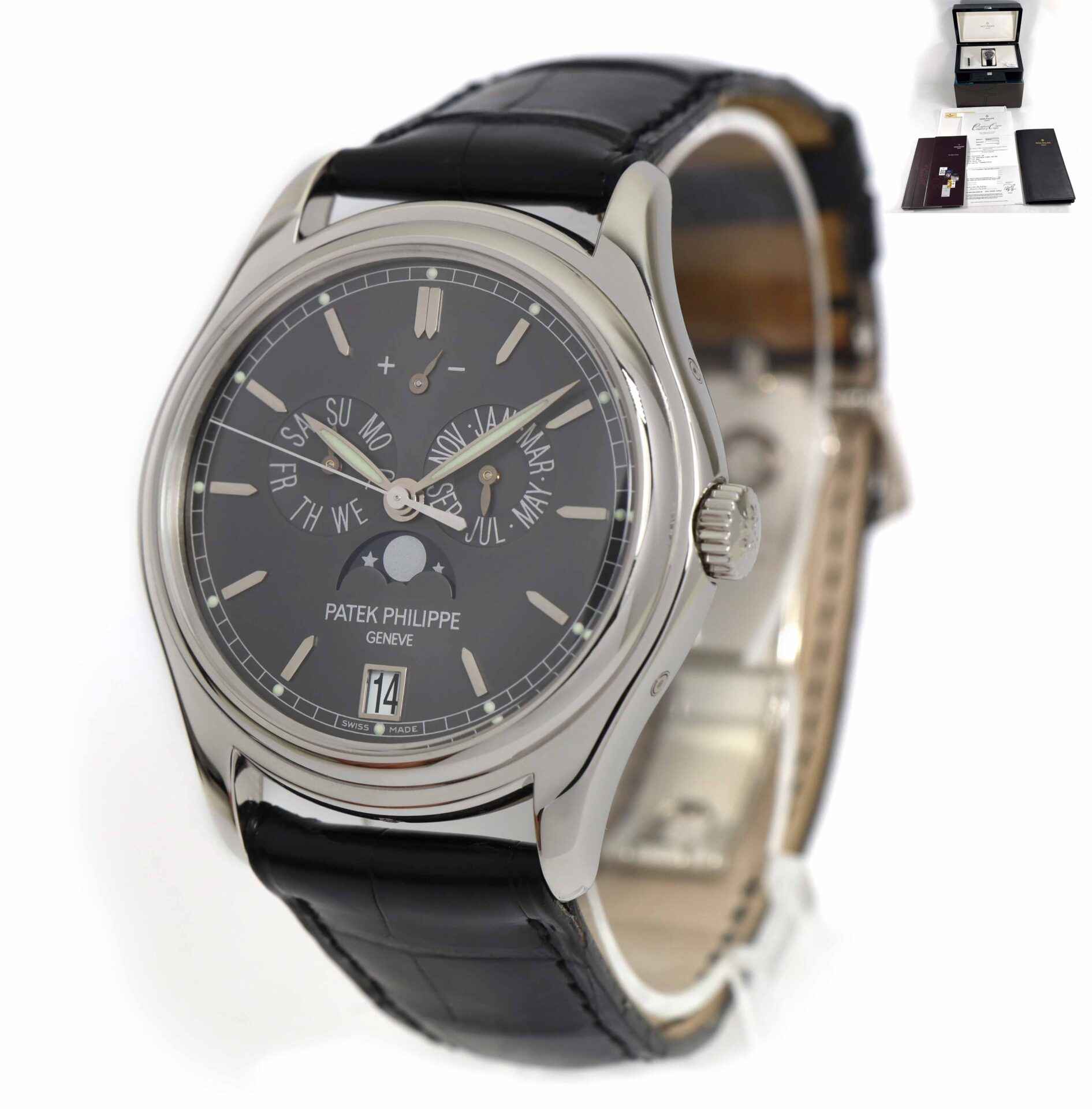 Read Morethis patek philippe is in excellent condition and comes with its box, papers, patek tool, hang tag, and warranty papers dated august 19th, 2009. This watch features a platinum case that surrounds a grey dial displaying the hour, day, date, month, and moonphase. This watch is in stock and available to ship immediately!