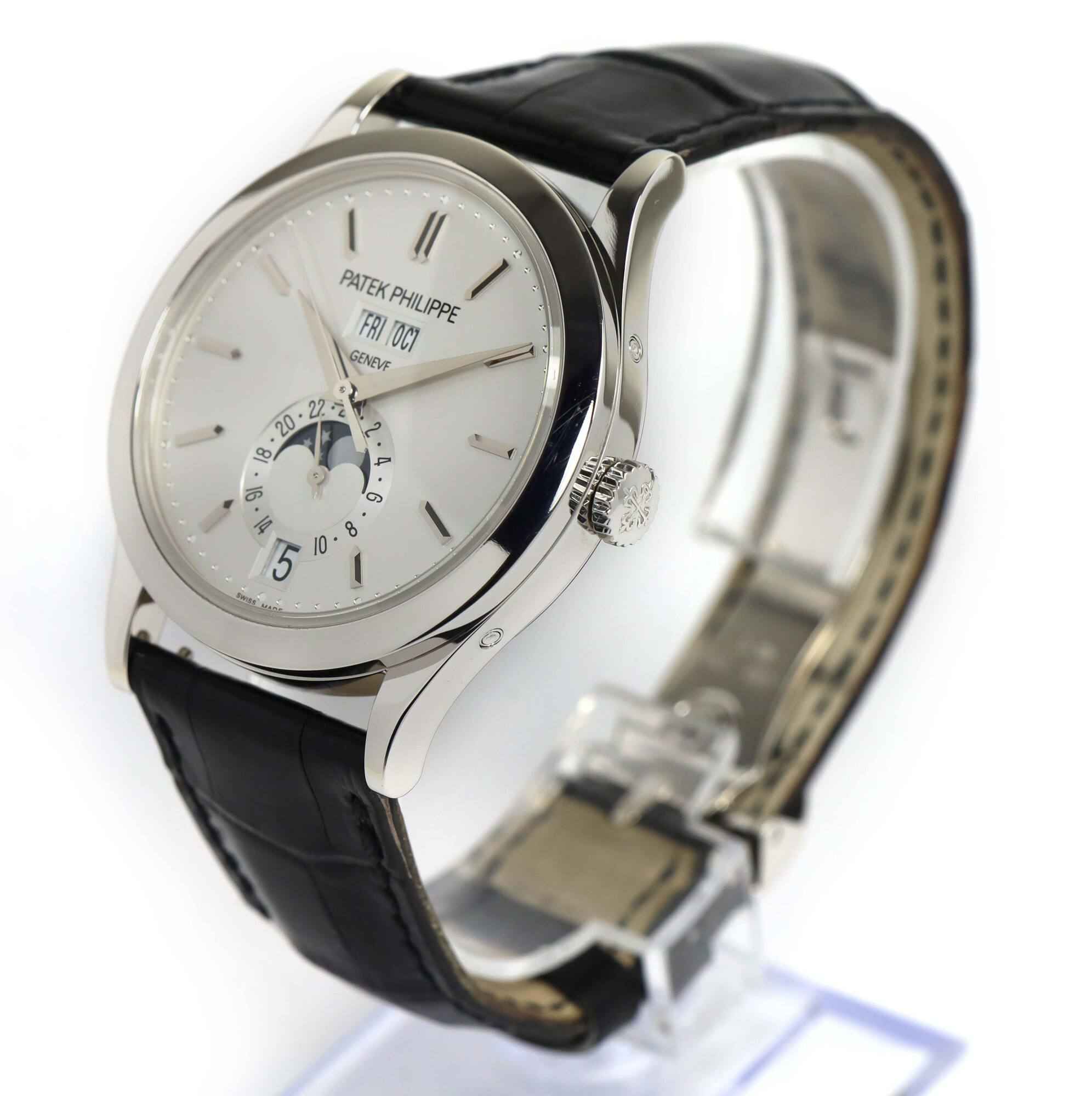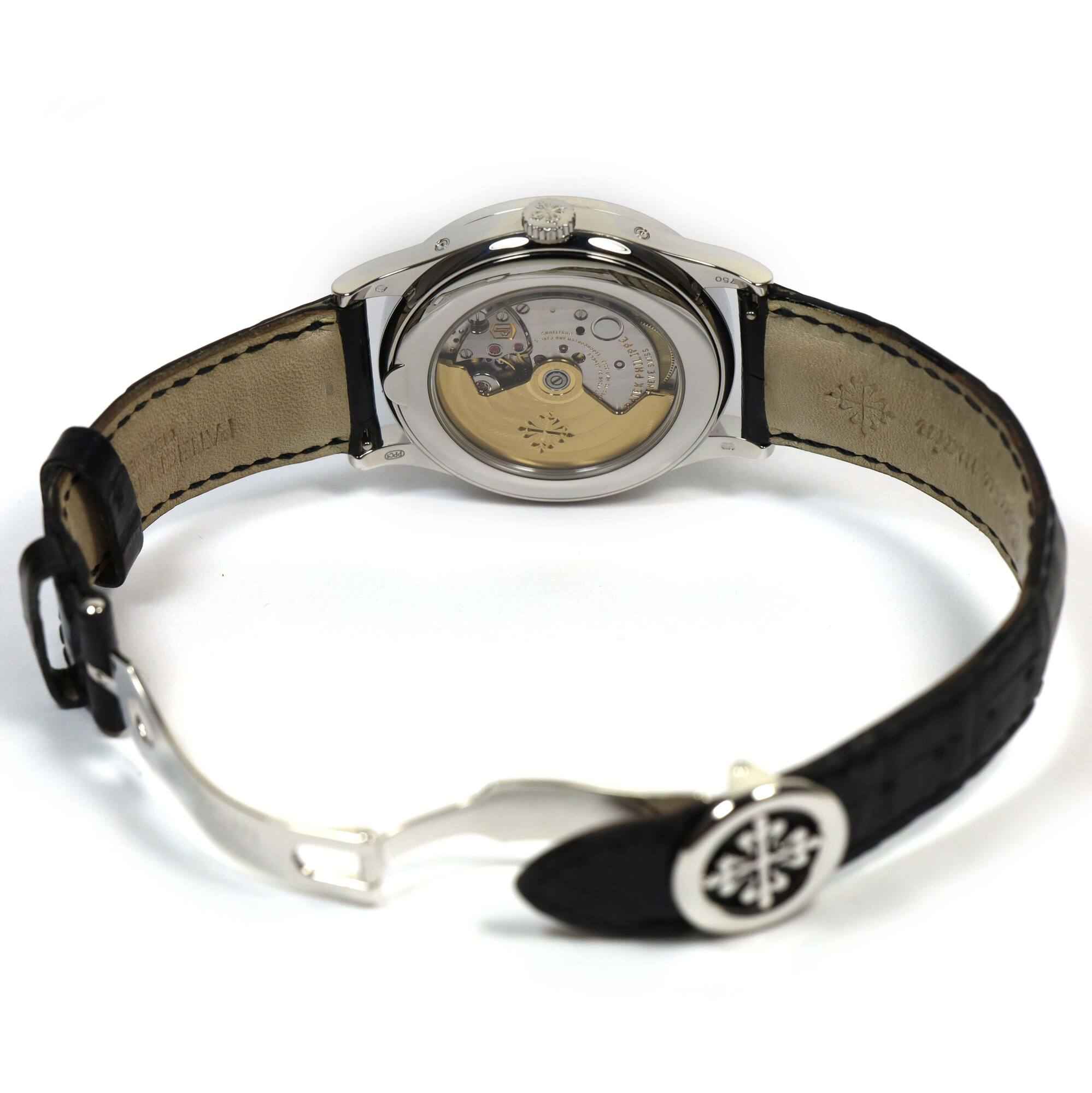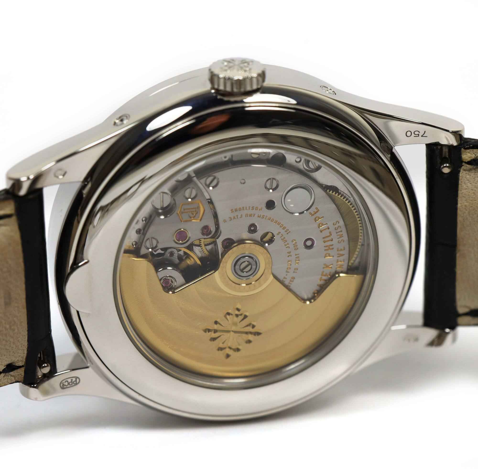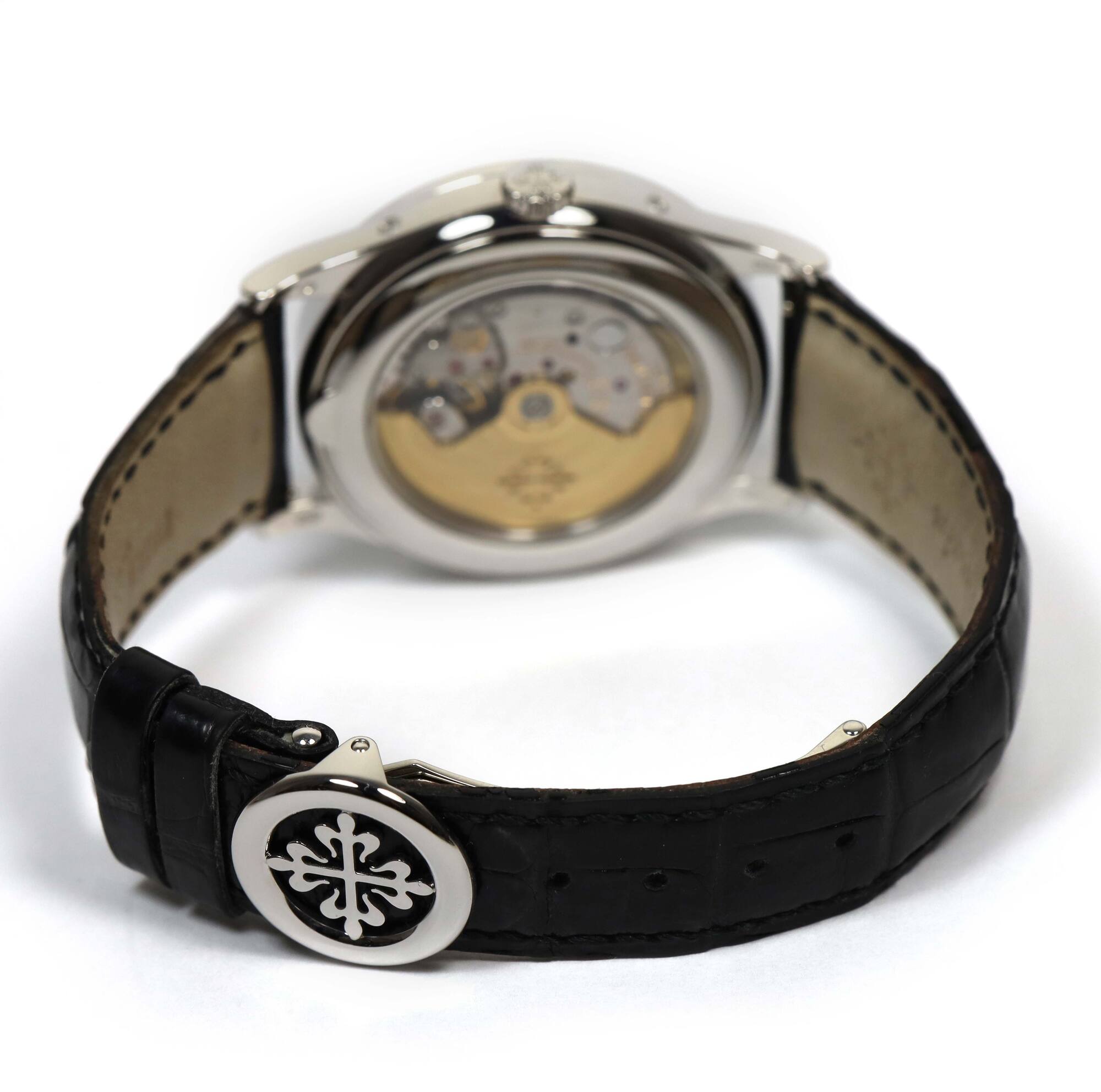 THIS PATEK IS IN EXCELLENT CONDITION AND COMES WITH ITS BOX, BOOKLETS, PATEK TOOL, AND WARRANTY CARD DATED MAY 11TH, 2011. THIS WATCH FEATURES A 38.5MM 18K WHITE GOLD CASE SURROUNDING A SILVER DIAL AND COMES ON A BLACK ALLIGATOR STRAP WITH AN 18K WHITE GOLD...