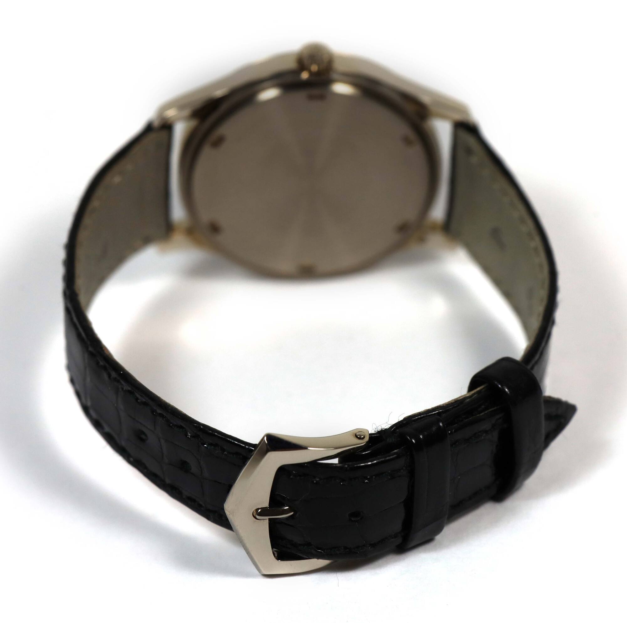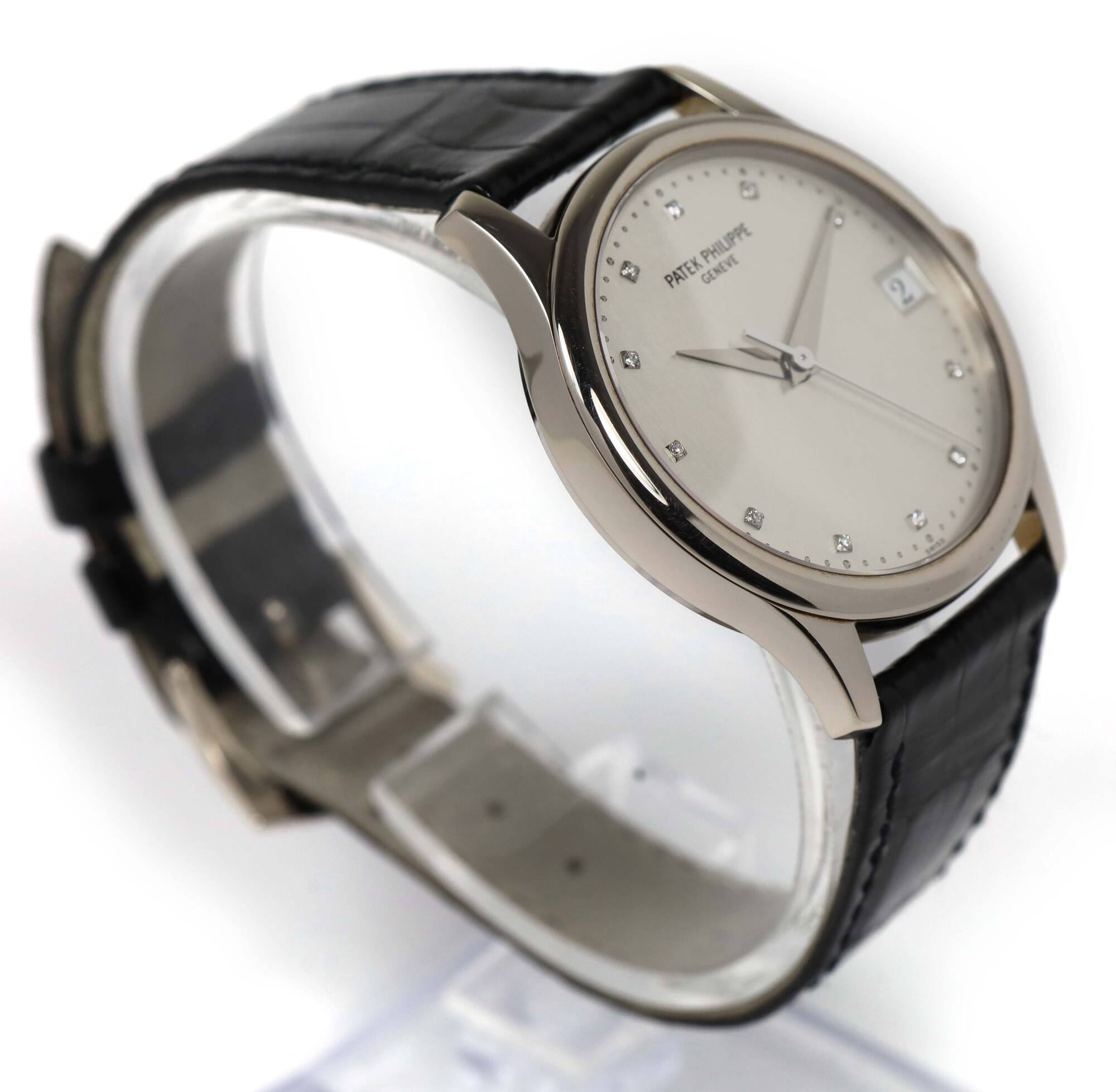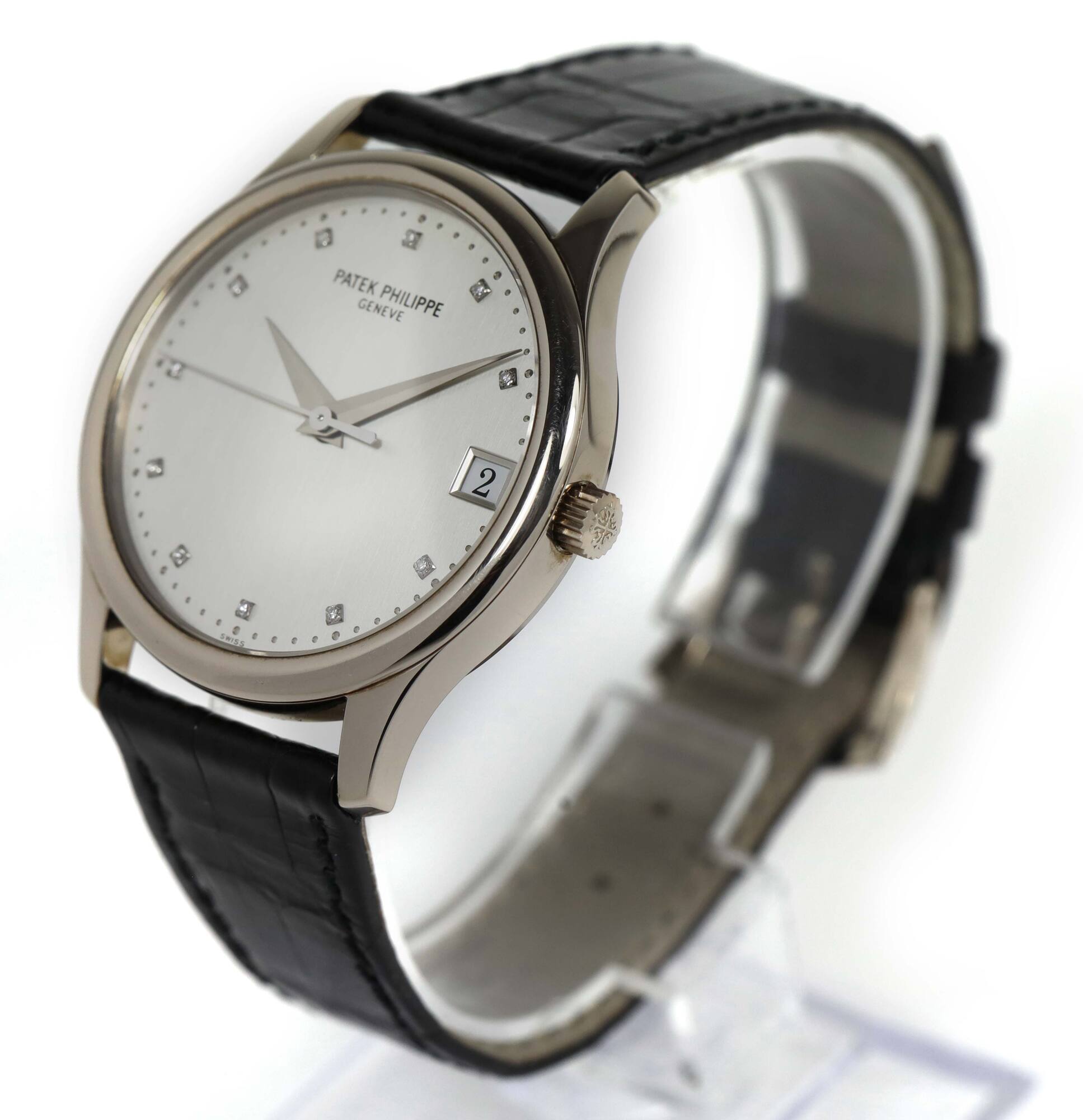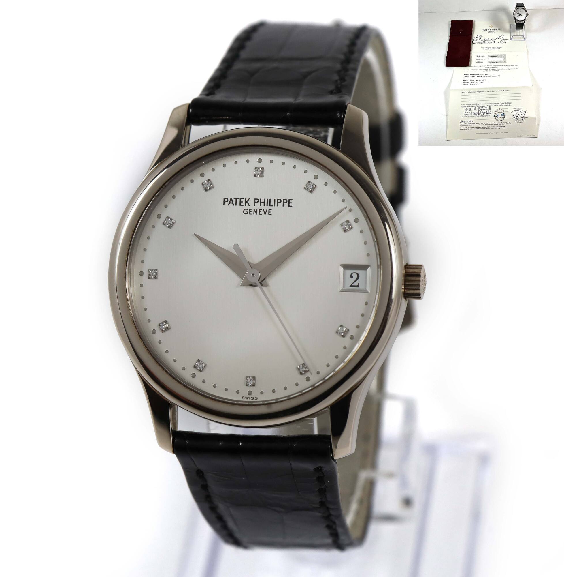 Read Morethis patek is in amazing overall condition, the case shows very minimal scratching and the strap is in perfect condition. It comes with its travel case and warranty paper only as shown in the pictures attached. This watch features a 34mm 18k white gold case surrounding a silver dial and comes on a black alligator strap with an 18k white gold tang buckle. The watch functions include hours, minutes, seconds and date. The paperwork does indicate a stick dial however the previous owner swapped it out for the factory set diamond dial shown that typically comes on the platinum calatrava model. This watch is in stock and available to ship immediately!