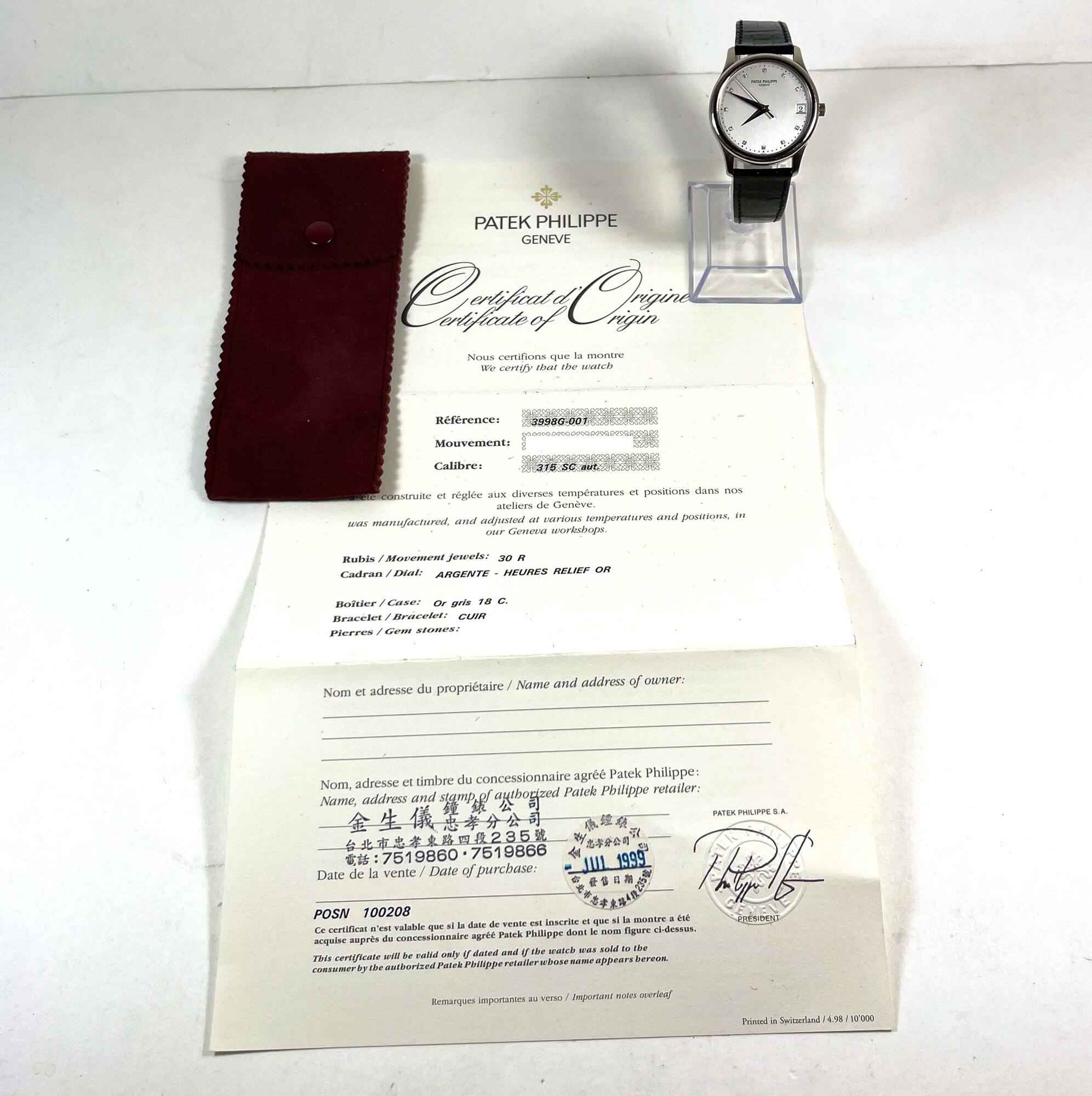 THIS PATEK IS IN AMAZING OVERALL CONDITION, THE CASE SHOWS VERY MINIMAL SCRATCHING AND THE STRAP IS IN PERFECT CONDITION. IT COMES WITH ITS TRAVEL CASE AND WARRANTY PAPER ONLY AS SHOWN IN THE PICTURES ATTACHED. THIS WATCH FEATURES A 34MM 18K WHITE GOLD CASE...