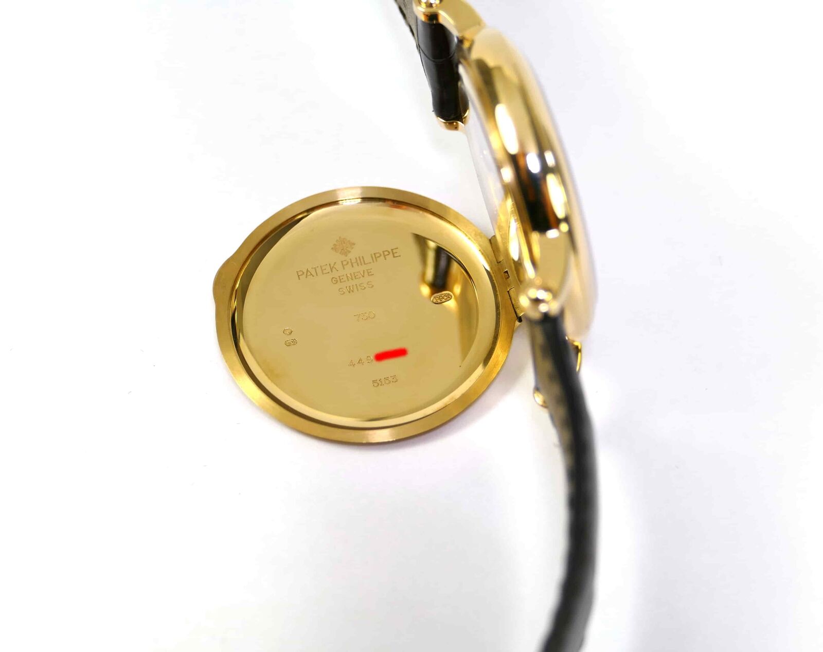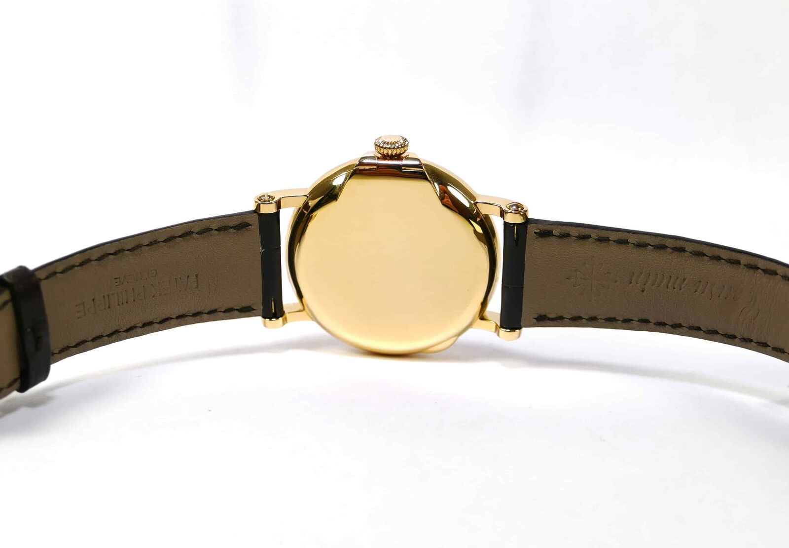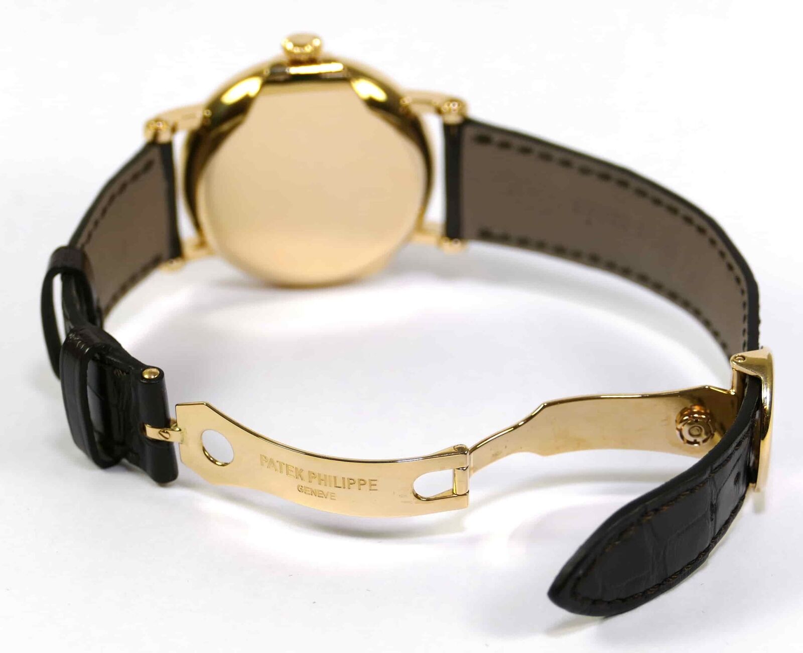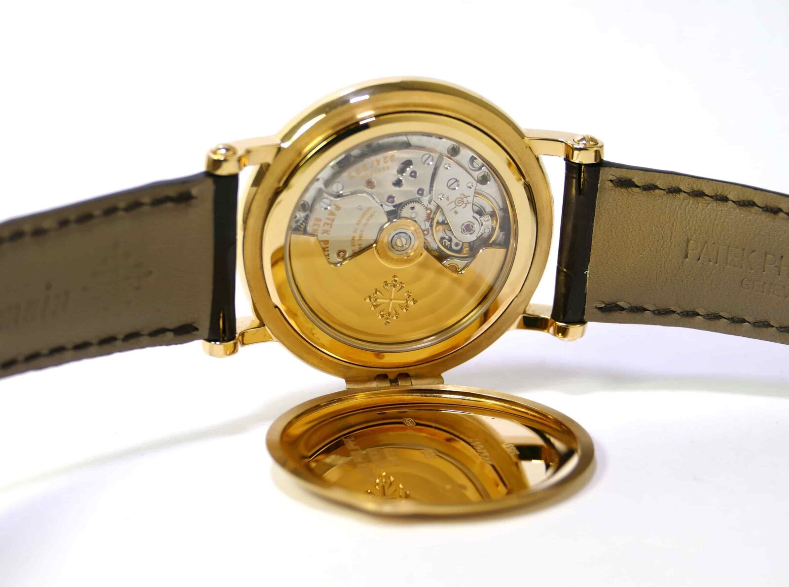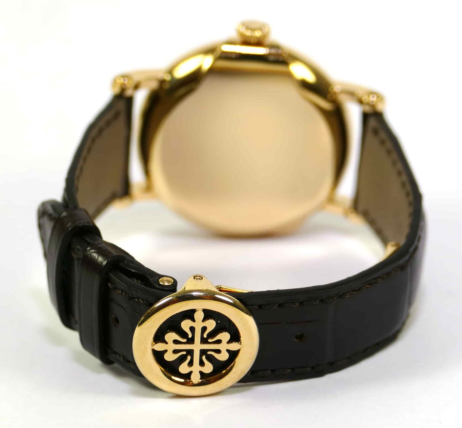 This Patek Philippe Calatrava is in mint condition. The case is mint, and the strap and buckle are unworn. It comes with its original box and papers, as shown in the photos.