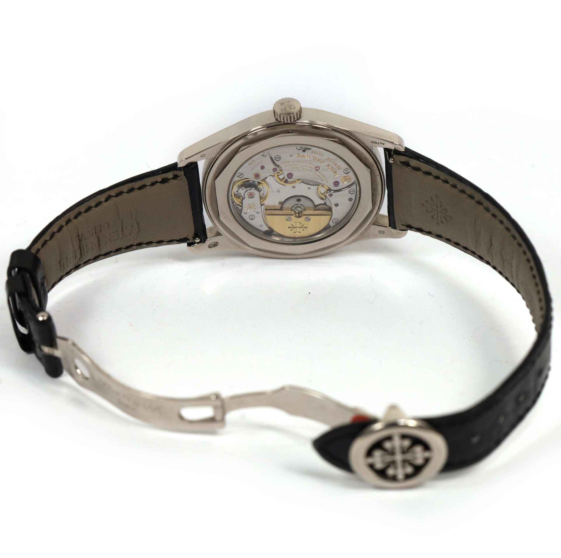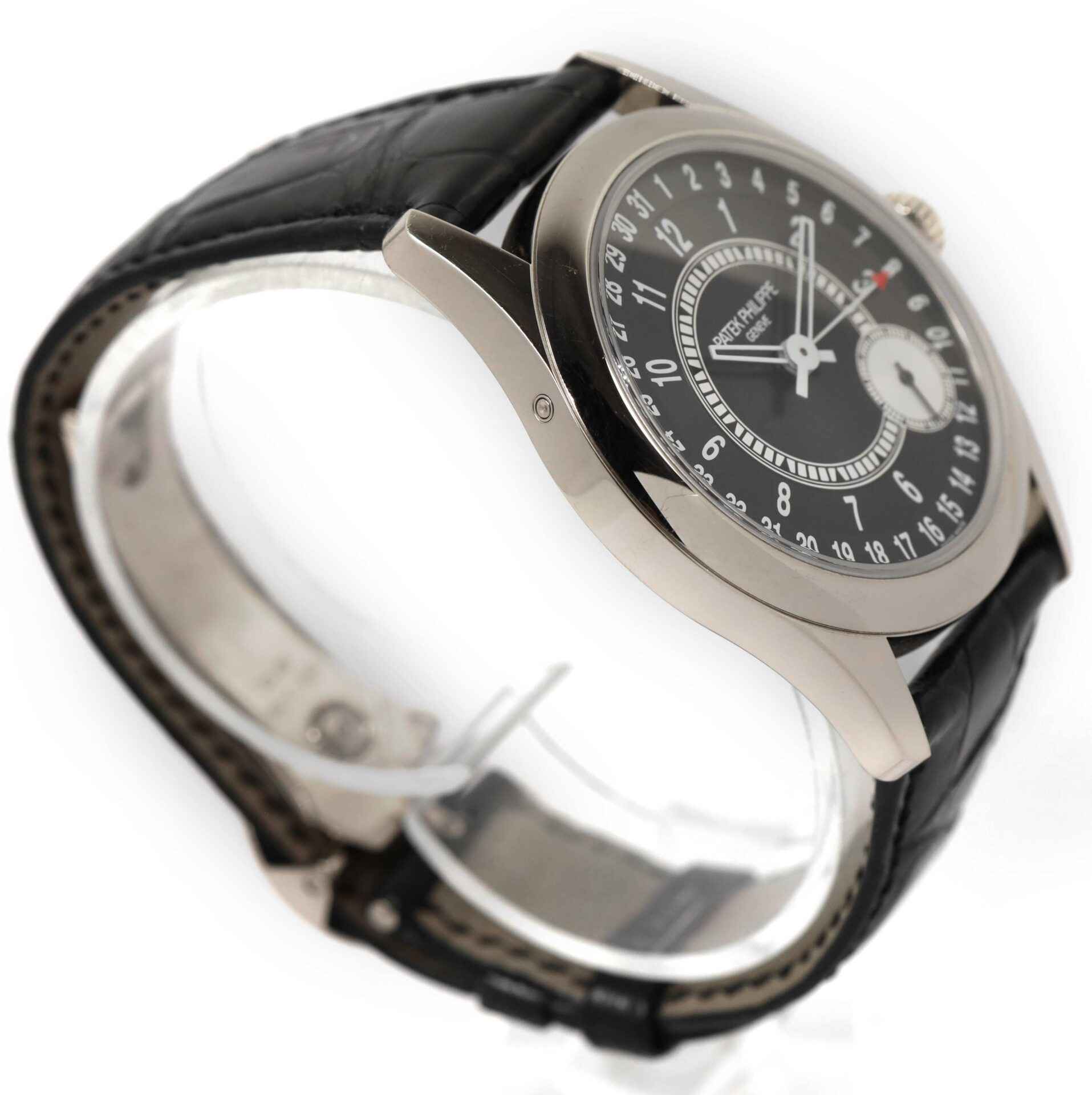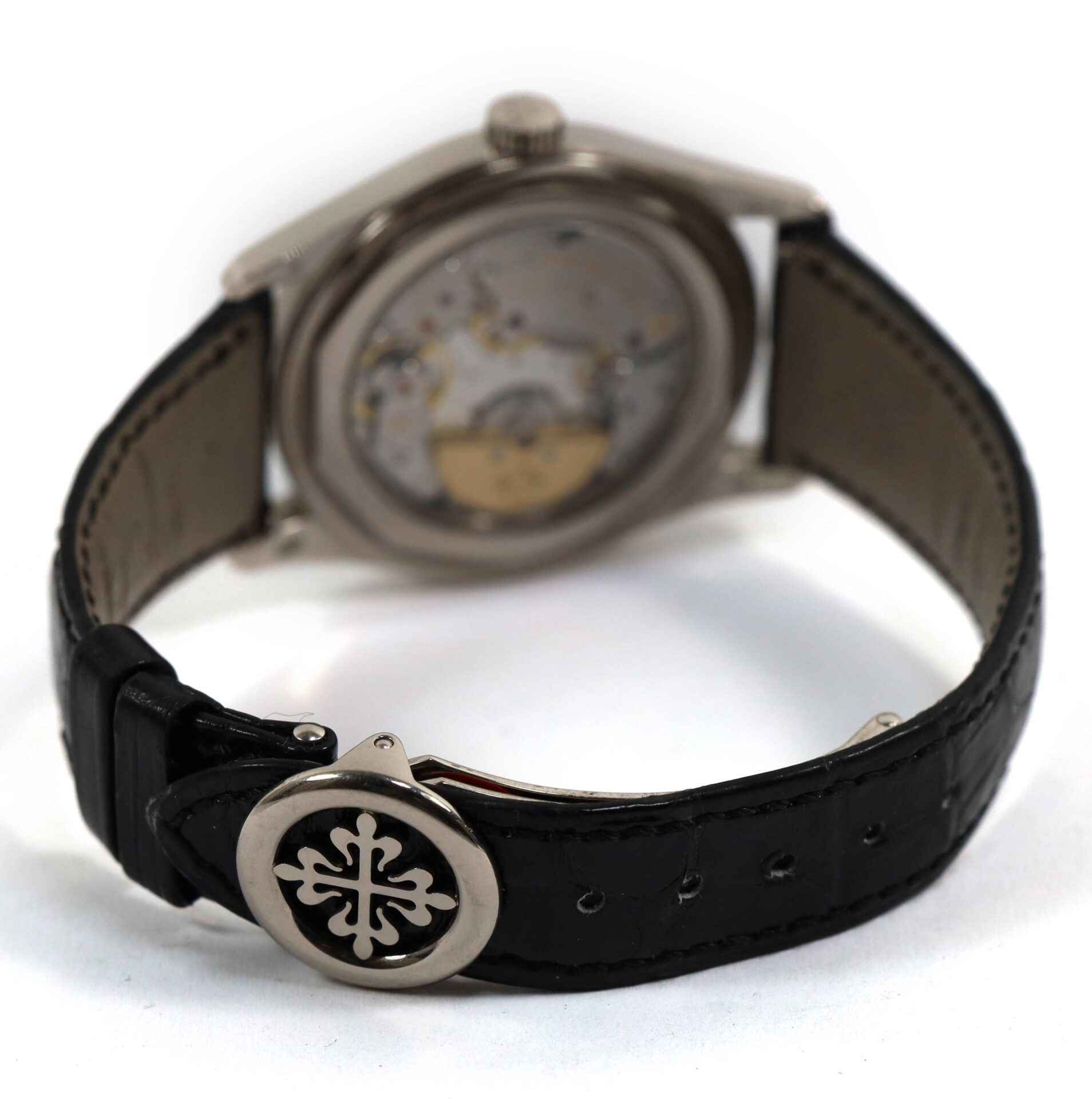 This Patek Philippe is in excellent condition and comes as watch only as shown in the photos attached. This watch features a white gold case that surrounds a black dial and comes on a black leather strap. This watch is i...