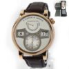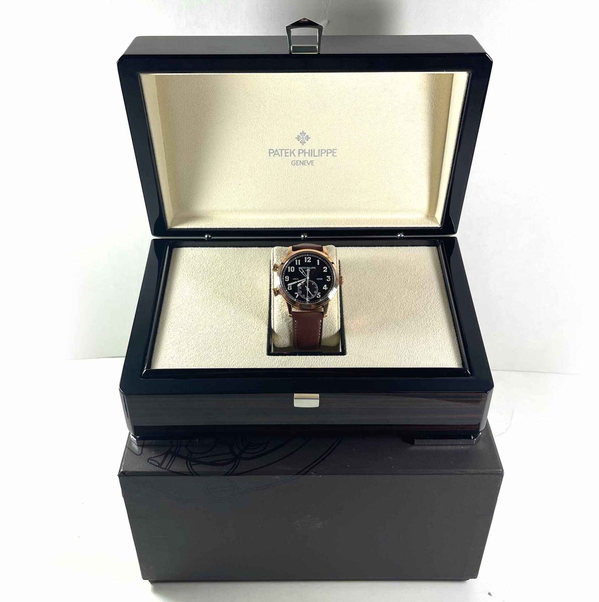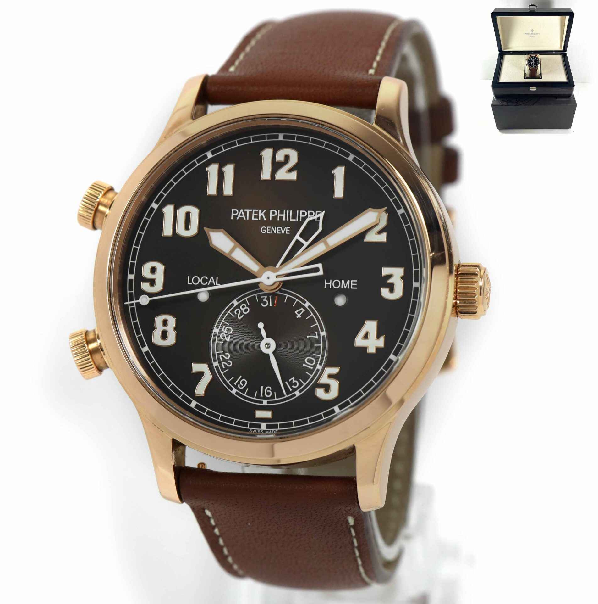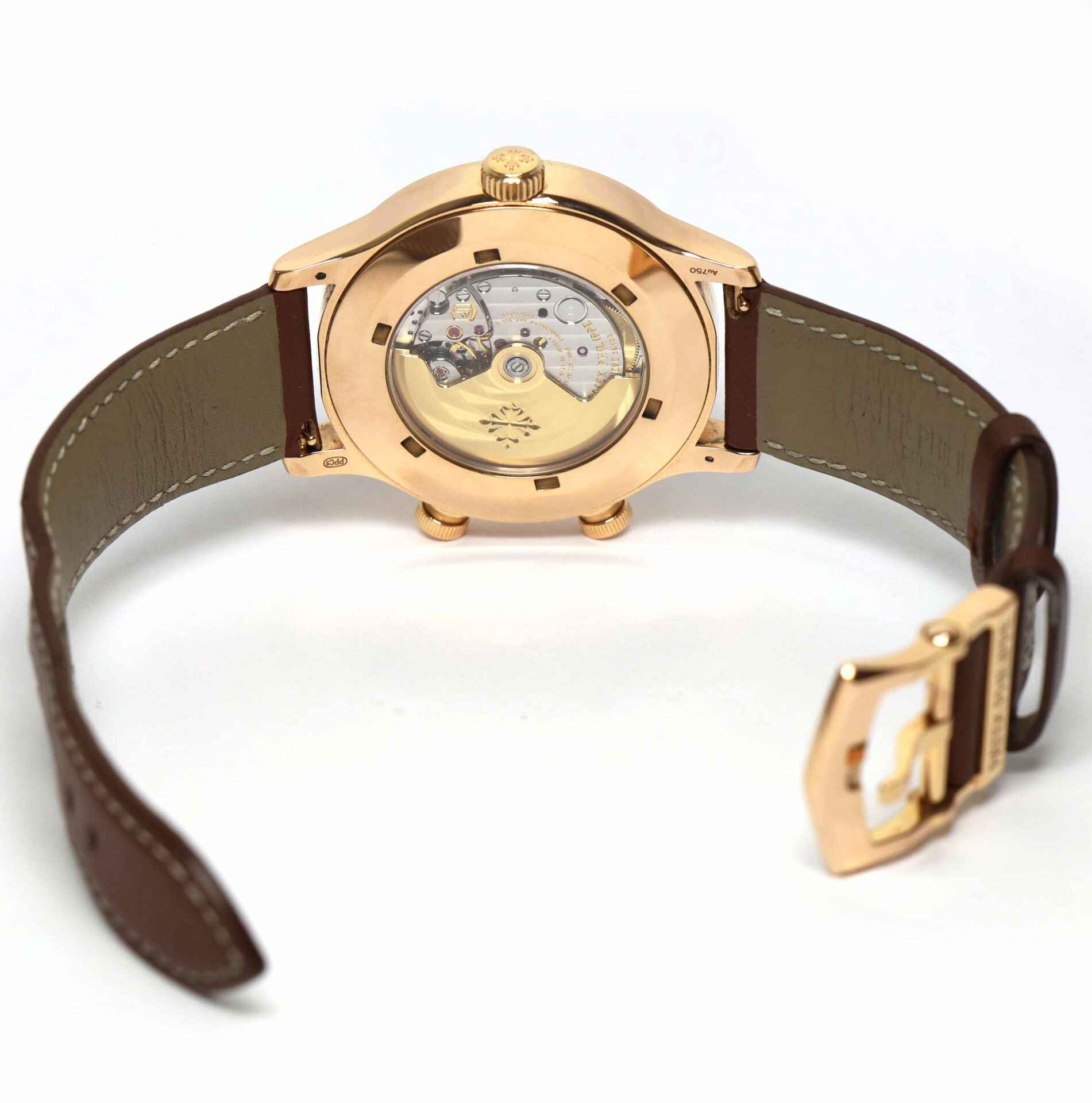 Read Morethis patek philippe is in excellent condition and comes with its box only as shown in the photos attached. This watch features an 18k rose gold case that surrounds a brown sunburst dial and comes equipped with a brown leather strap. The functions of this watch include dual time zone mechanism indicating local and home time, local and home day/night indication in apertures, local date by hand and sweep seconds hand. This watch is in stock and available to ship immediately!