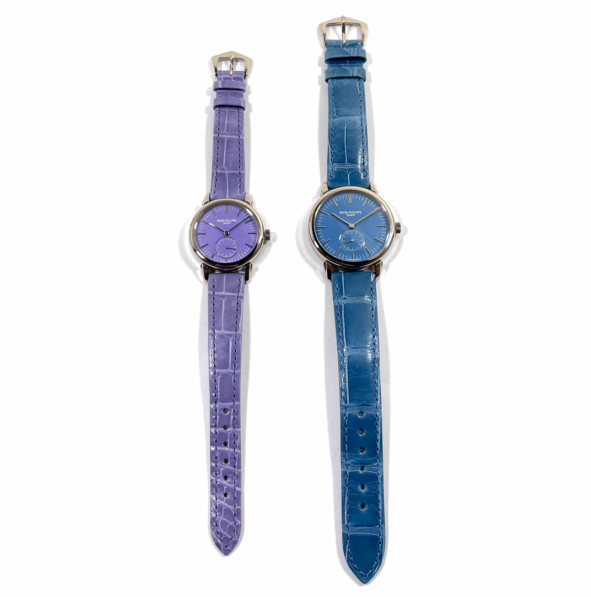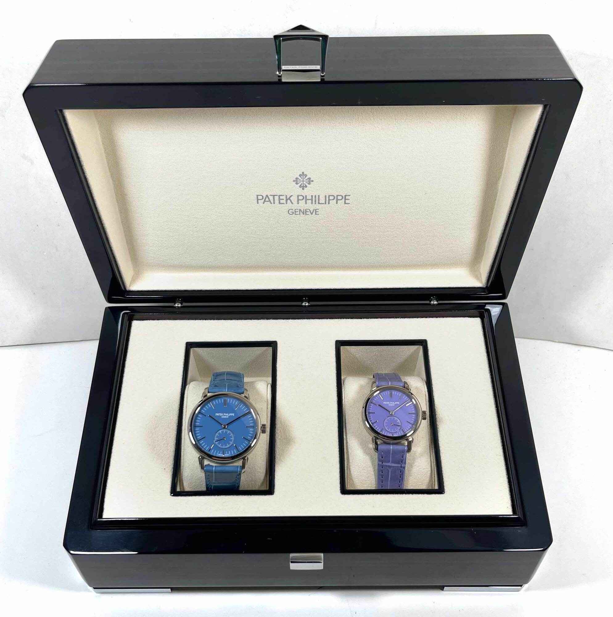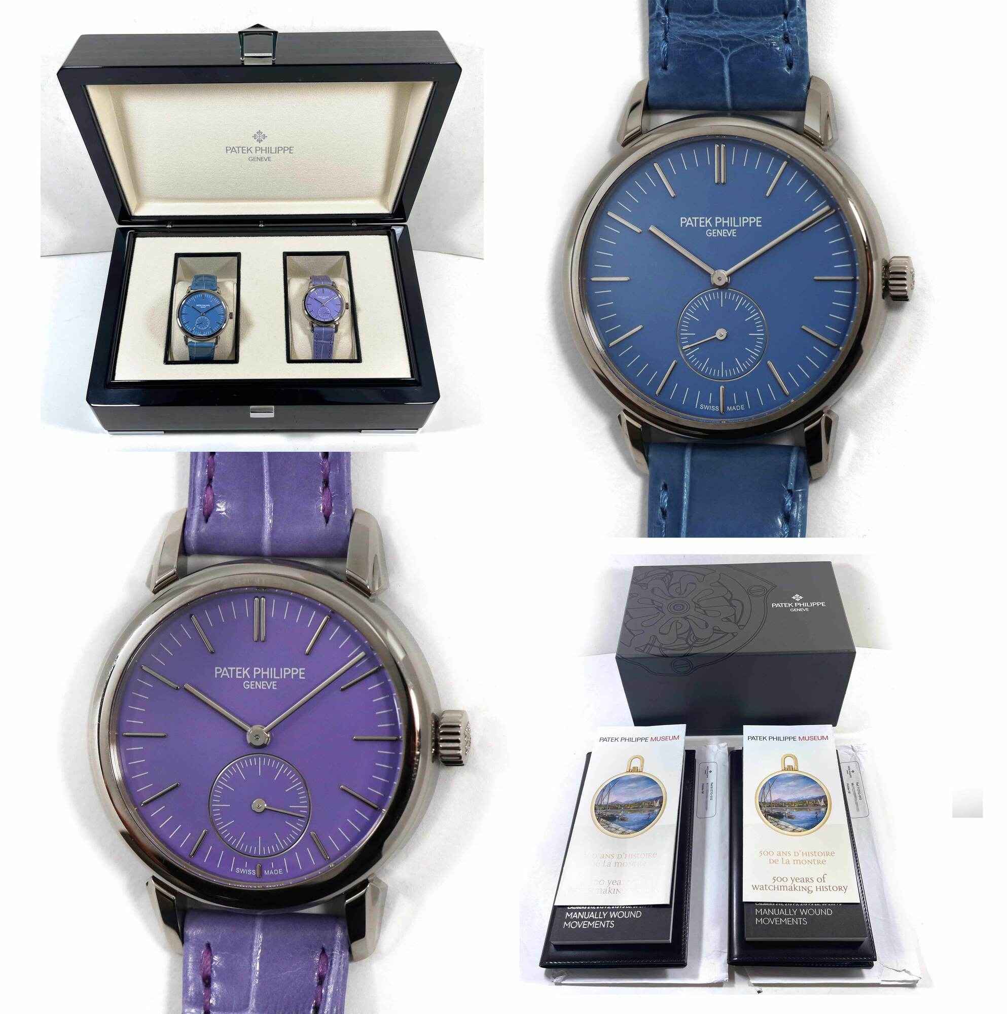 Read Morethese patek philippe watches are both unworn and come with the box and booklets as shown in the pictures attached. This set of “pair watches” were exclusively reserved for the watch art grand exhibition in tokyo 2023 while patek philippe created this limited series that were made available exclusively for the japanese market in late 2022. The 6127g watch features a 36mm white gold case that surrounds a blue dial and comes on a blue leather strap. The 7127g features a 31mm white gold case that surrounds a purple dial and comes on a purple leather strap. This pair of watches is in stock and available to ship immediately!