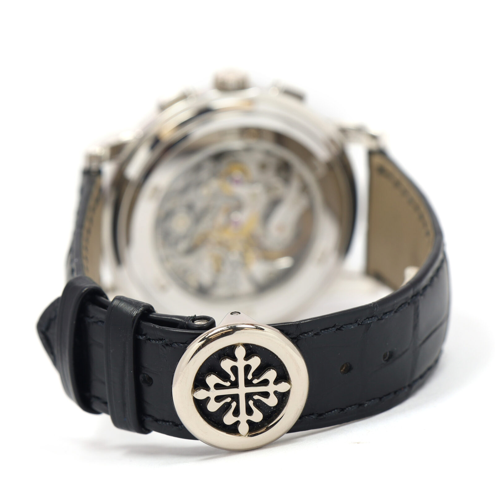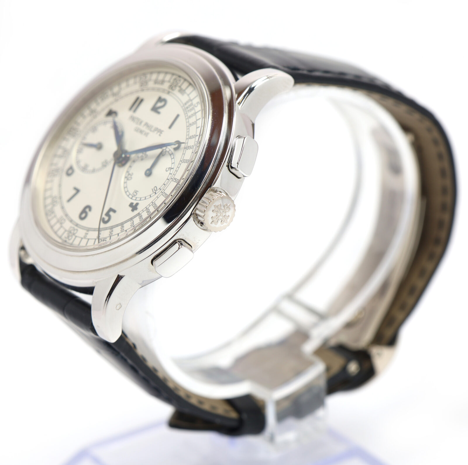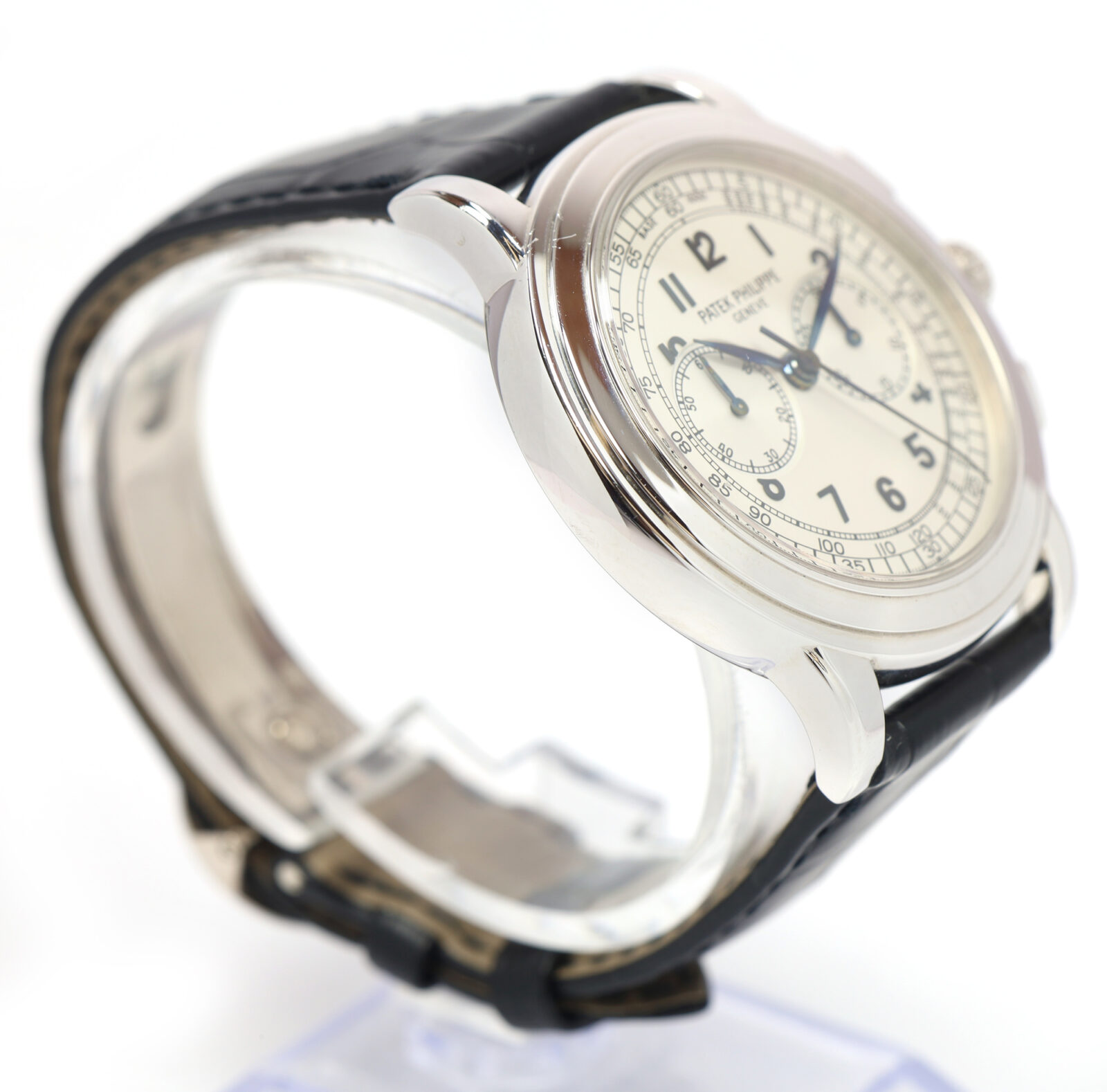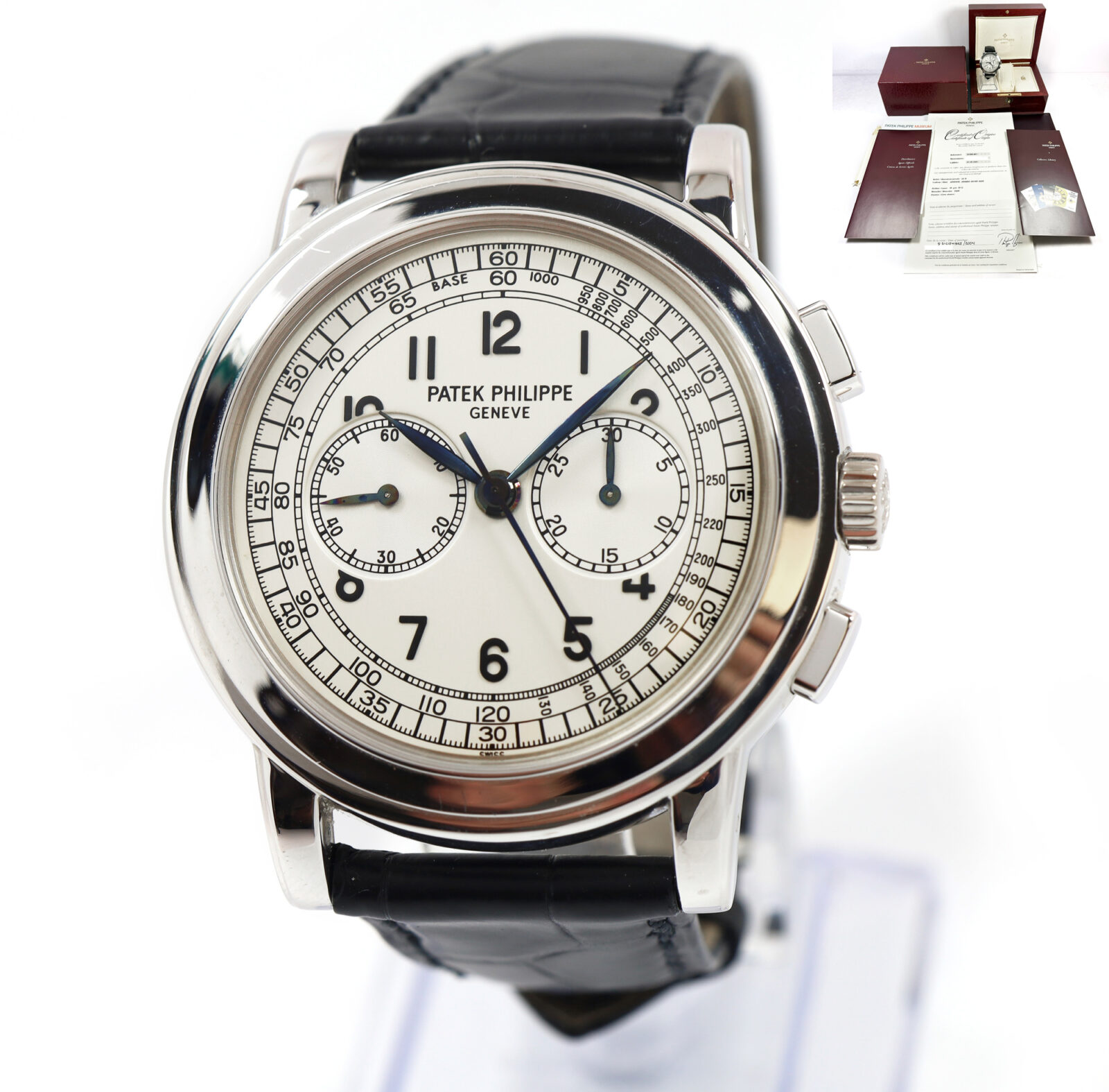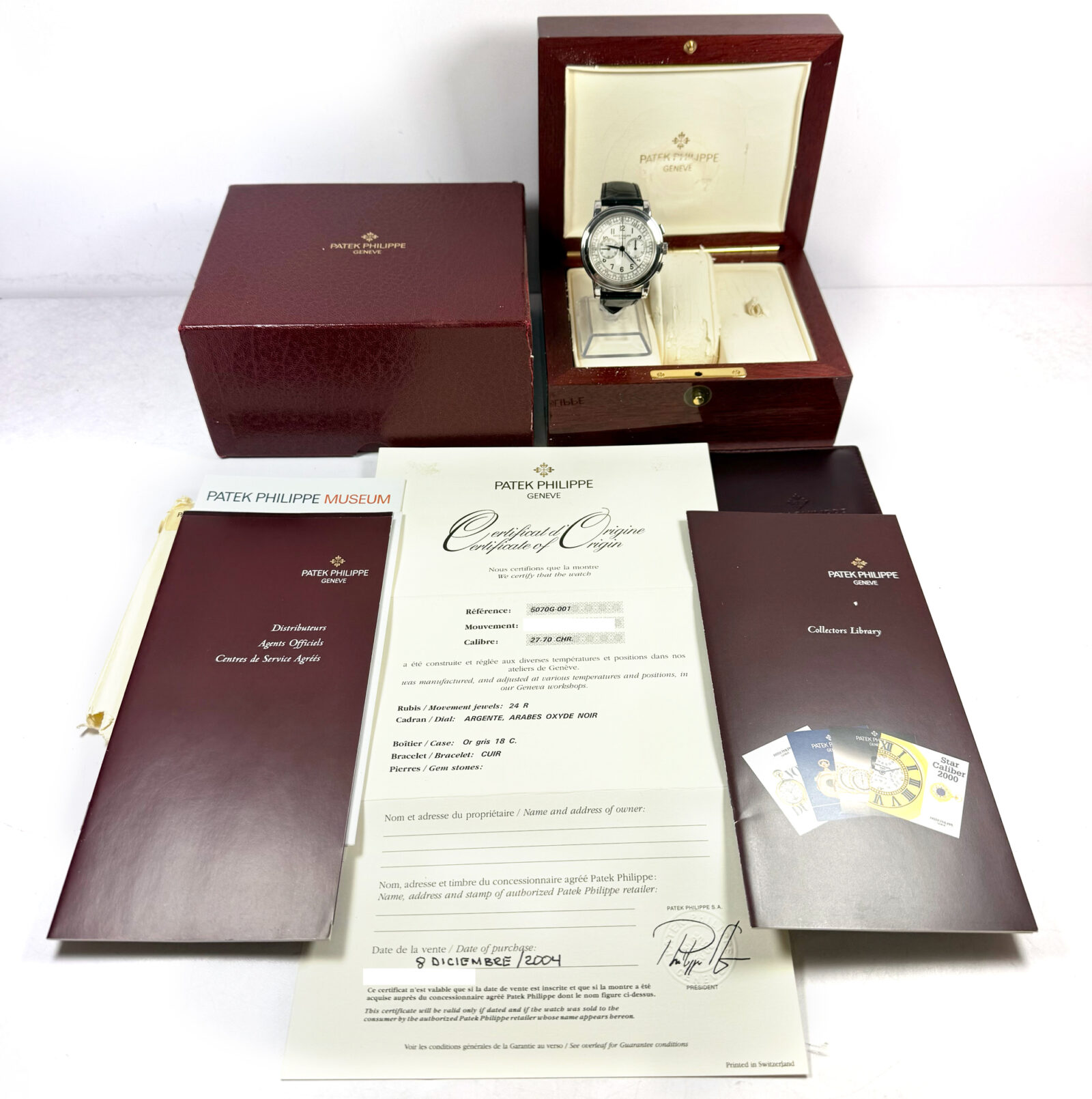 this patek philippe watch is in excellent overall condition showing some signs of surface wear consistent with preowned watches. This comes with its box, booklets, and warranty paper dated december 8th, 2004 as shown in the pictures attached. Please note the hands on the dial appear to have oxidized from time. This watch is in stock and available to ship immediately!