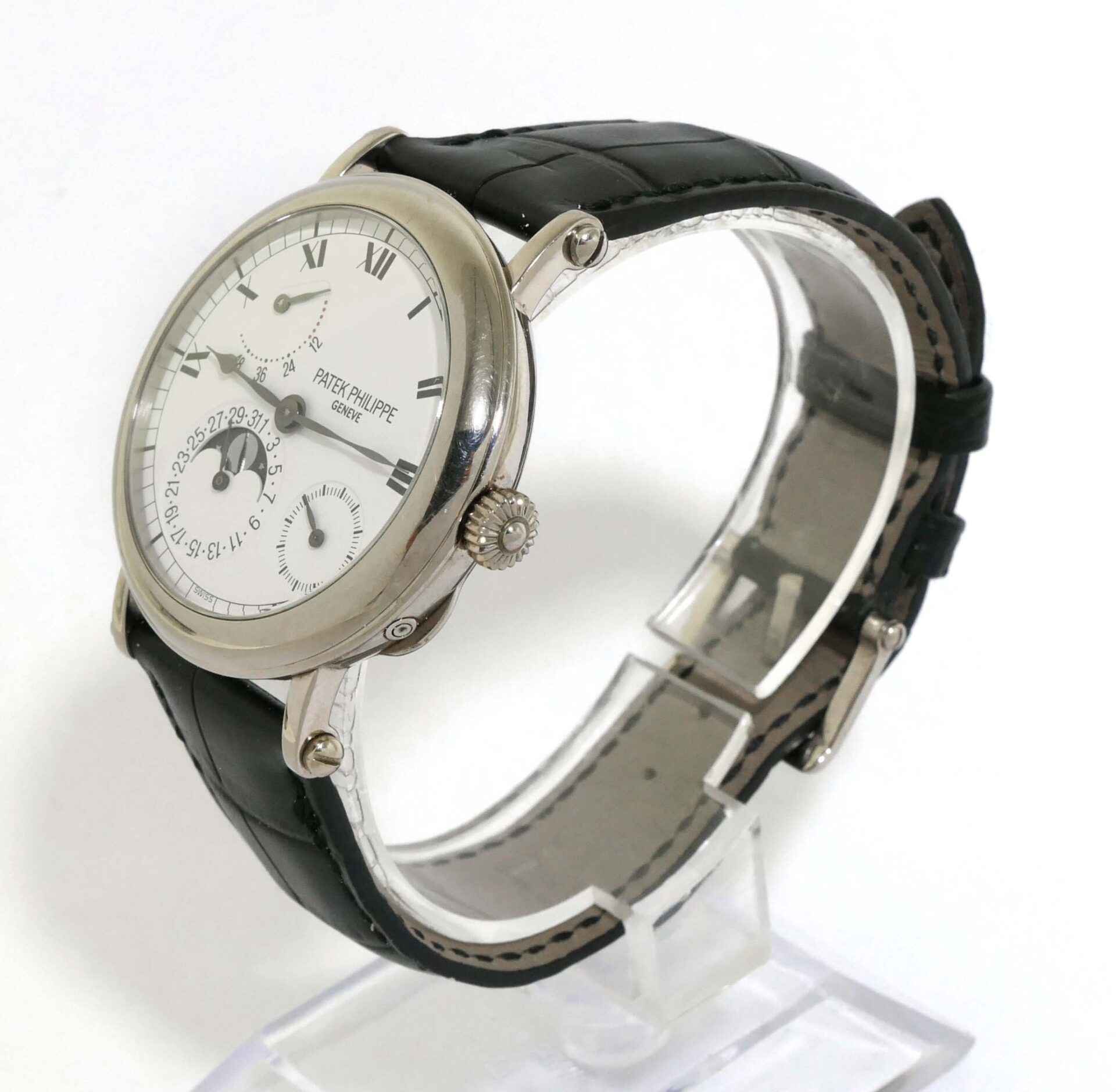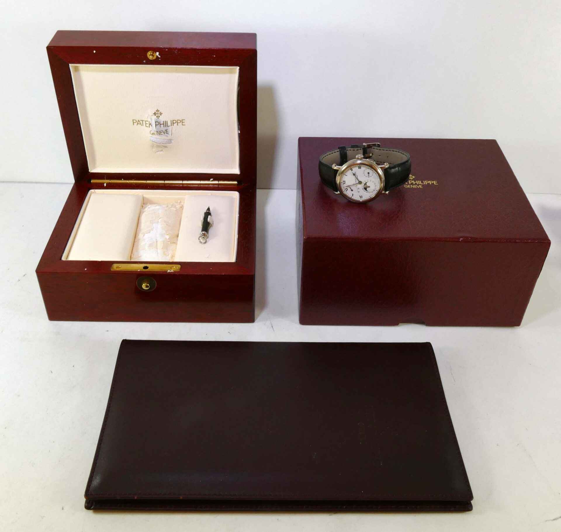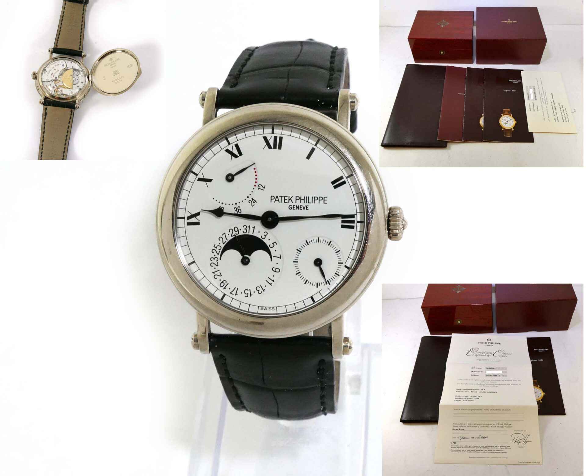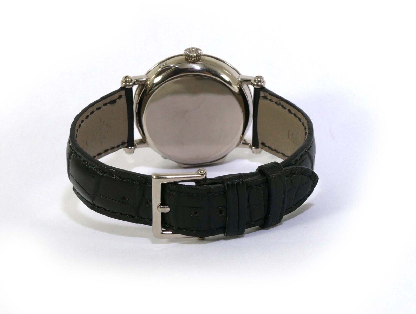Read Morethis patek philippe watch is in great overall condition and comes with its complete set of box and papers. The strap is in nice condition with lots of life left. This patek has a complicated movement, featuring a power reserve, date indicator, moon phase, and small seconds hand. the back case flips open to display its beautiful movement featuring a 22k gold micro rotor. The box cushion has some peeling/flaking, which is common for boxes from this era. Everything in the photos is included, the booklets, original certificate, and pen/pusher.