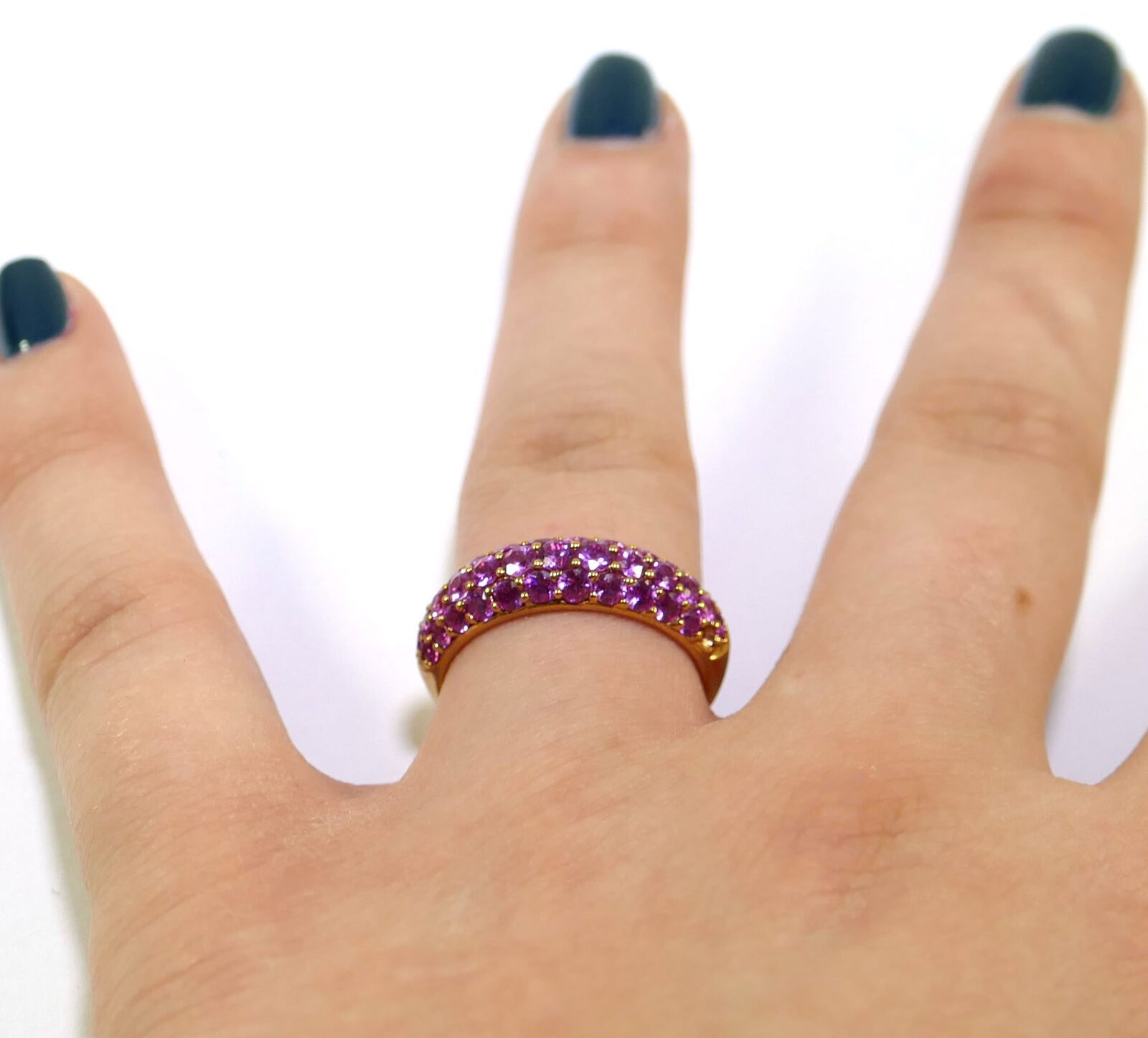 this ring is stunning, with hefty high karat yellow gold covered in pink sapphires! the yellow gold accentuates the bright pink color of the ceylon sapphire.
