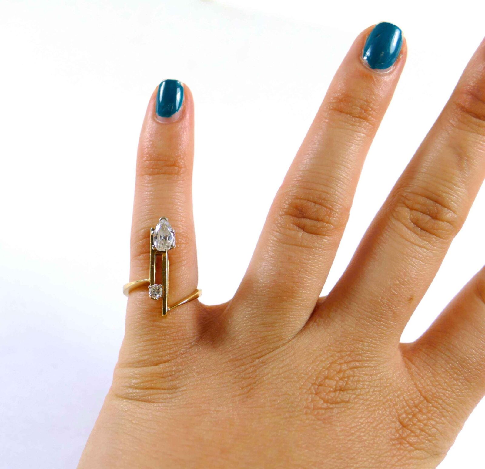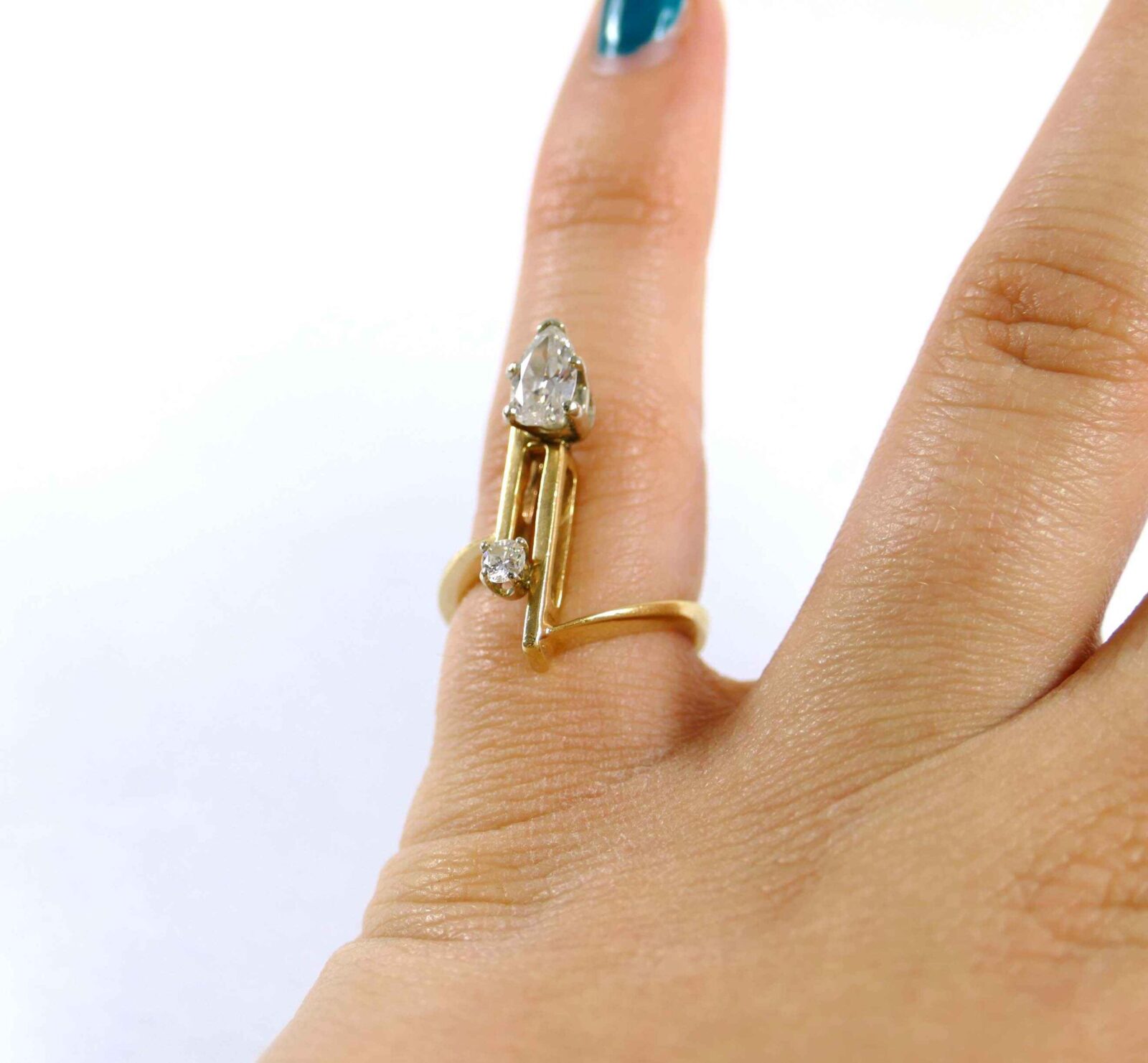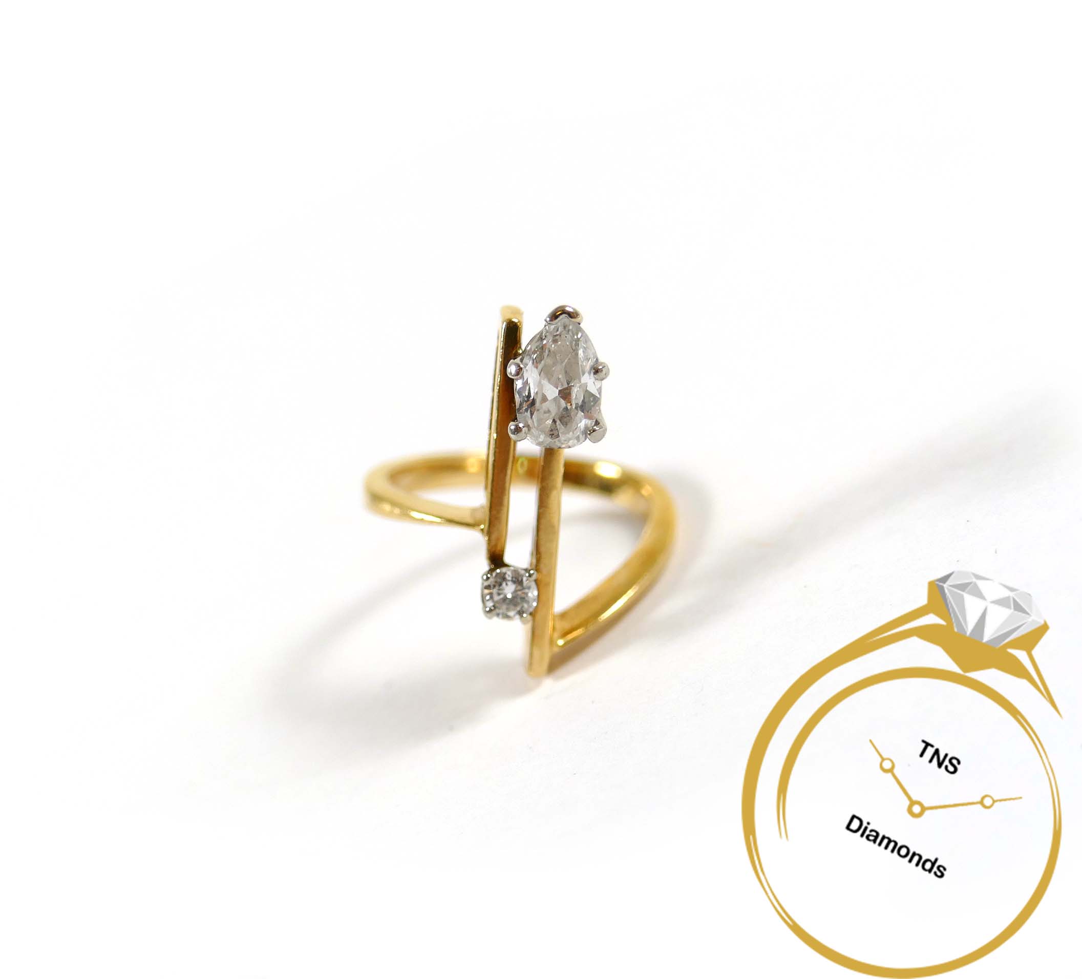 Product Description: This ring has a beautiful and unique design, with a simple and thin band but an intricate centerpiece! Two parallel pieces of 14k yellow gold, holding one pear cut diamond and one circle cut...