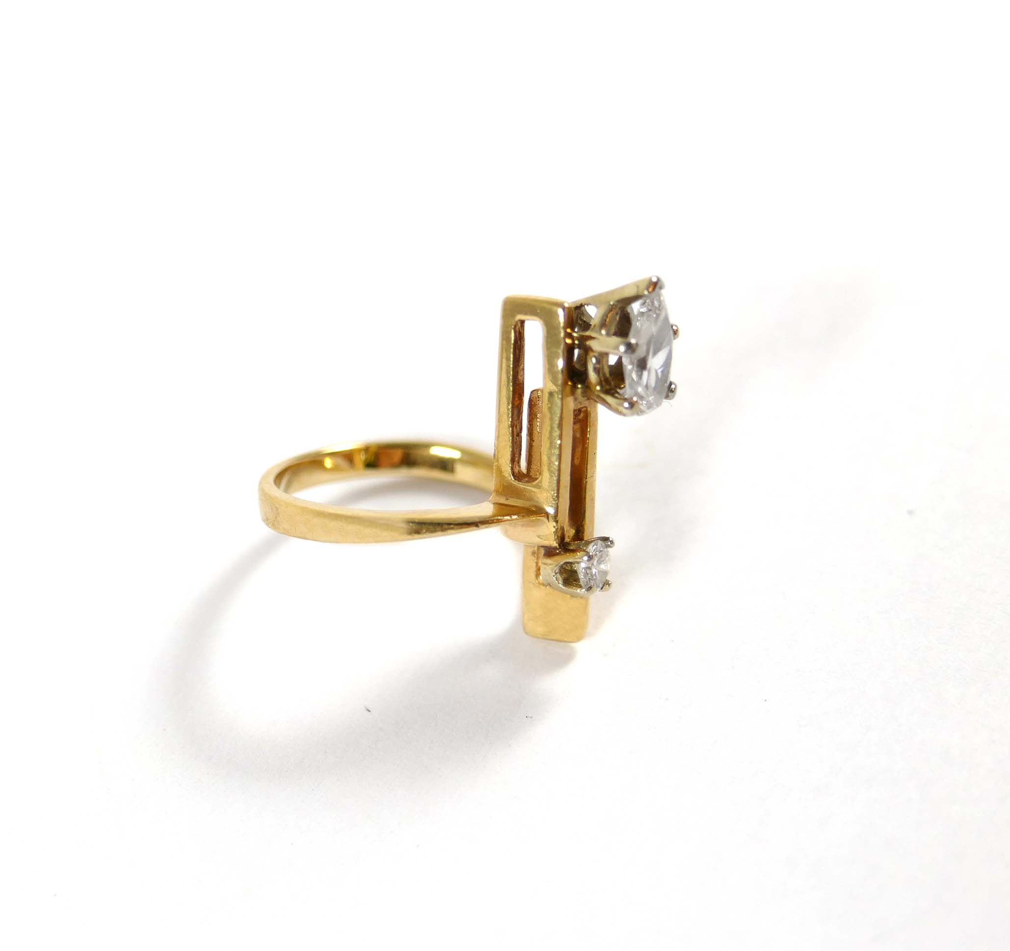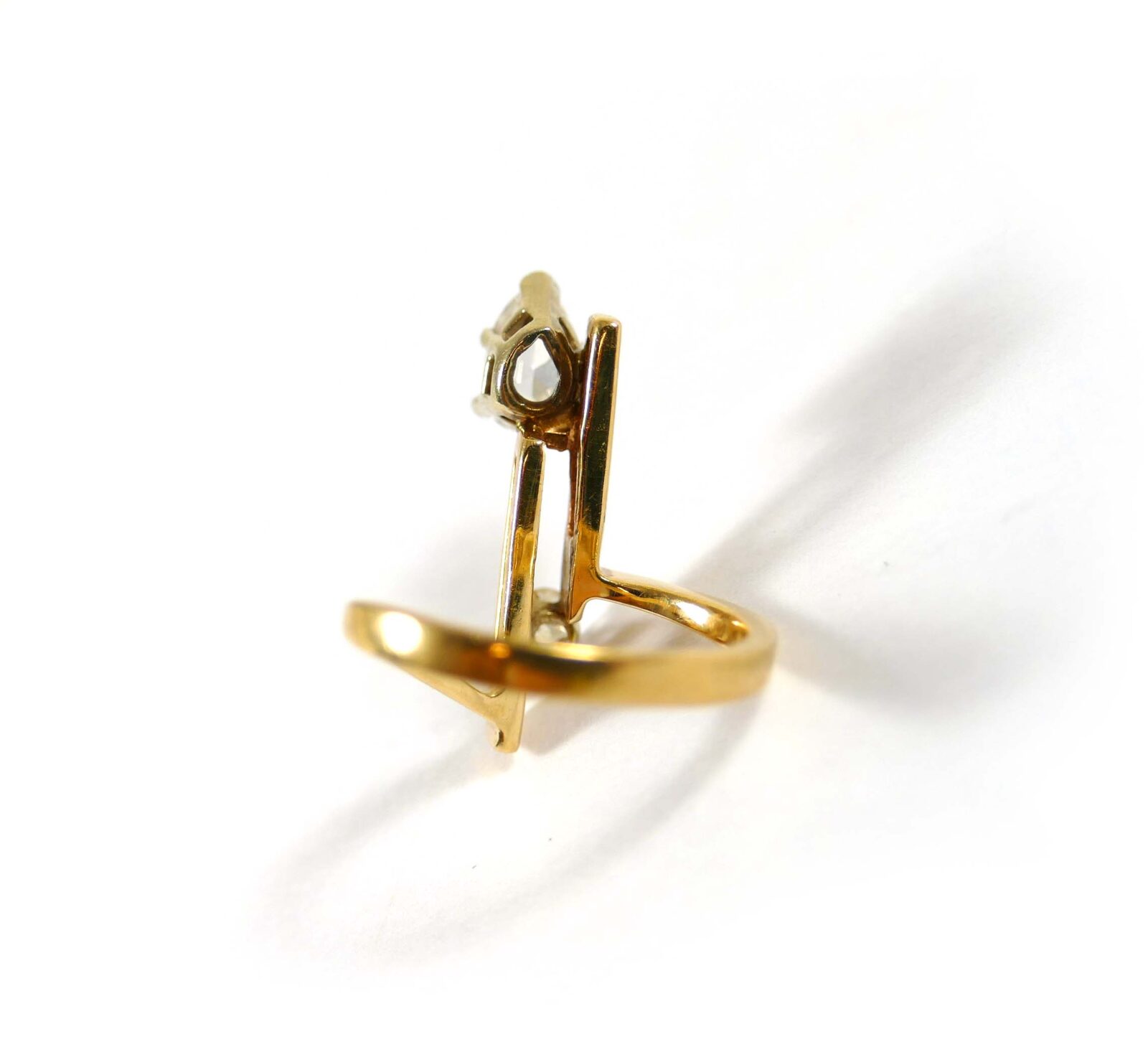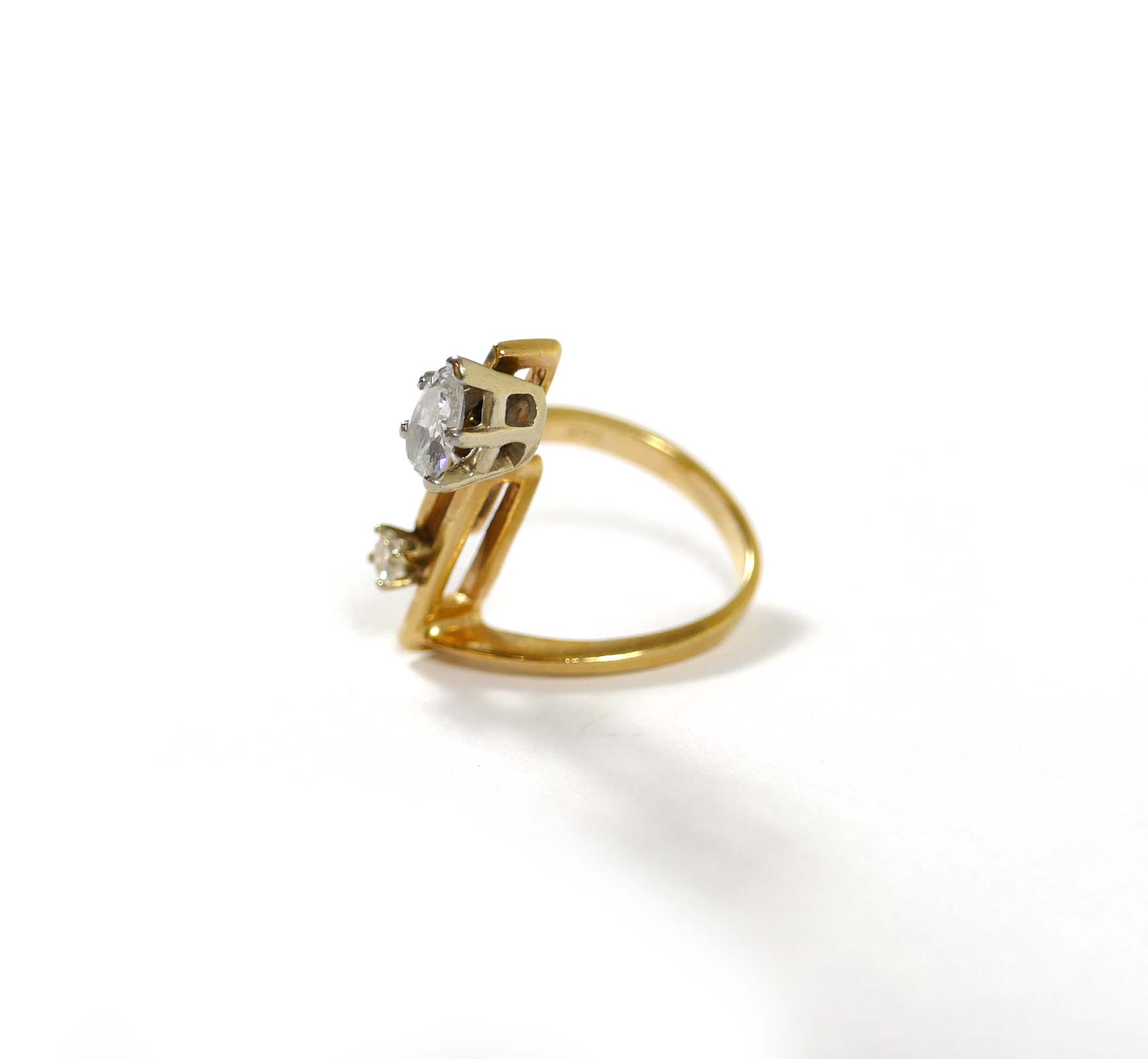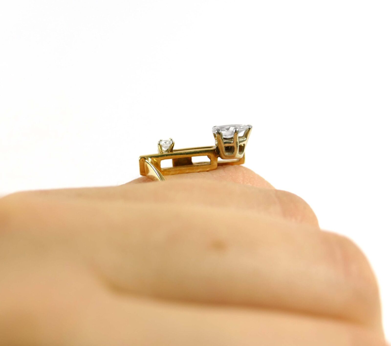 Product Description: This ring has a beautiful and unique design, with a simple and thin band but an intricate centerpiece! Two parallel pieces of 14k yellow gold, holding one pear cut diamond and one circle cut...