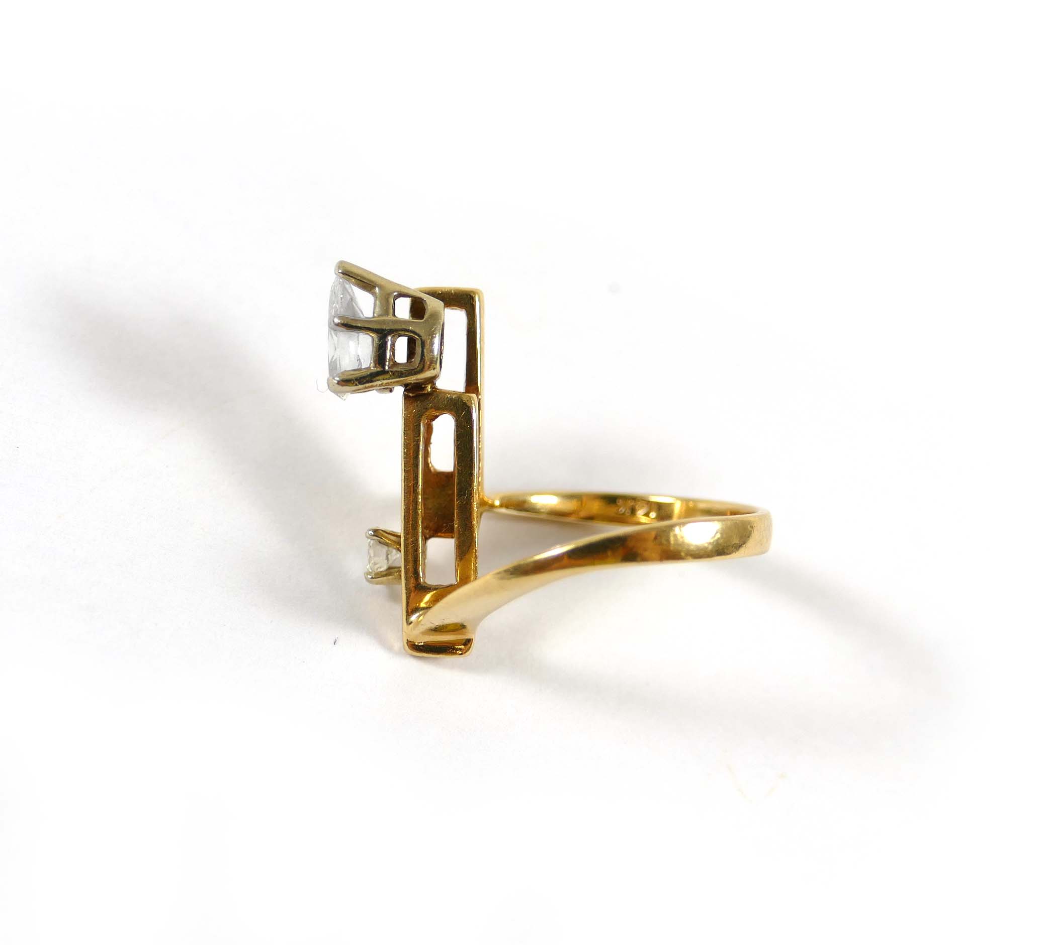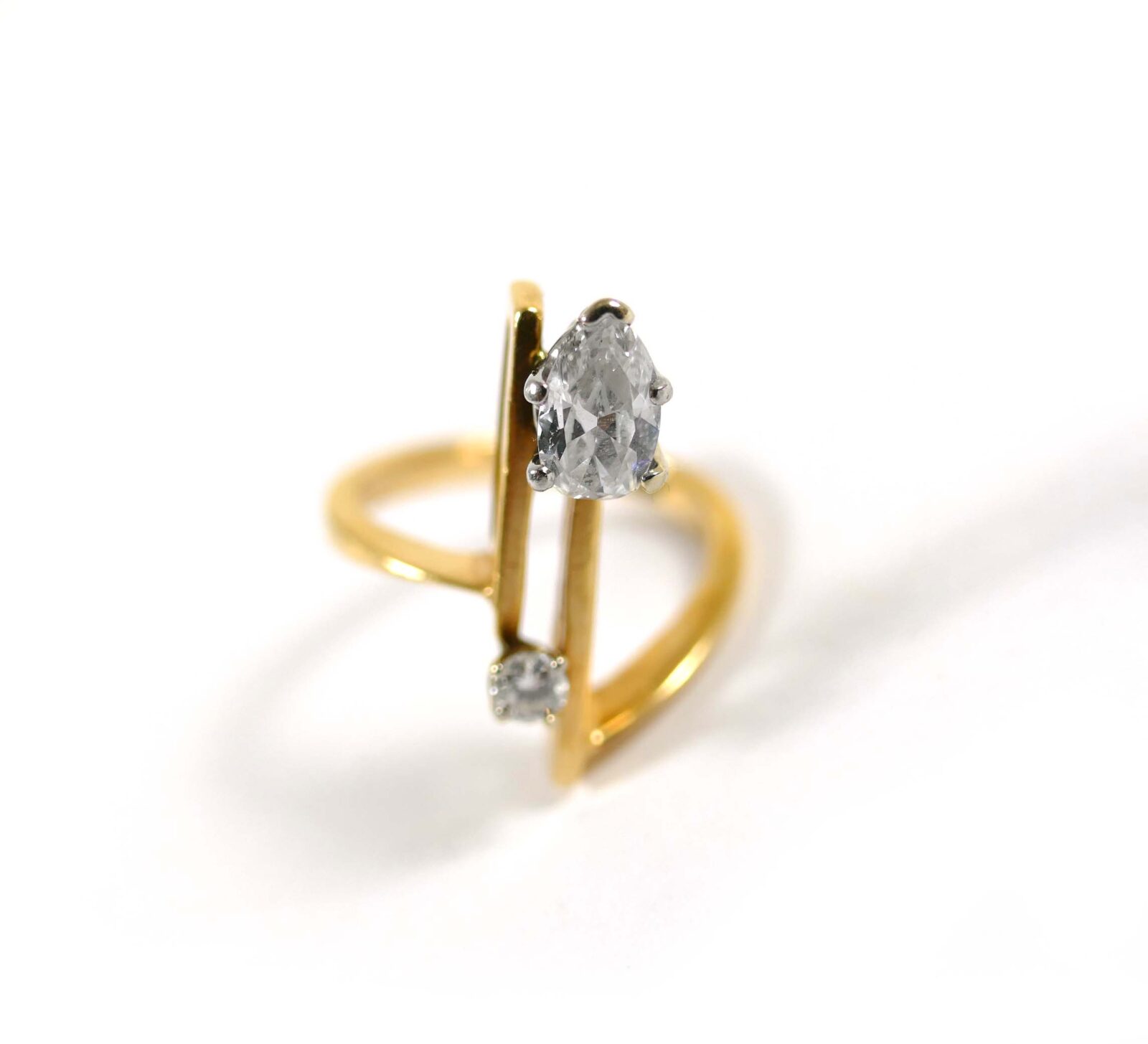 this ring has a beautiful and unique design, with a simple and thin band but an intricate centerpiece! two parallel pieces of 14k yellow gold, holding one pear cut diamond and one circle cut diamond below it. This design is unique and elegant!