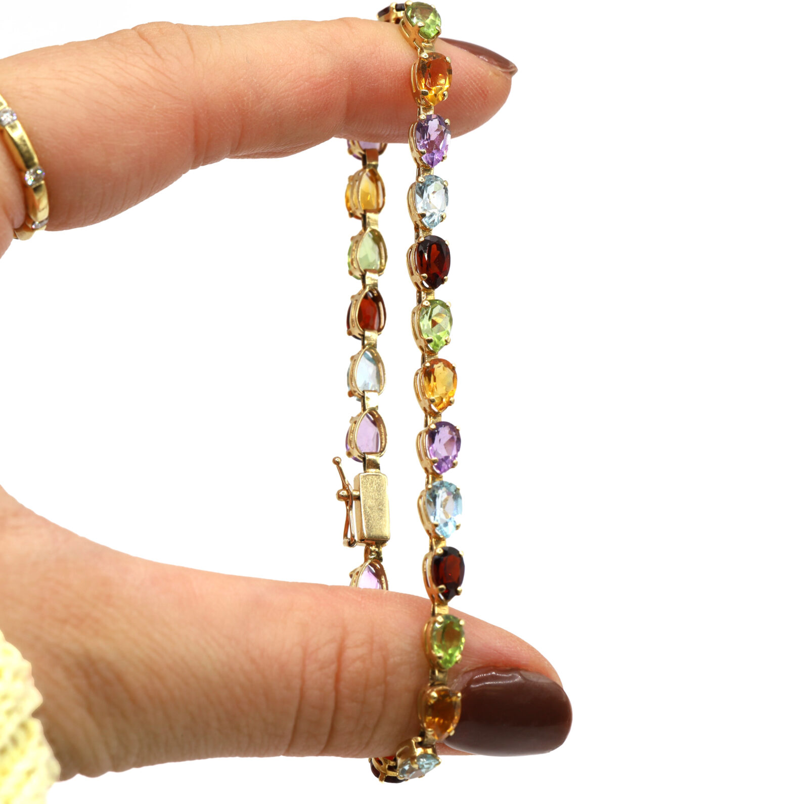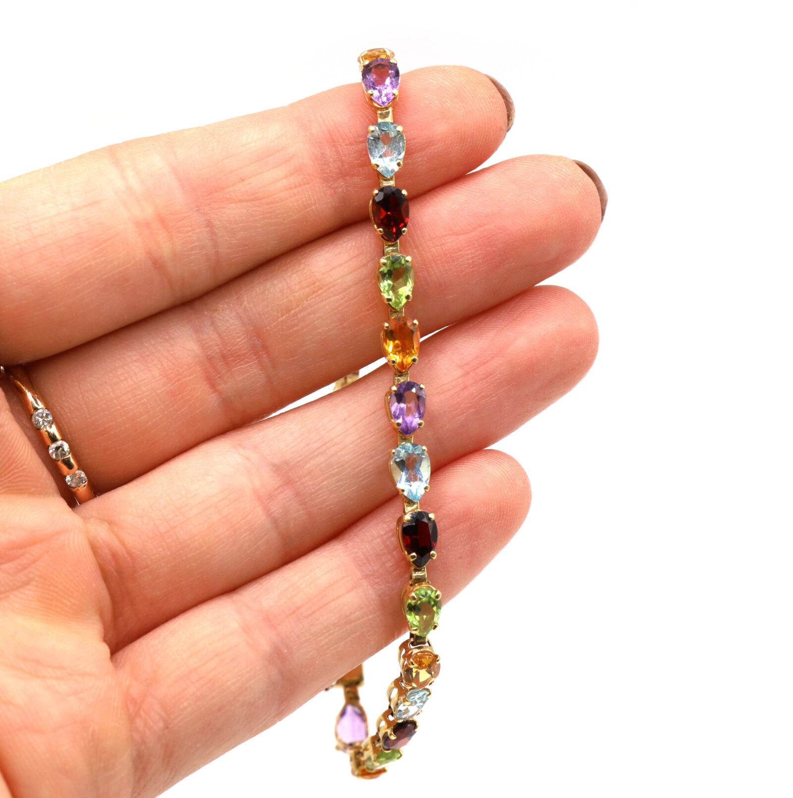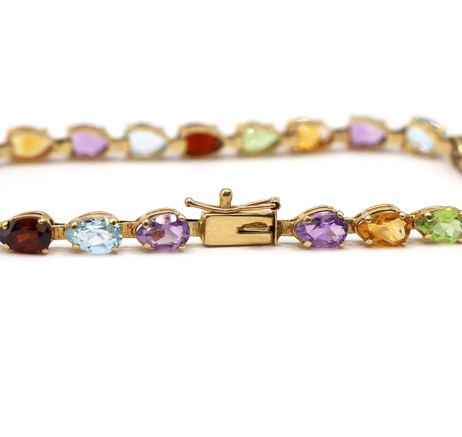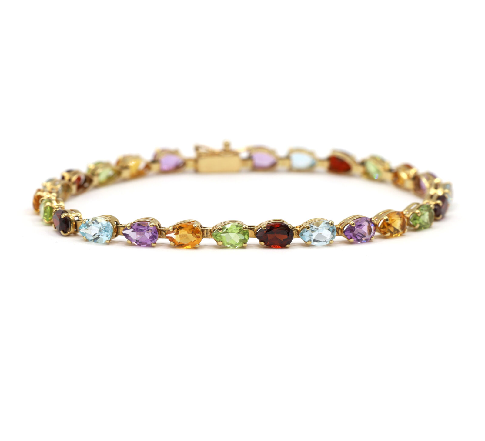 Gemstone: Amethyst, Citrine, Peridot, Garnet, Topaz Gemstone Cut: Pear Material: 14k Yellow Gold Length: 7 Inches Width: 4mm Weight: 6.5 Grams