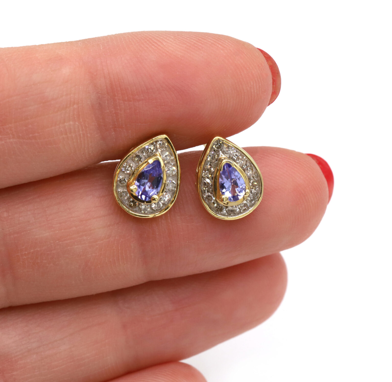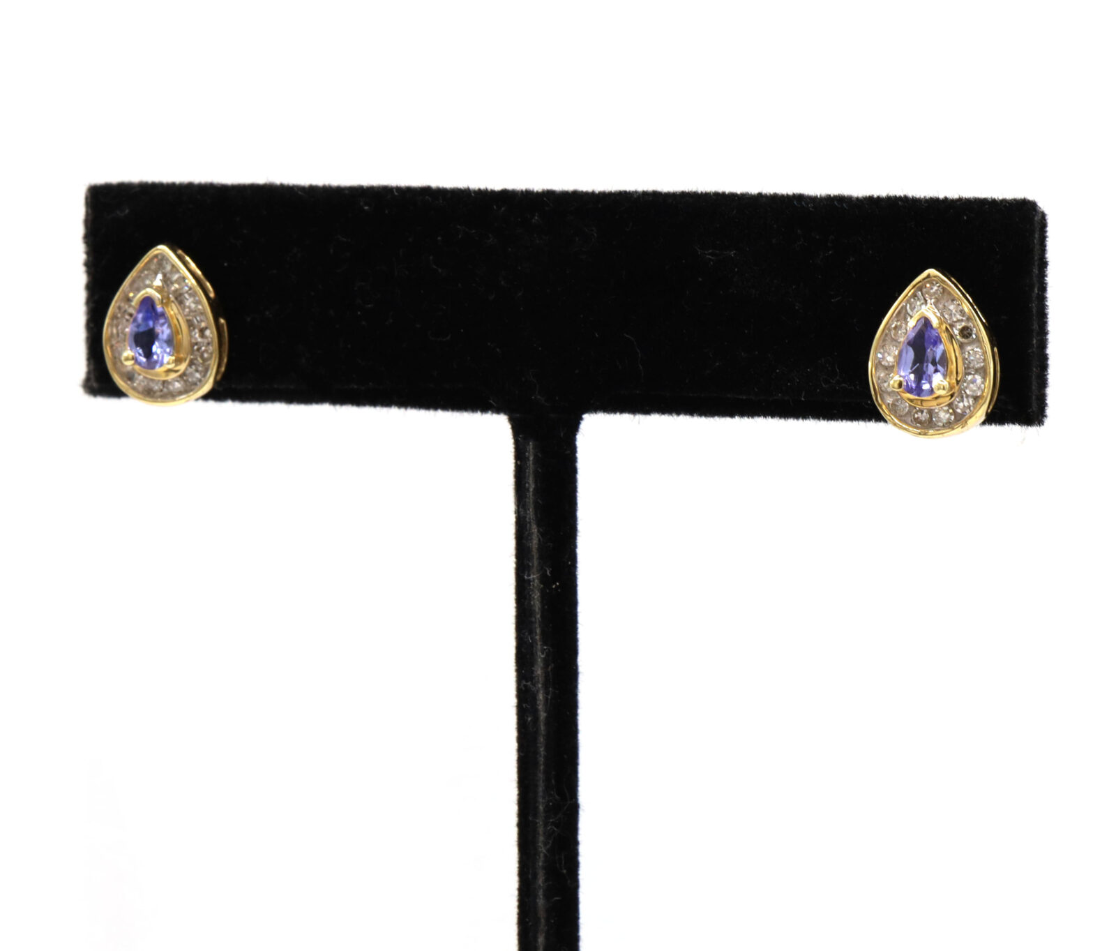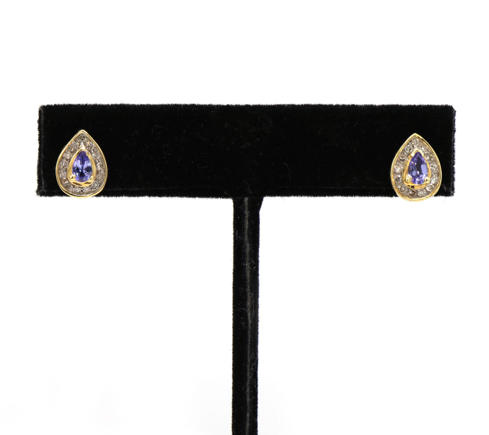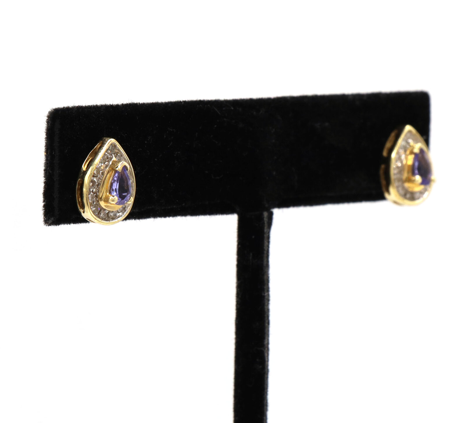 Material: 14k Yellow Gold Stone: Tanzanite & Diamond Earring Measurement: 10.7 x 8 mm Tanzanite Cut: Pear Tanzanite Measurements: 5.6mm Total Diamond Weight: 0.30 Carat Clarity: SI1 Color: G Weight: 2.02 Grams