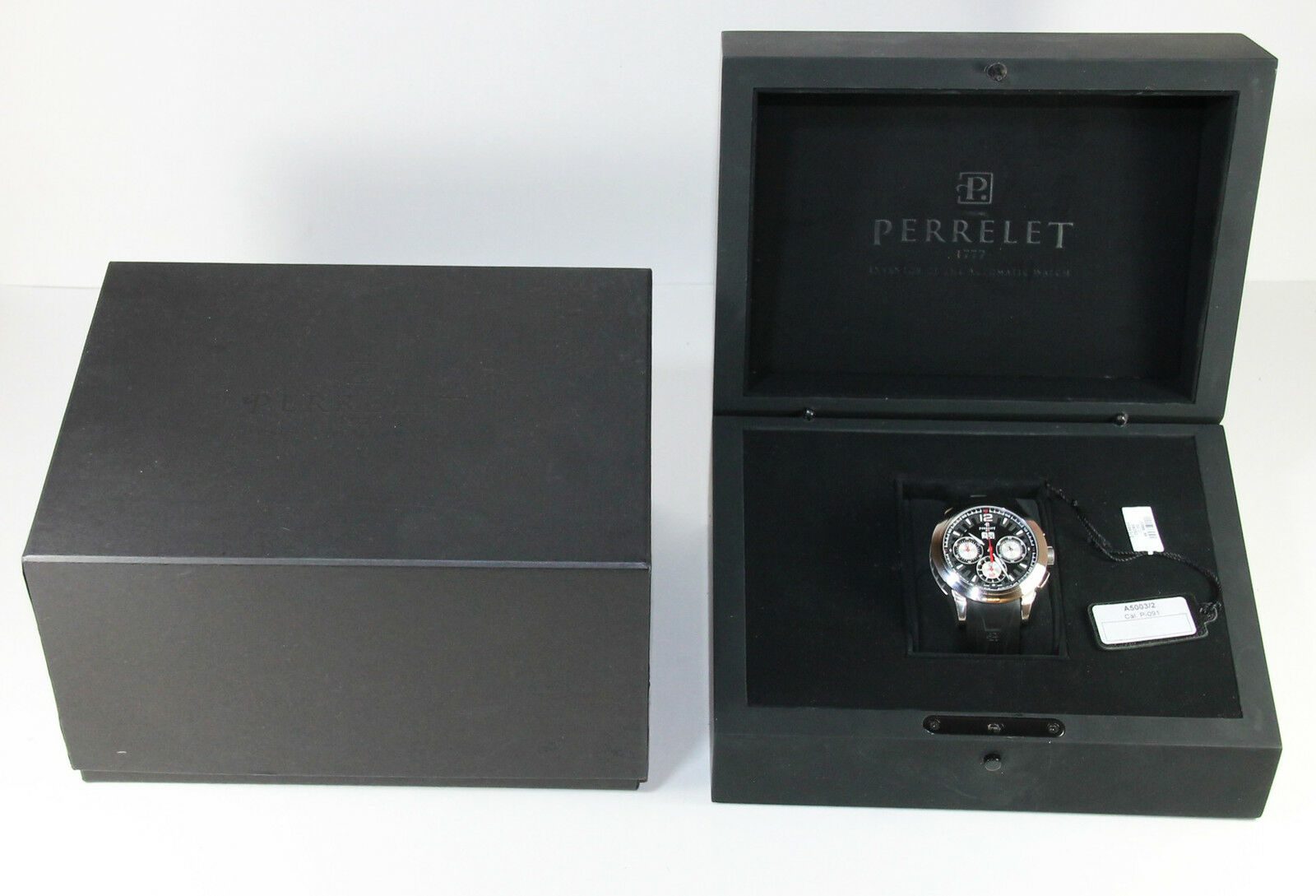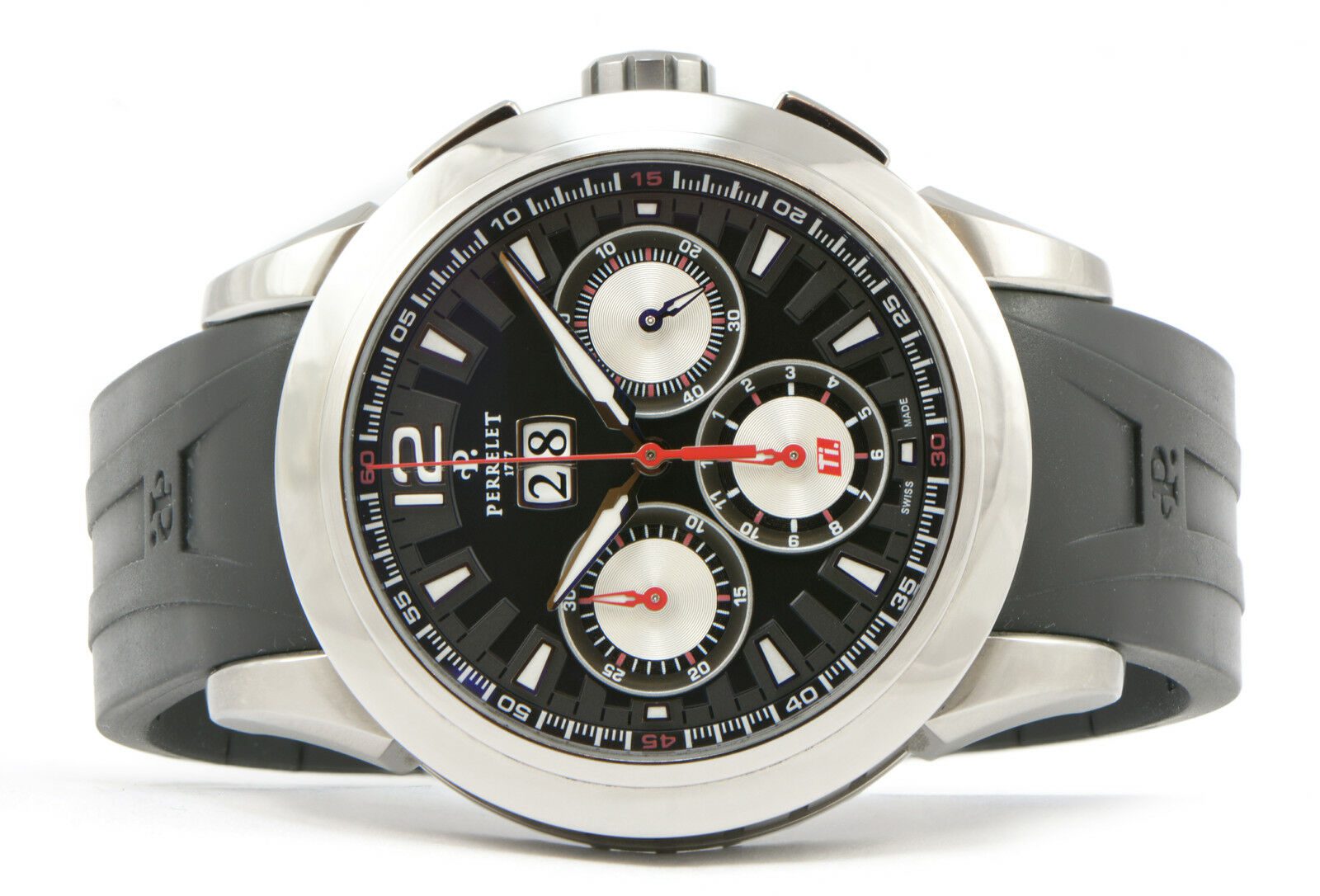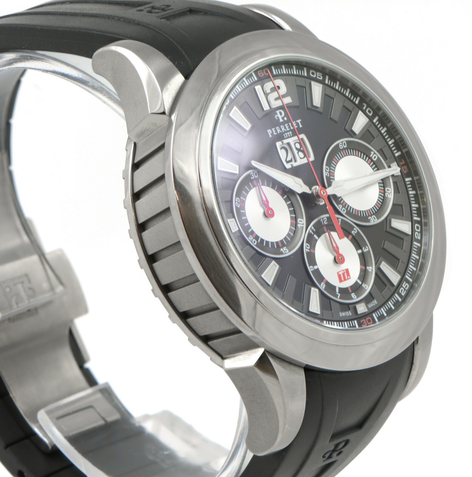 condition: pre-owned gender: men’s watches band: rubber deployment watches box: original box watches brand: perrelet watches case diameter (mm): 43mm watches caseback: exhibition watches crystal: sapphire watches dial: black watches functions: date/chronograph watches movement: automatic watches papers: no original papers watches series: titanium big date watches warranty: 12-month tns diamonds warranty